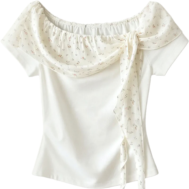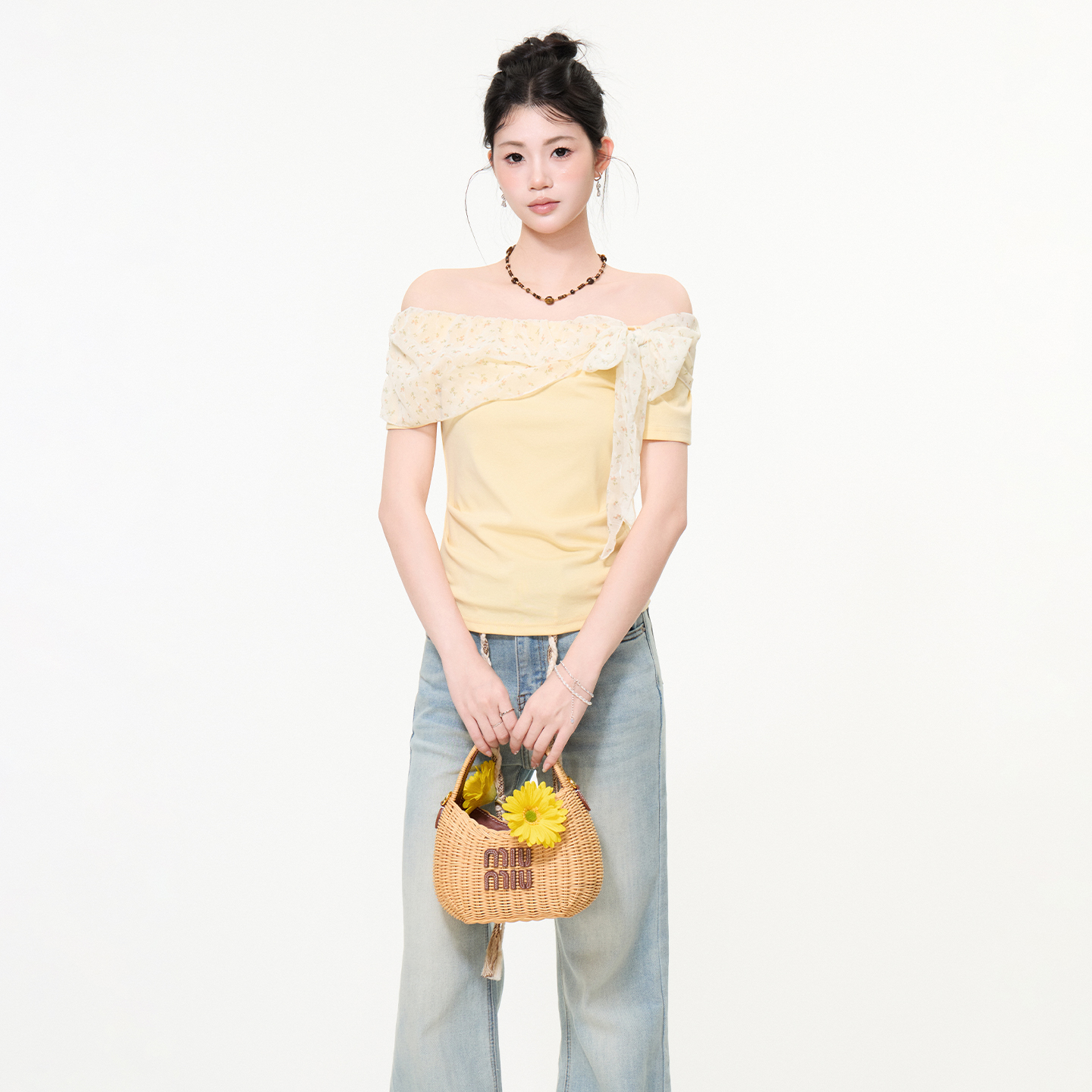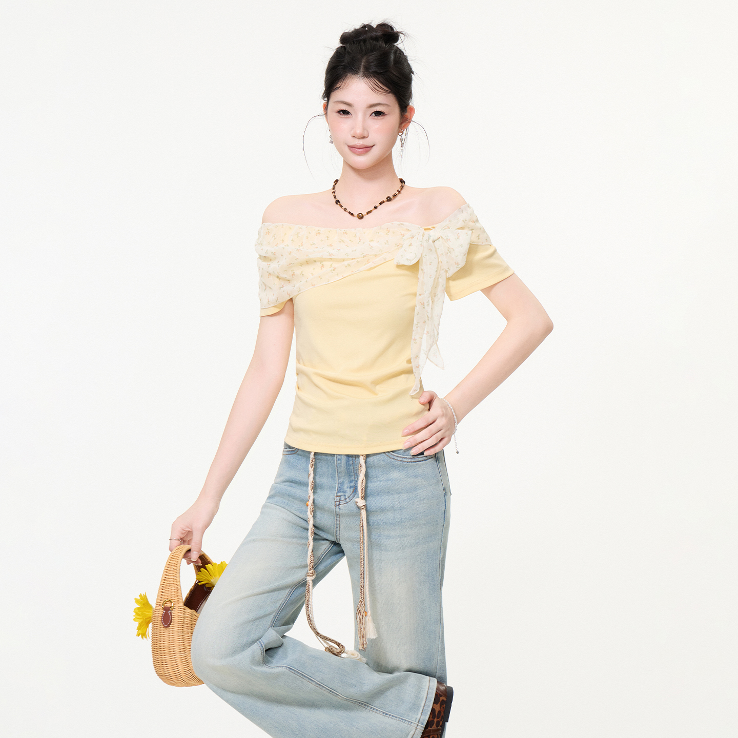 실사 정가 우유 황색 도파민 나비 매듭 오프숄더 반팔 티셔츠 여성 여름 섹시함 오프숄더 작은 맨위