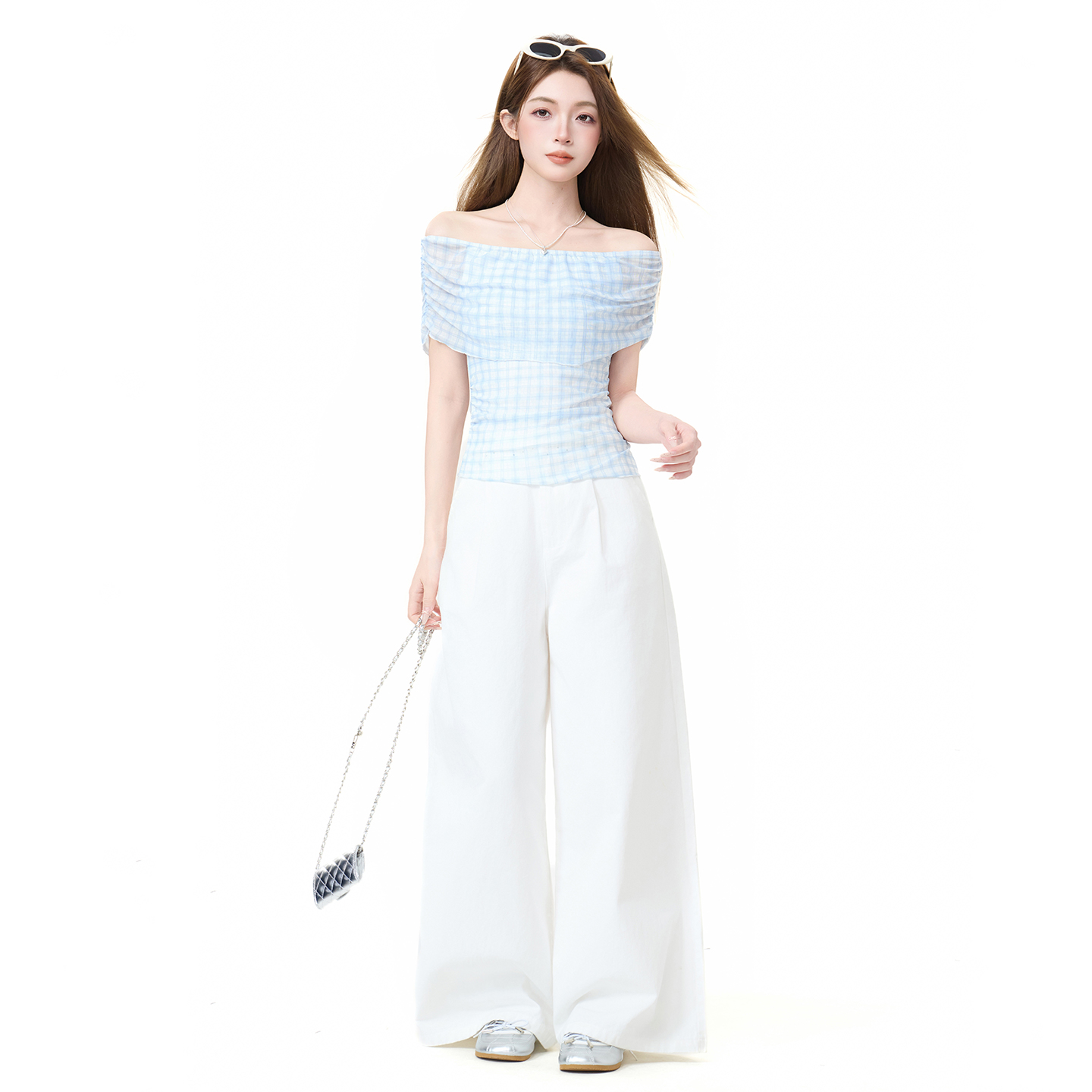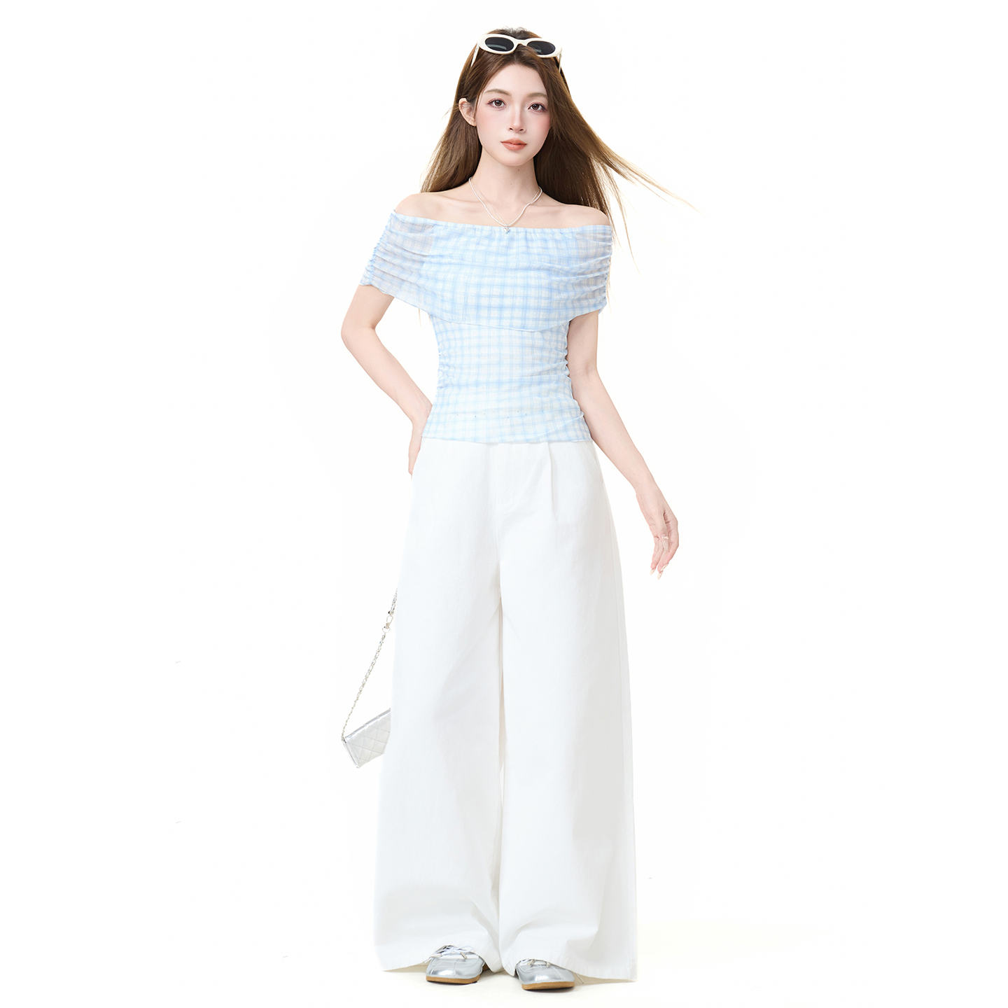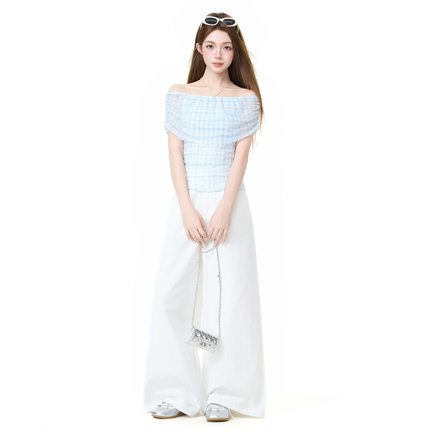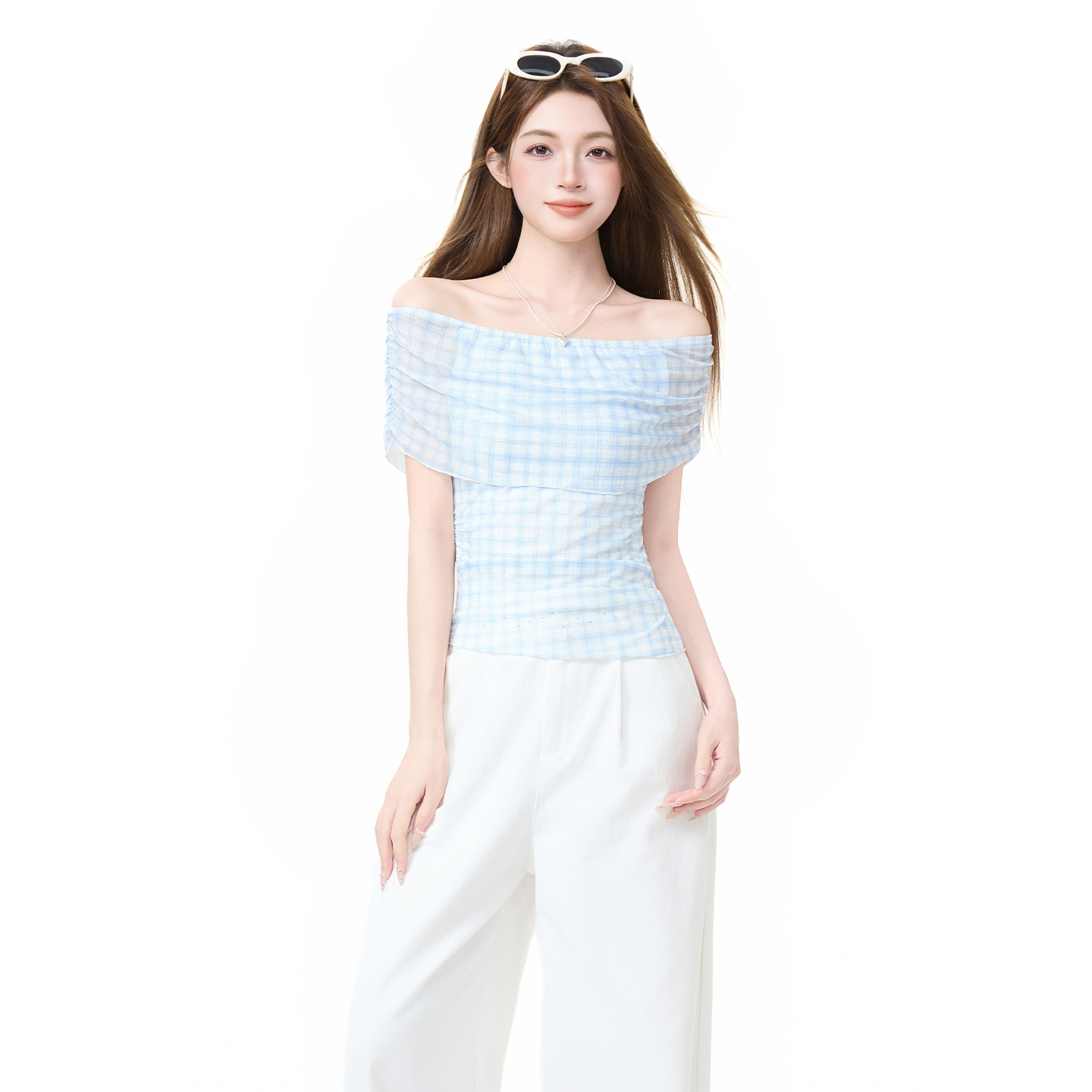 실사 정가 체크무늬 오프숄더 튜브탑 티셔츠 여성 여름 한 부서 몸매 가꾸기 슬림해 보이는 불규칙 디자인 센스 맨위