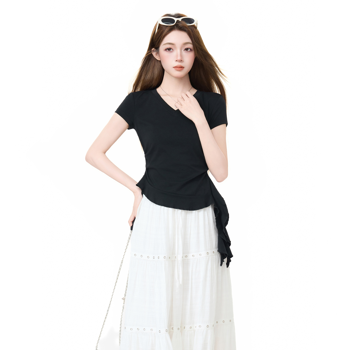 실사 정가 디자인 센스 V넥 마이크로 ~을 통해 얇은 스타일 긴팔 티셔츠 여성 여름 나팔 소매 스트랩 자외선 차단 블라우스 맨위