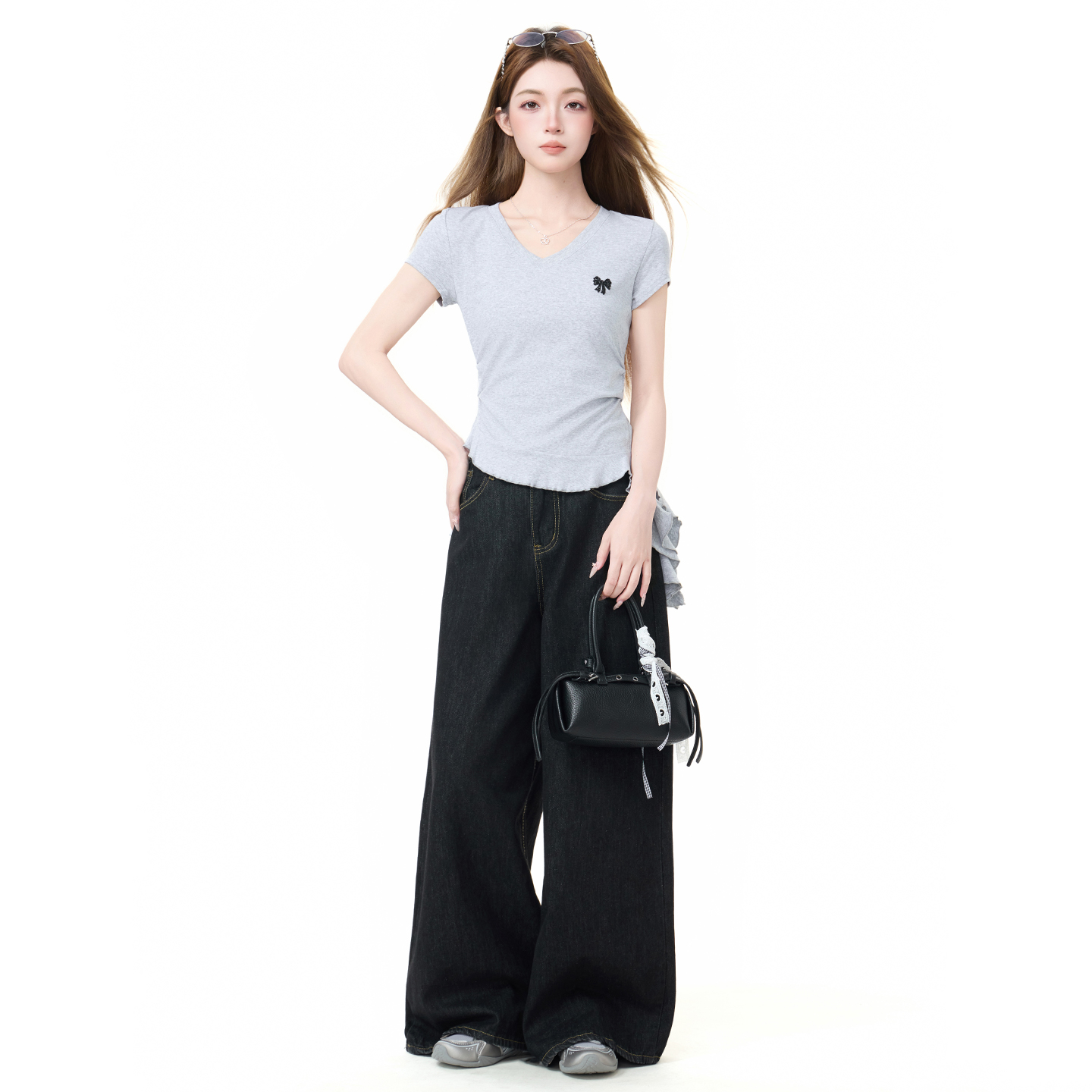실사 정가 회색 V넥 불규칙 긍정적 인 어깨 반팔 티셔츠 여성 여름 디자인 센스 작은 대중 몸매 가꾸기 허리 수축 맨위