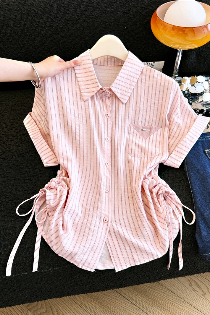 POLO 칼라 스트라이프 쉬폰 반팔 여성 셔츠 여름 디자인 센스 펌프 로프 품격 달콤함 프랑스식 쇼트 스타일 작은 맨위