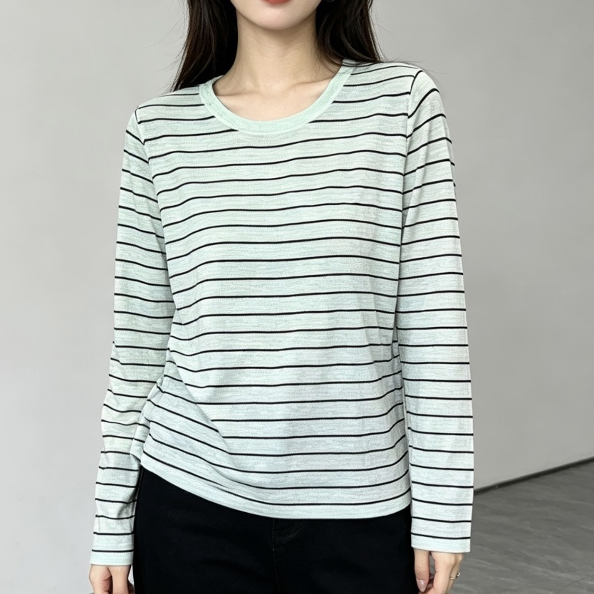 실사 한 부서 봄 여름 라운드 넥 루즈핏 대 핏 스타일 스트라이프 니트 스웨터 초박형 티셔츠 여성 셔츠 긴팔 자외선 차단 의류