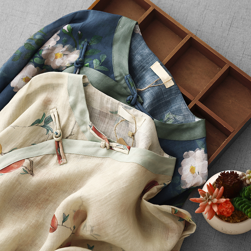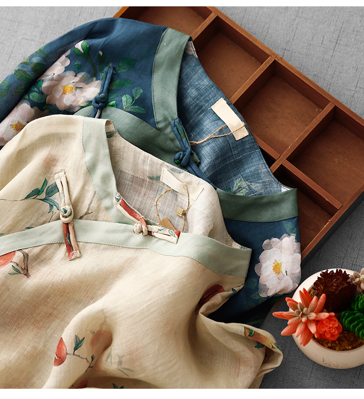 9024 재고 있음 2026 여름 새로운 면 린넨 국풍 보라색 뒤 푸 프린트 라운드 넥 롱 코트 단추 차 서비스