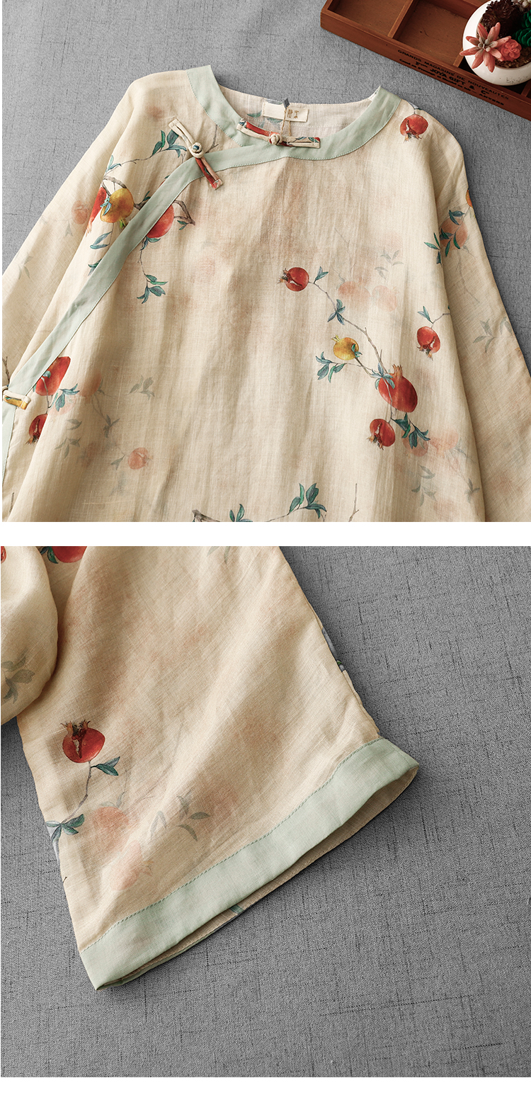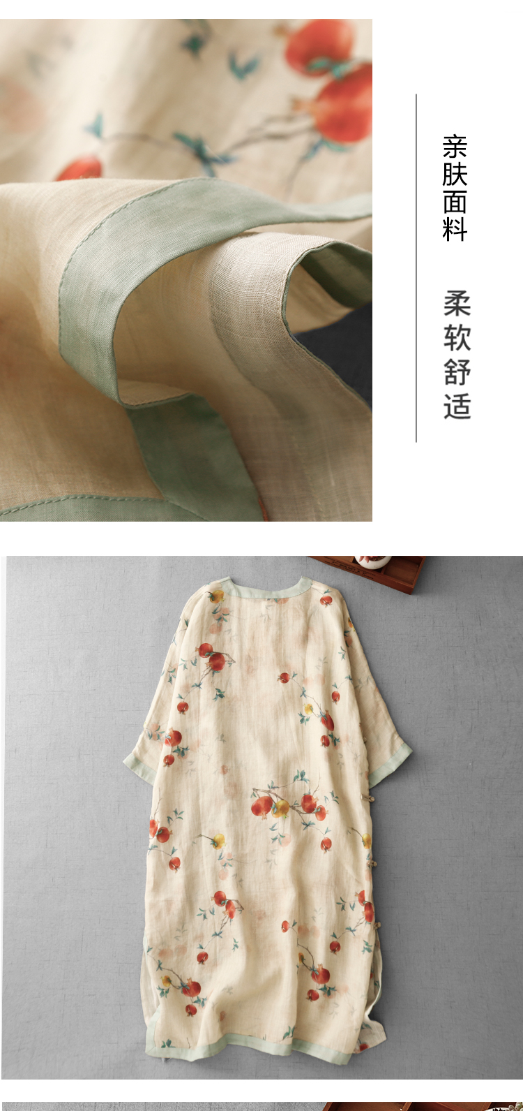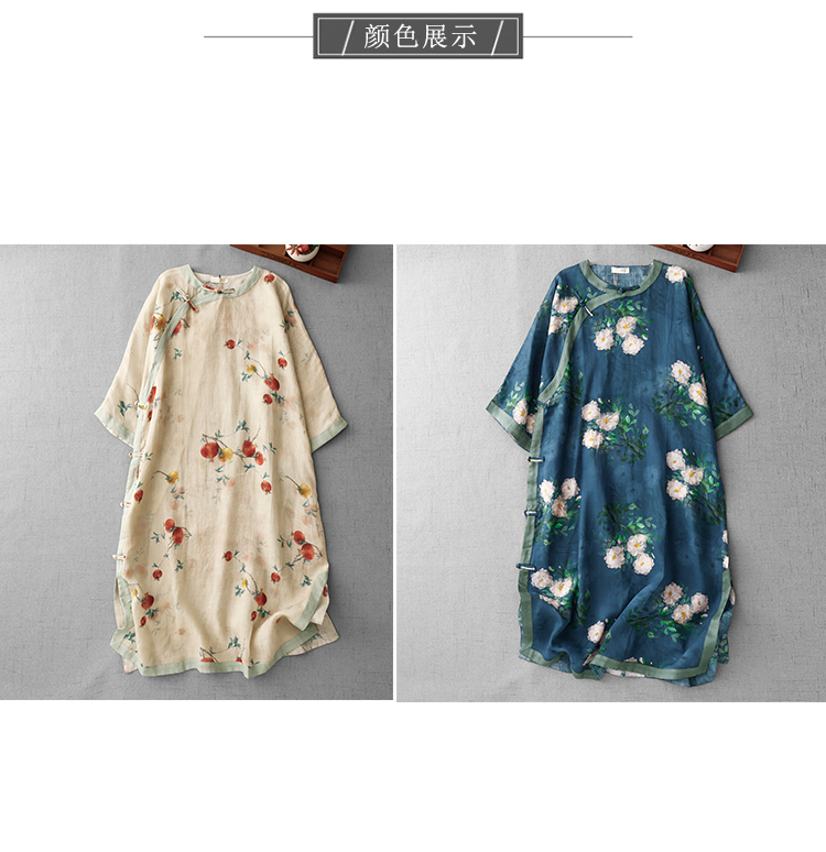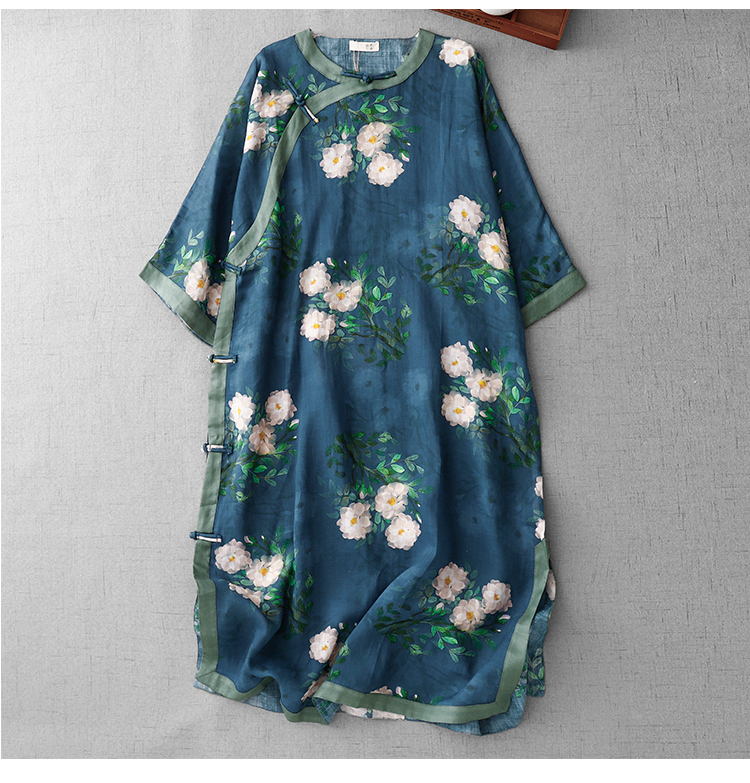 3588 실사 2025 여름 새로운 면 린넨 마이크로 향기로운 블루 석류 프린트 라운드 넥 롱 코트 단추 차 서비스
