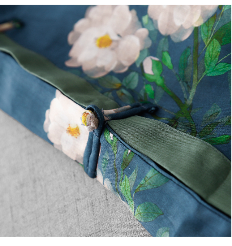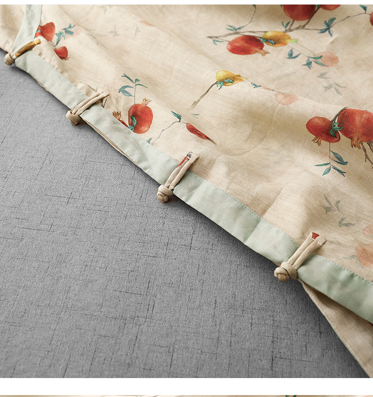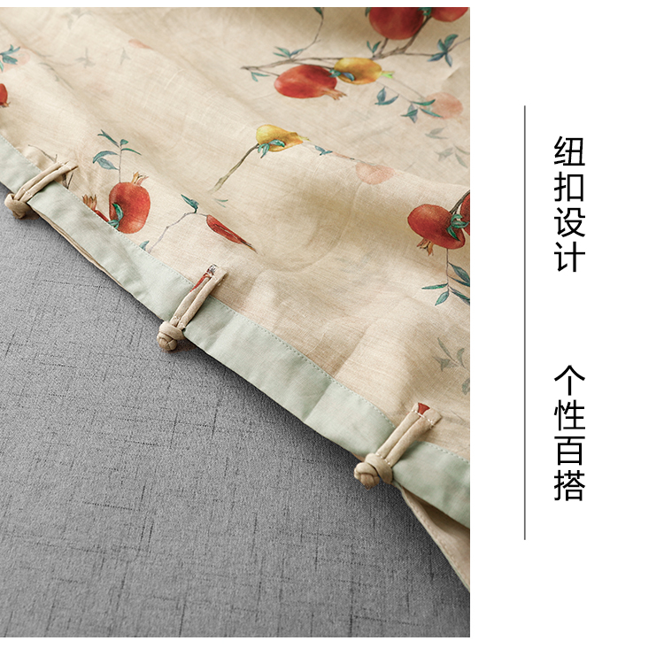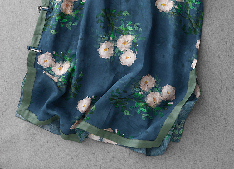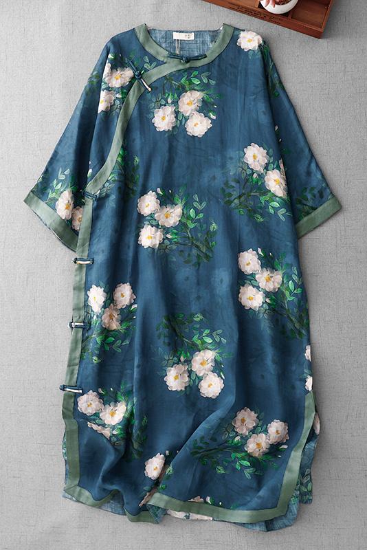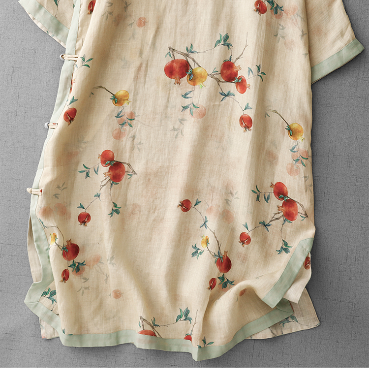 3588 실사 2025 여름 새로운 면 린넨 마이크로 향기로운 블루 석류 프린트 라운드 넥 롱 코트 단추 차 서비스