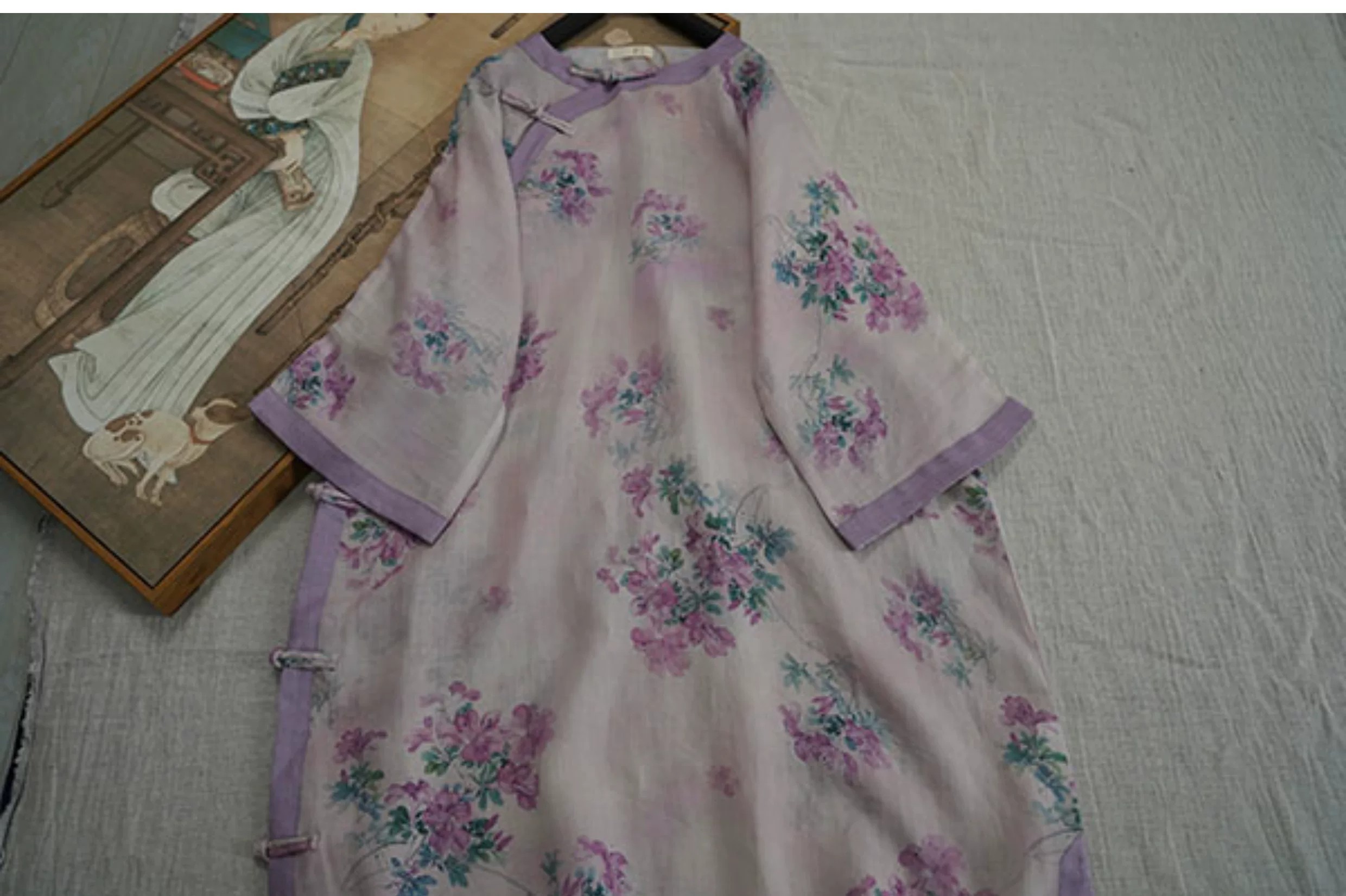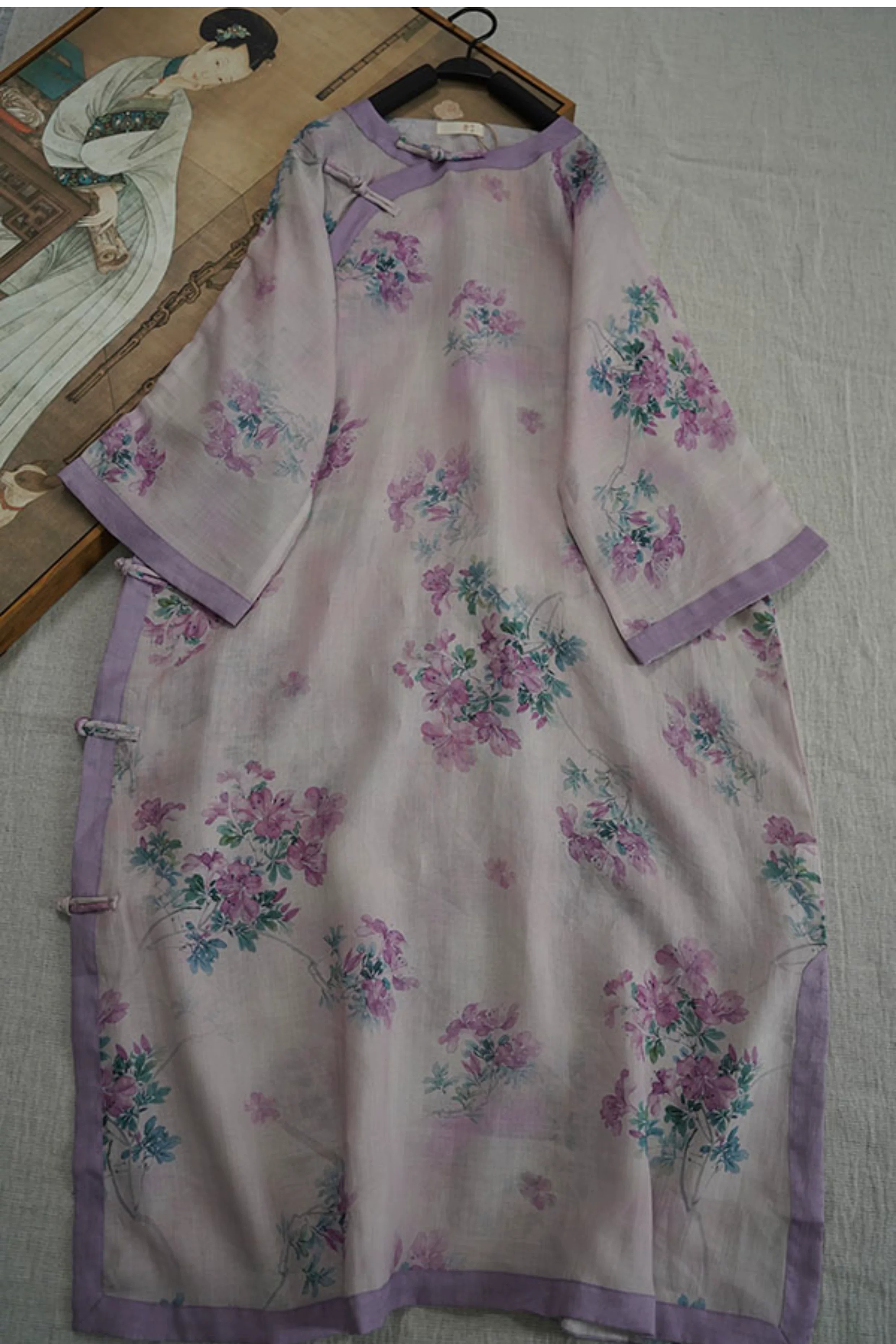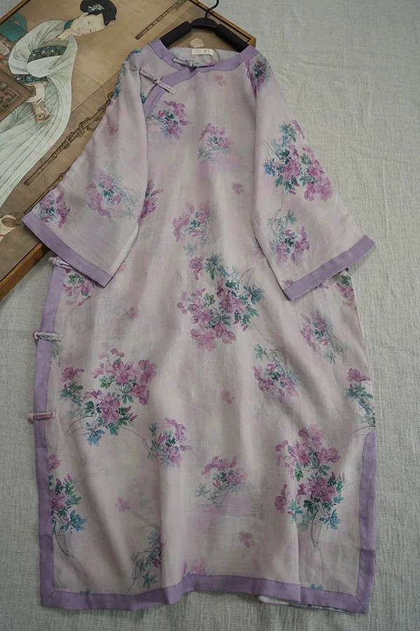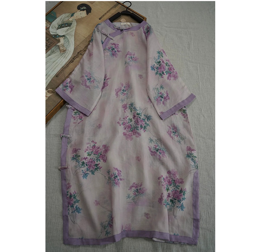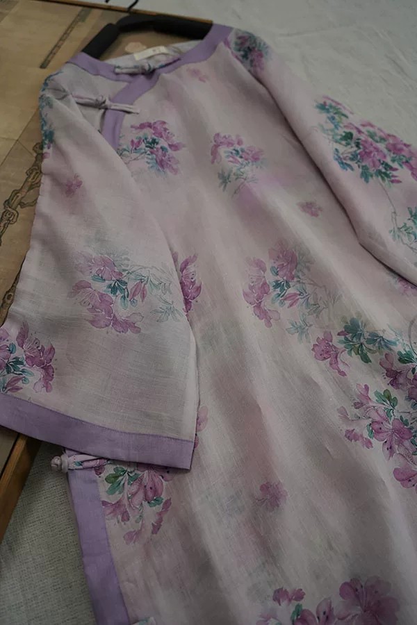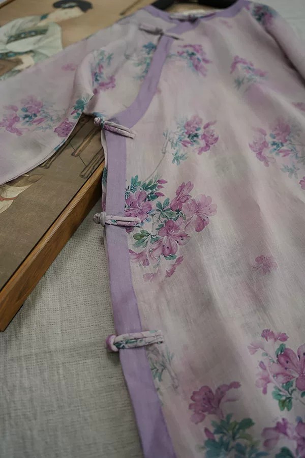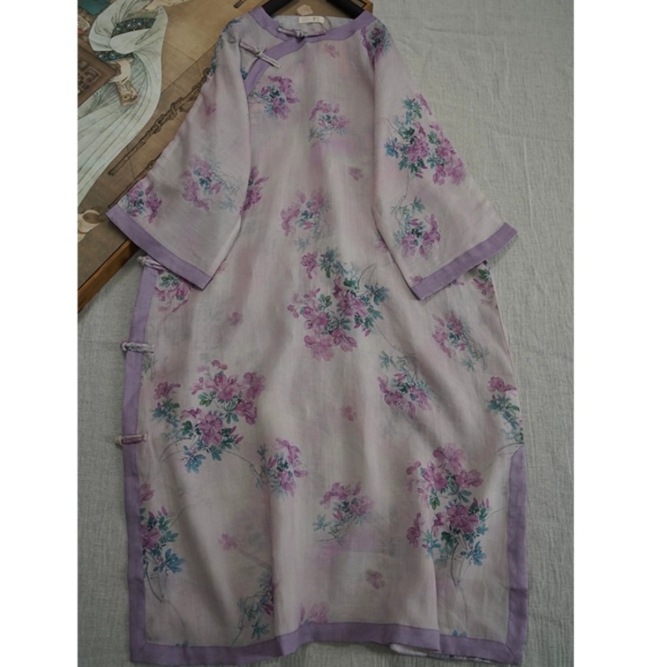 9024 재고 있음 2026 여름 새로운 면 린넨 국풍 보라색 뒤 푸 프린트 라운드 넥 롱 코트 단추 차 서비스