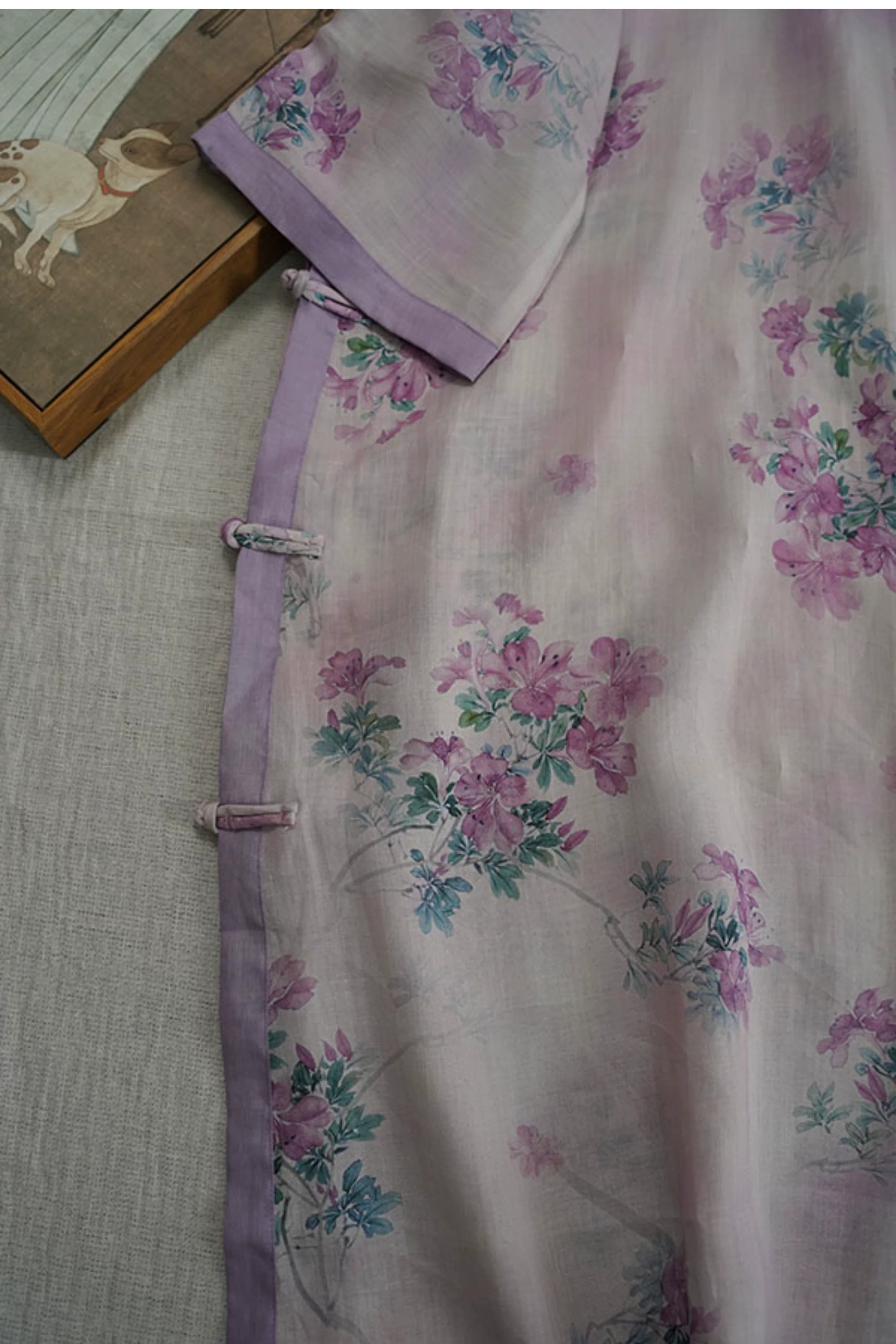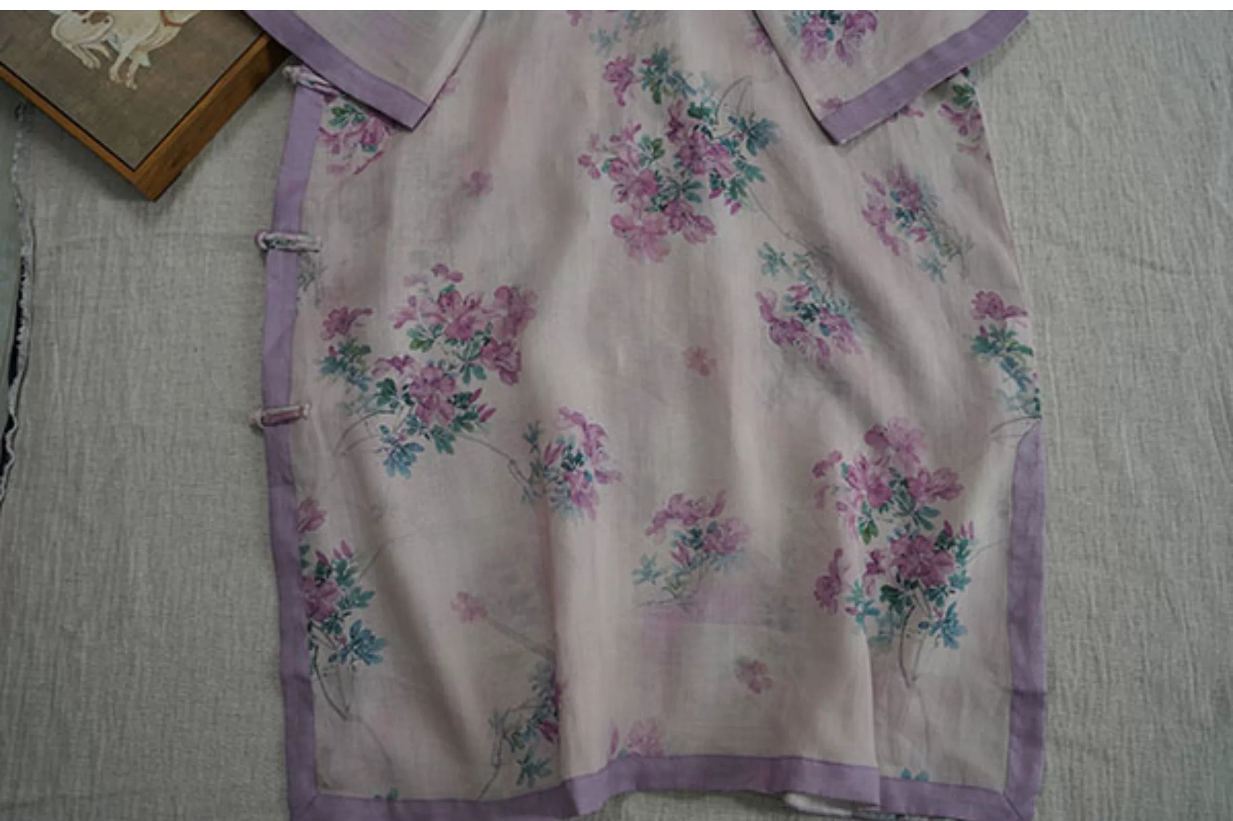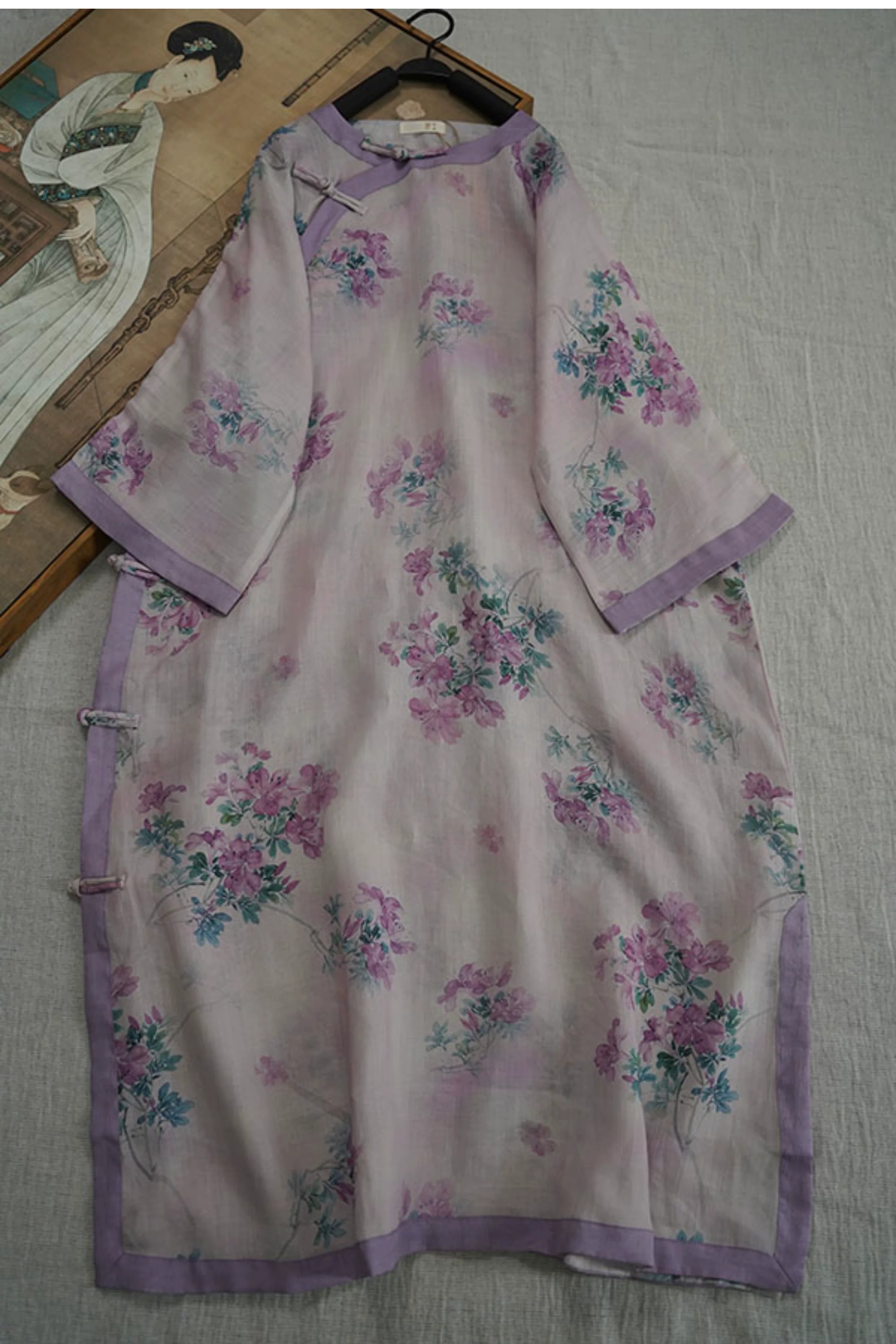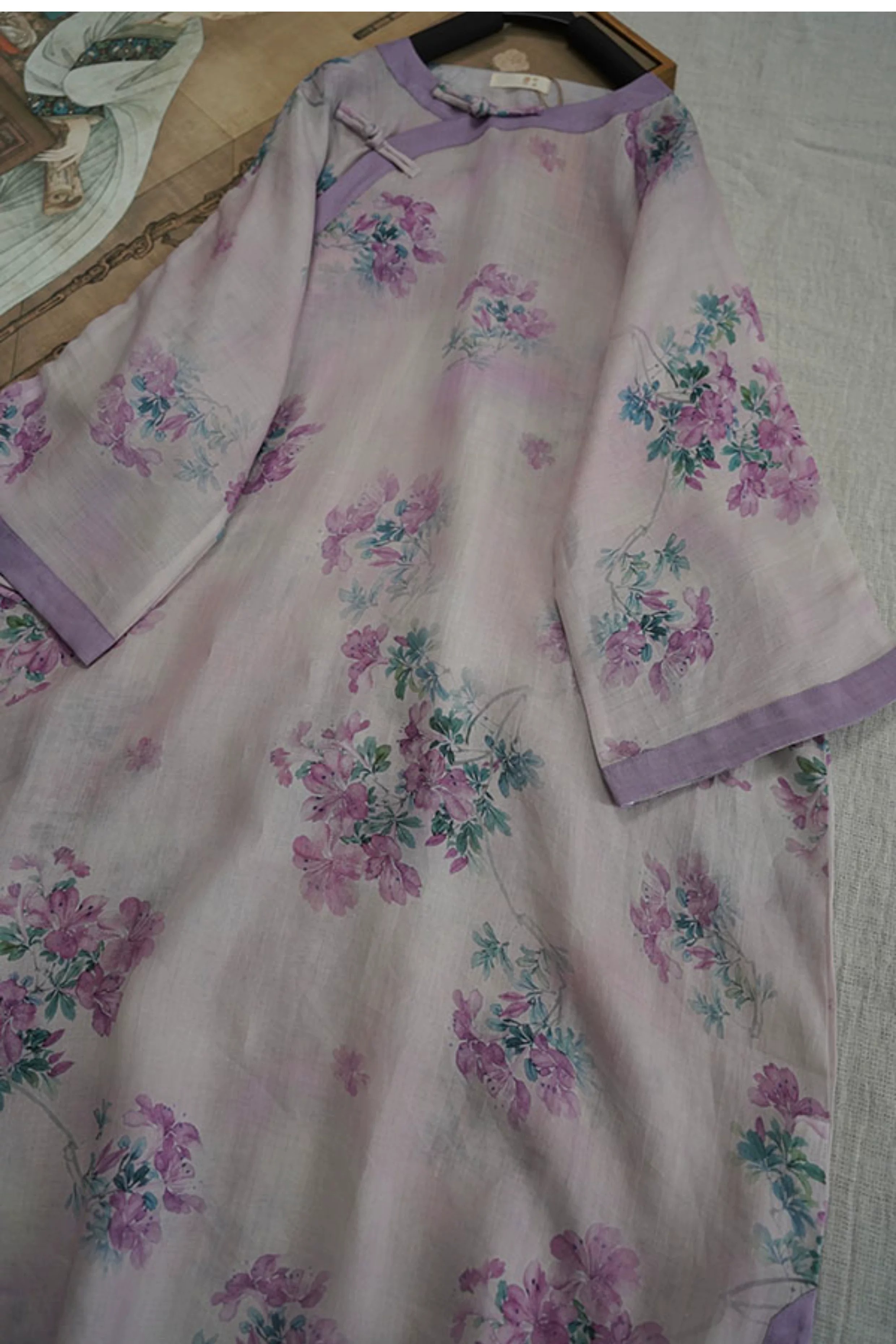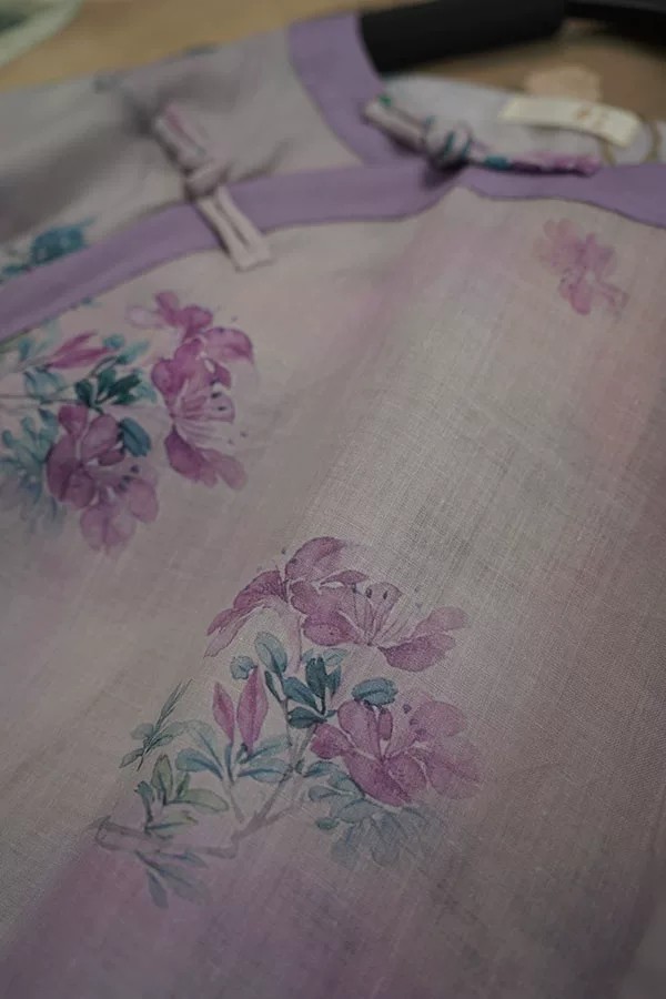 9024 재고 있음 2026 여름 새로운 면 린넨 국풍 보라색 뒤 푸 프린트 라운드 넥 롱 코트 단추 차 서비스