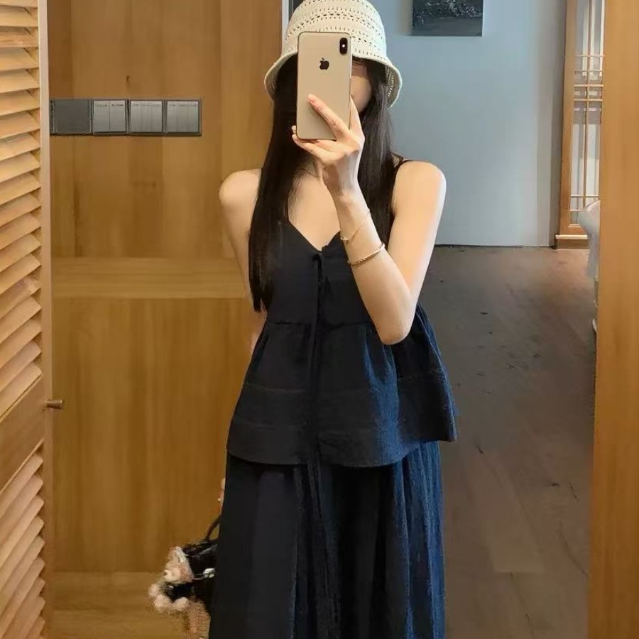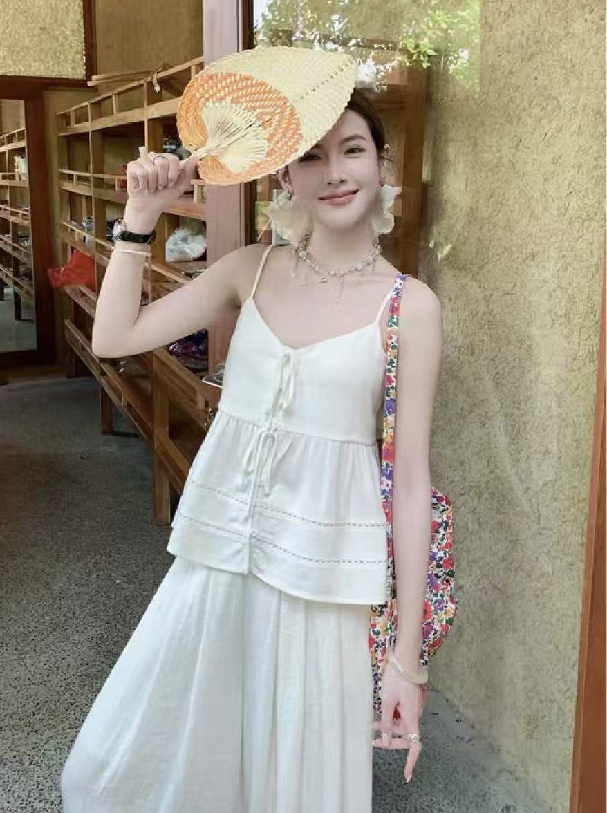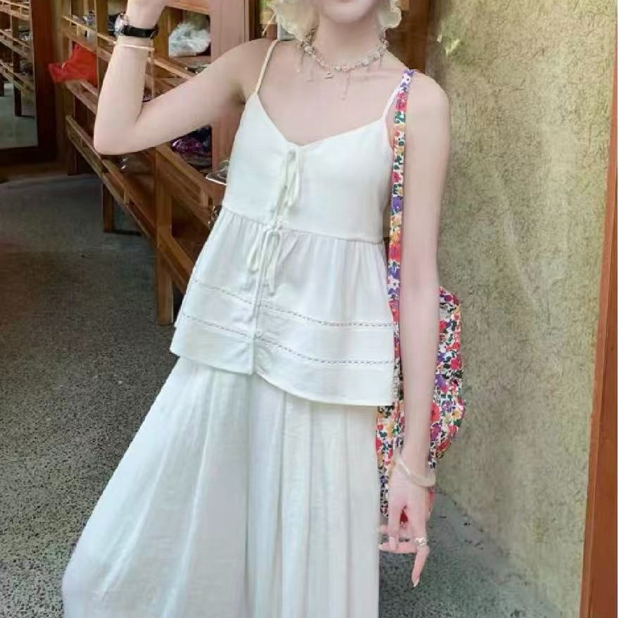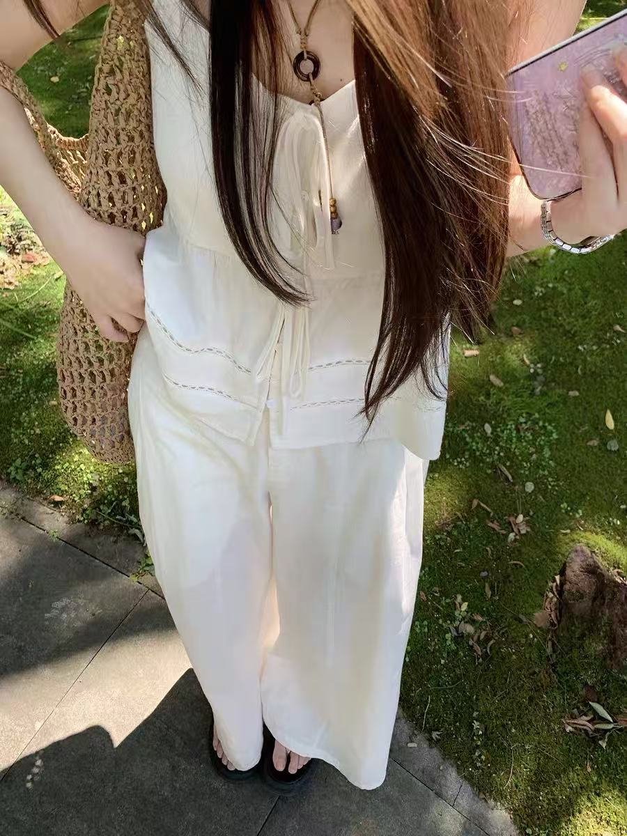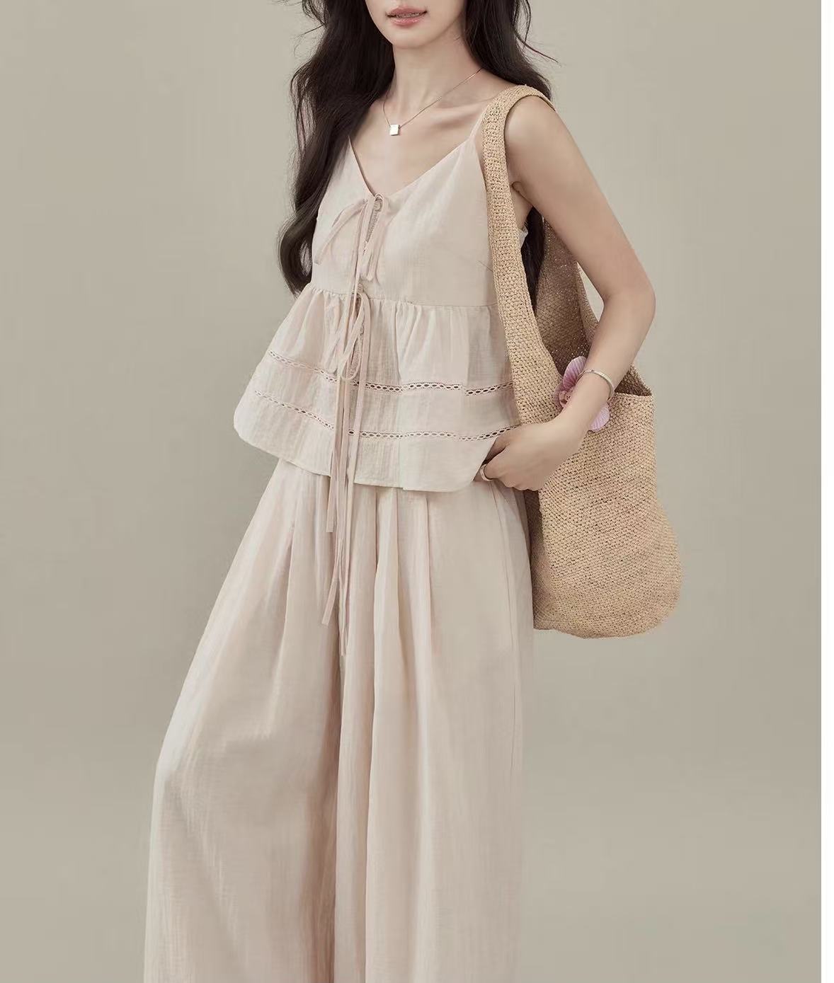 품격 V넥 레이스업 싱글 줄 버튼 캐미솔 작은 셔츠 하이웨이스트 루즈핏 스트레이트 와이드 레그 팬츠 세트 투피스 세트