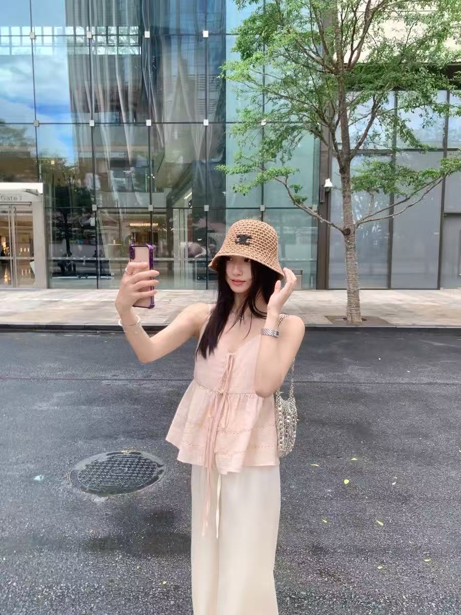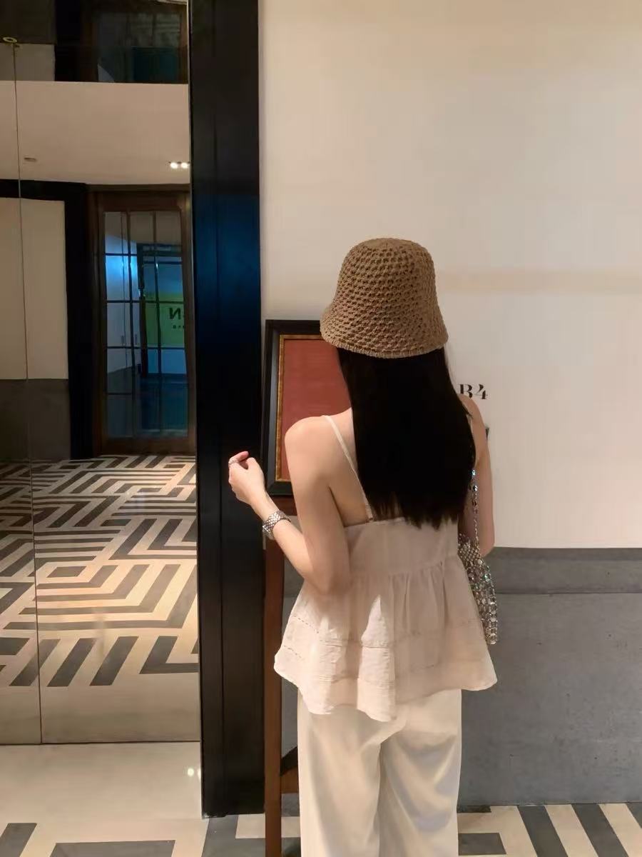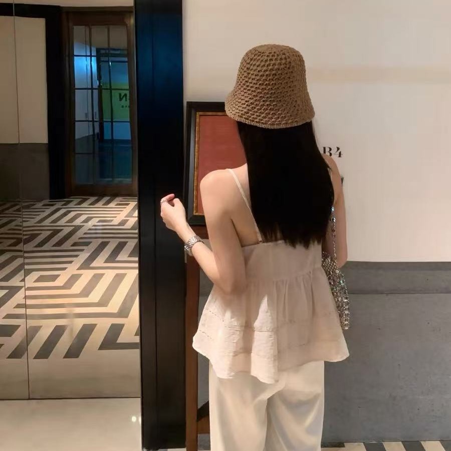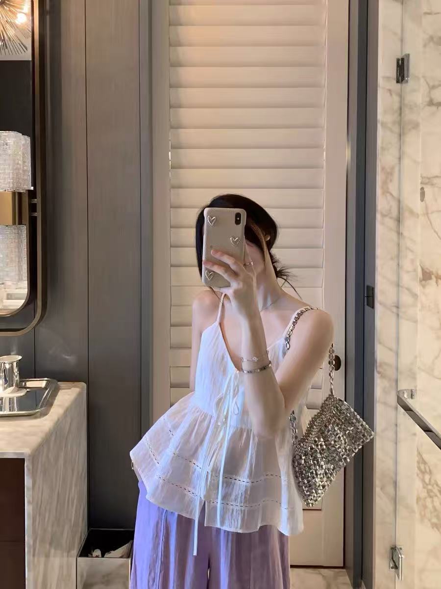 V넥 프릴 뒤로 스트랩 민소매 작은 셔츠 루즈핏 슬림해 보이는 조끼 스택 착용 맨위 여름 백리스 작은 셔츠
