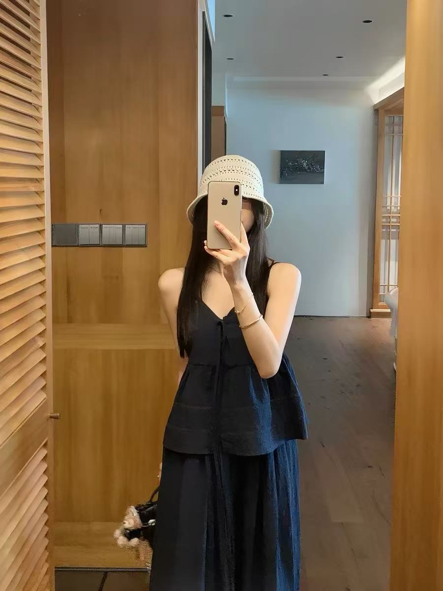 도트 무늬 백리스 민소매 드레스 여름 지불 레이스업 스트레이트 치마 허리 수축 민소매 롱 스커트 양성 및 음성 양면 착용