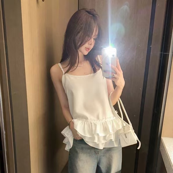 V넥 프릴 뒤로 스트랩 민소매 작은 셔츠 루즈핏 슬림해 보이는 조끼 스택 착용 맨위 여름 백리스 작은 셔츠