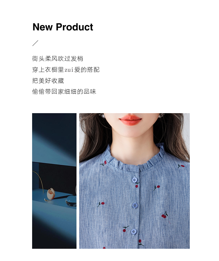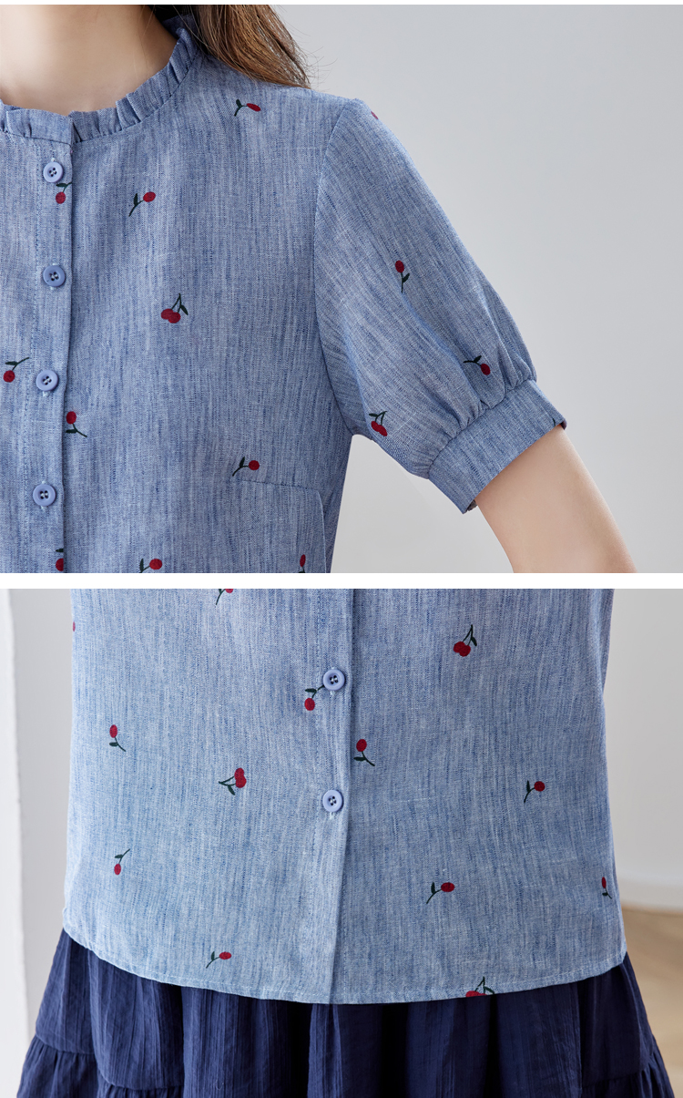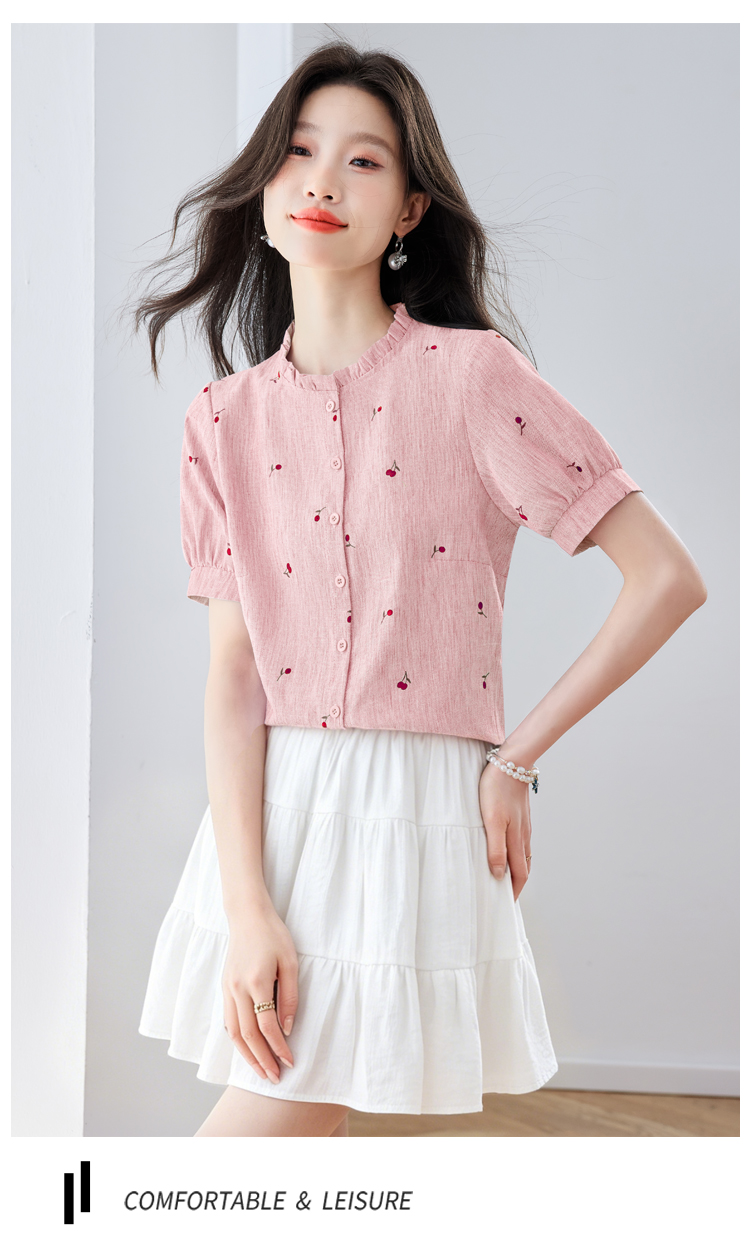 모방 마 체리 프린트 여성 셔츠 여름 2026 새로운 프릴 스탠드 칼라 반팔 다용도 슬림해 보이는 외국 가스 맨위