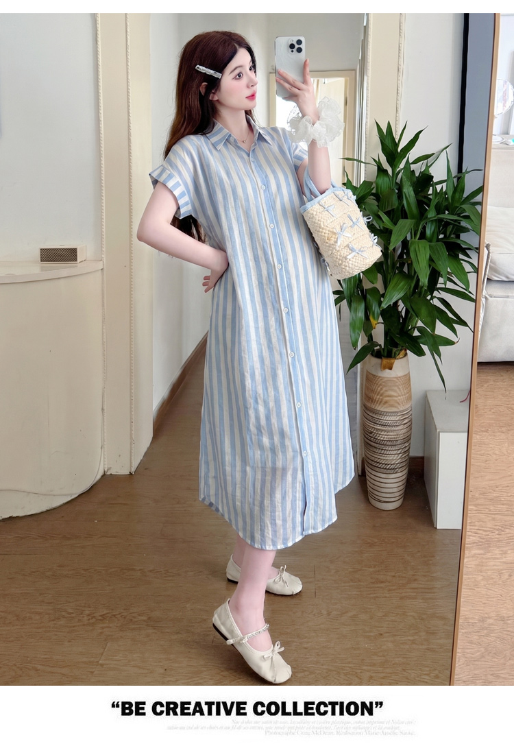 실사 출산 착용 2026 여름 드레스 새로운 스트라이프 빅 사이즈 루즈핏 연령 감소 슬림해 보이는 품격 중간 길이 드레스