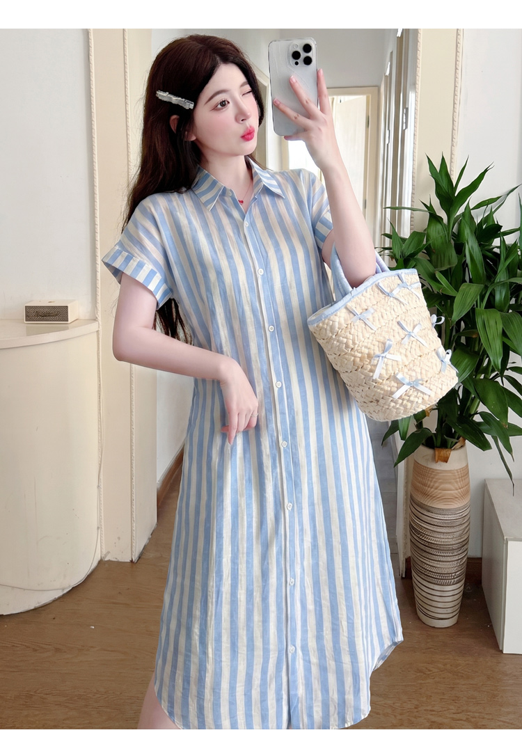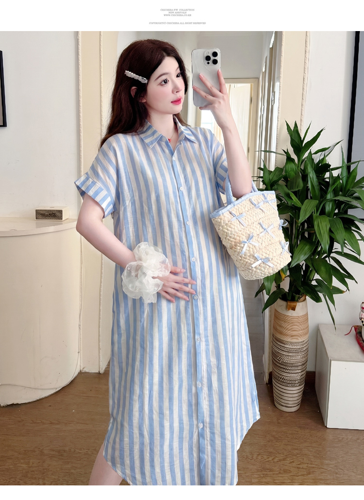 실사 2026 여름 드레스 새로운 출산 착용 한국 스타일 루즈핏 디스플레이 농땡이 부리다 라운드 넥 중간 길이 스트라이프 셔츠 드레스