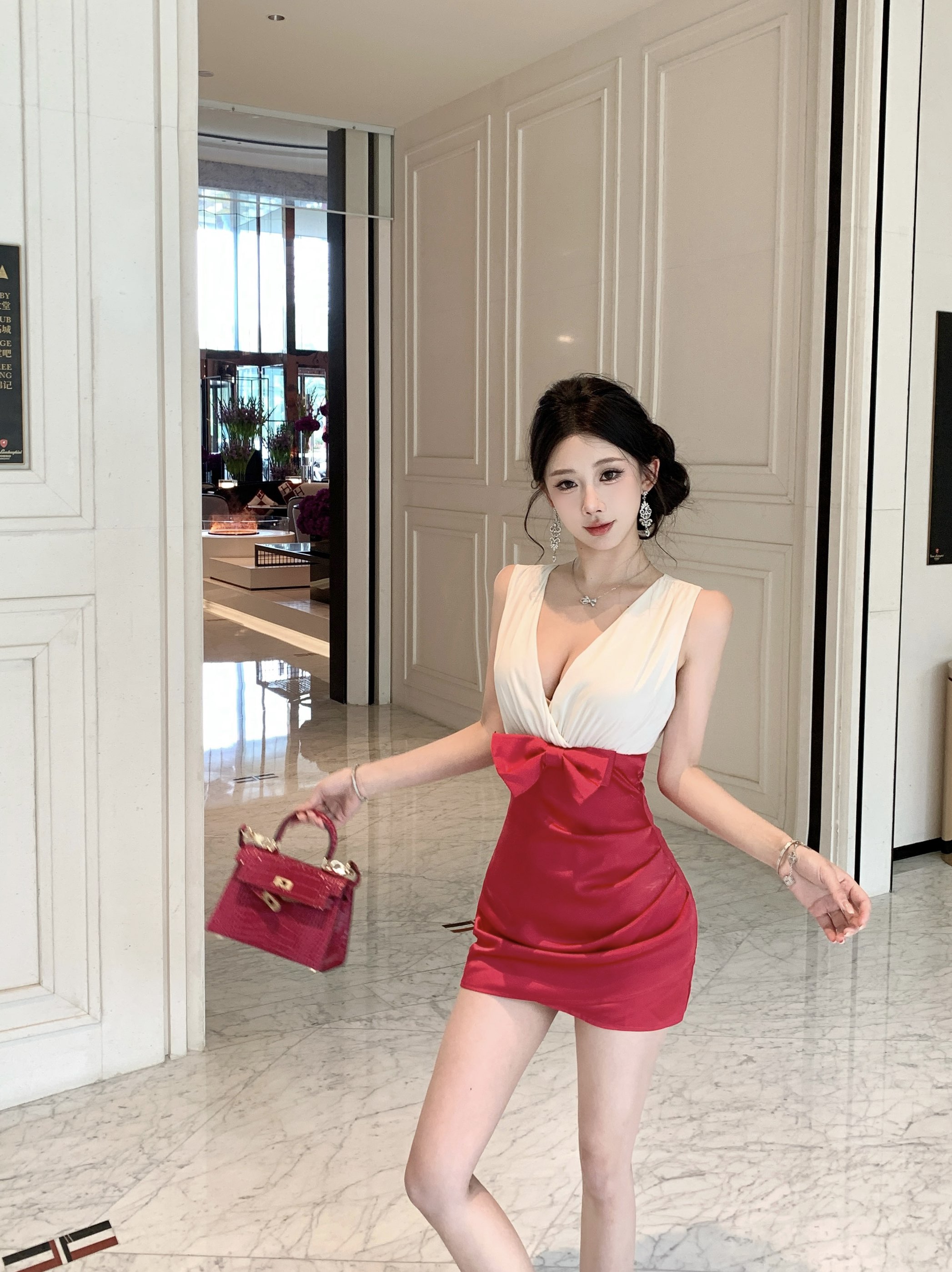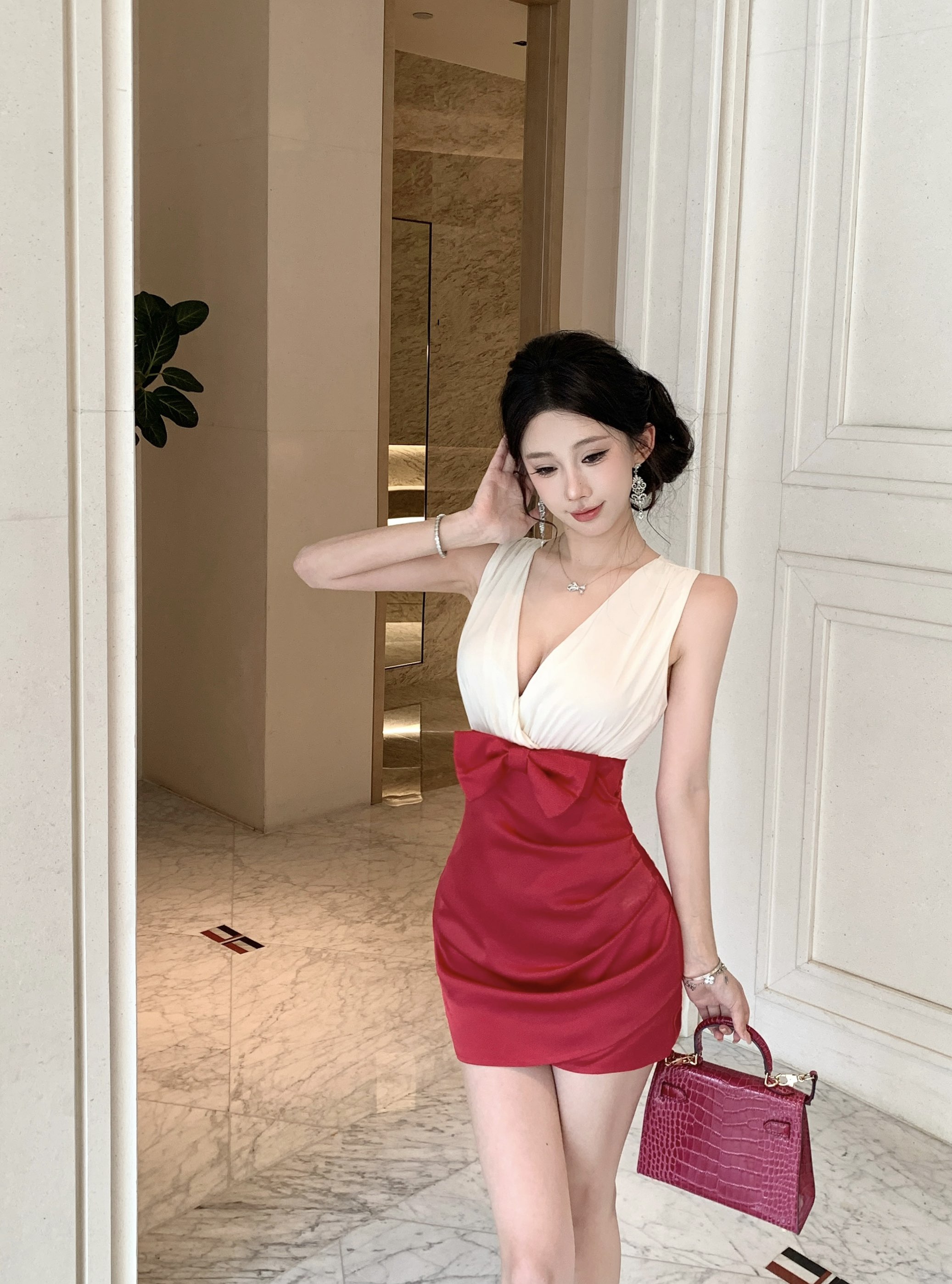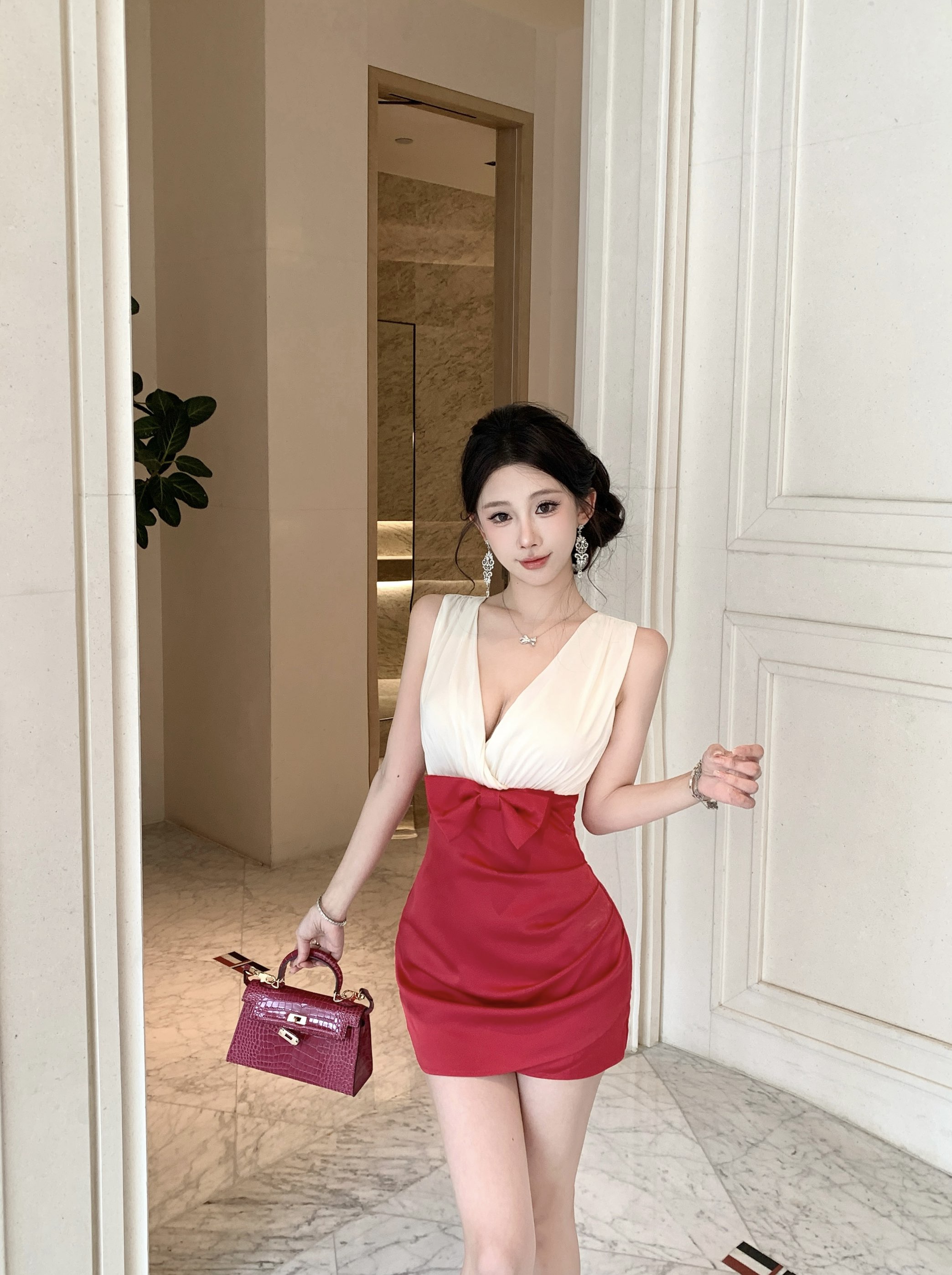 실사 정가 품격 고급 센스 배색 나비 매듭 드레스 여름 민소매 허리 수축 드레스