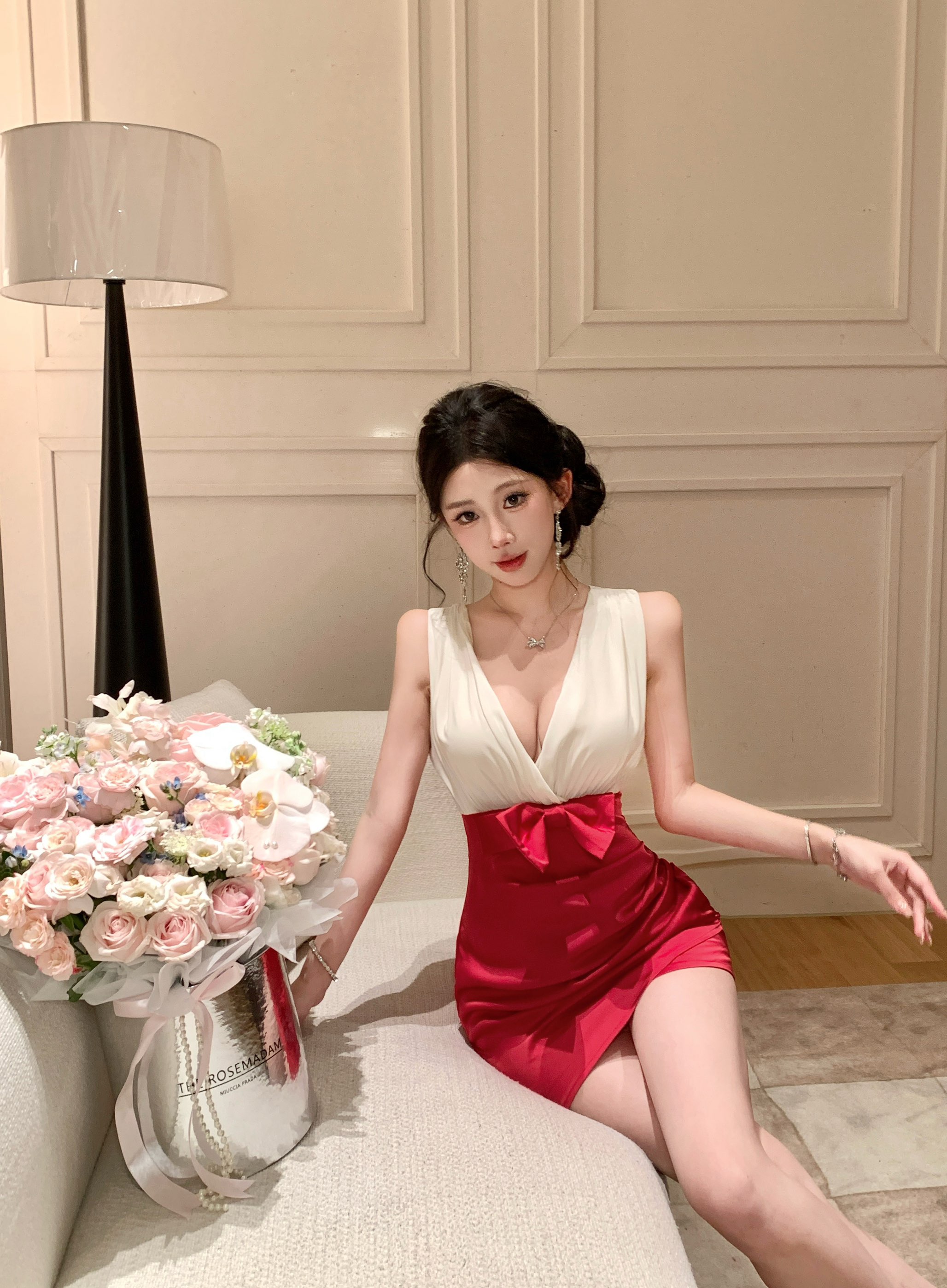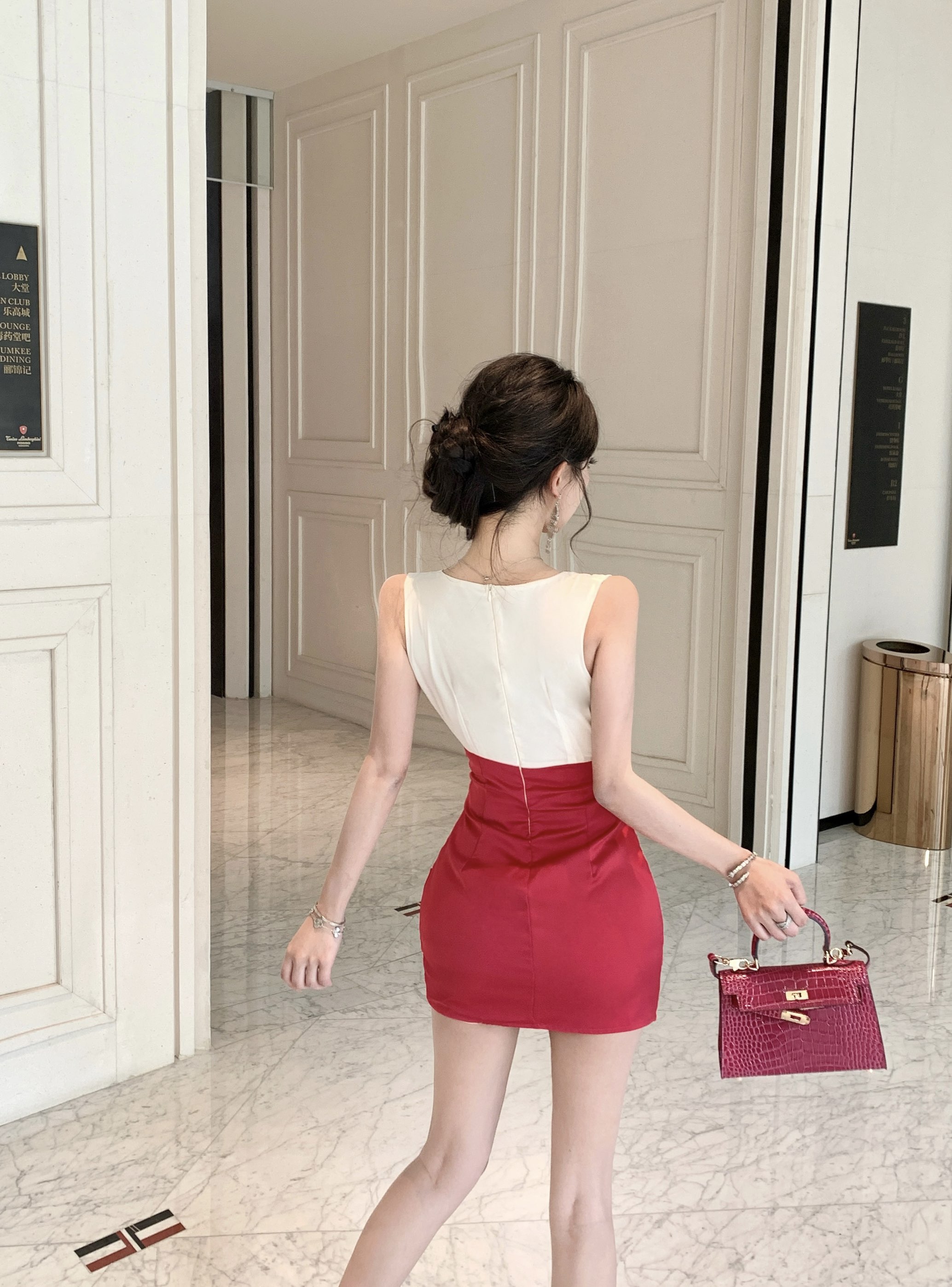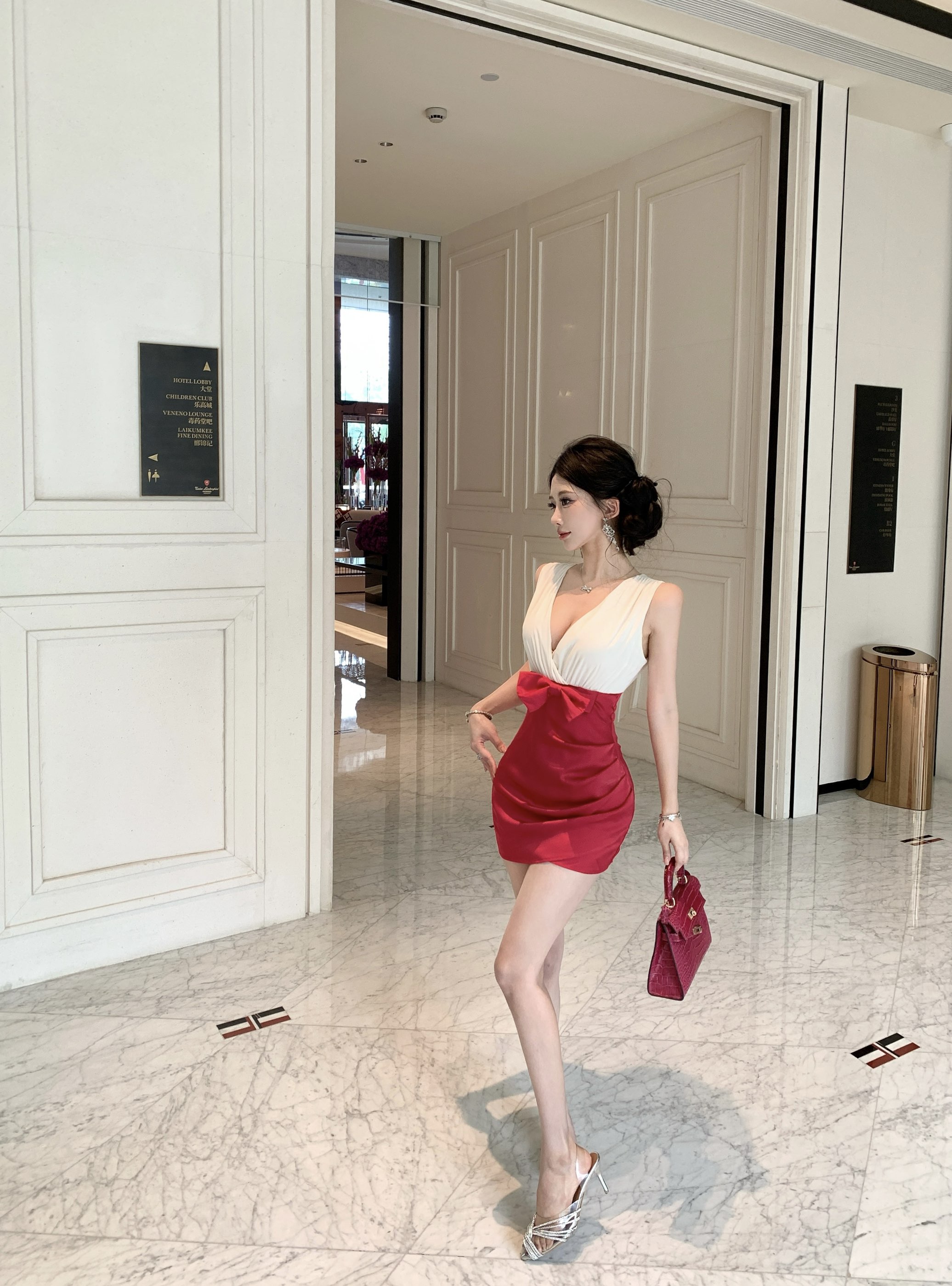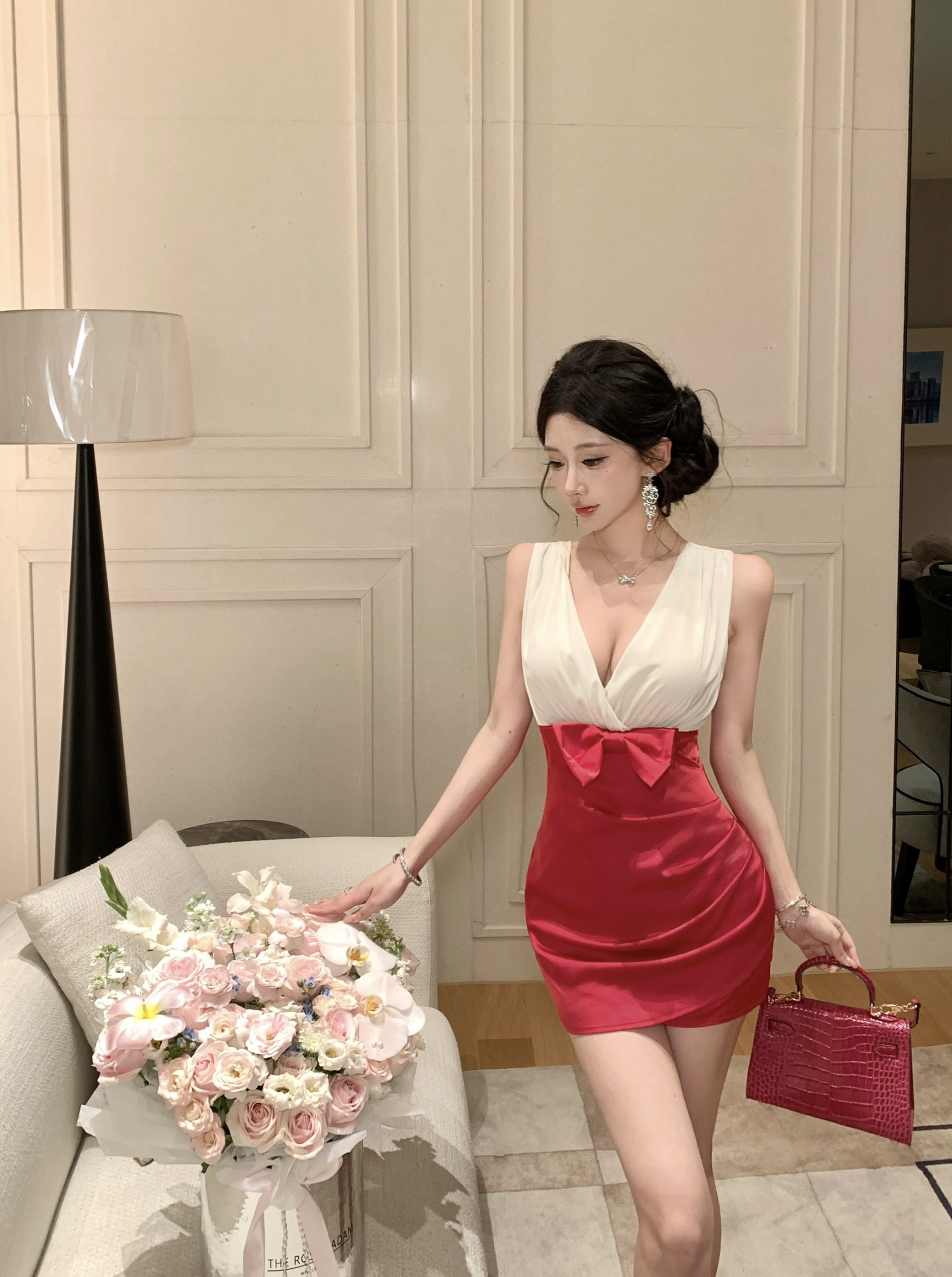 실사 정가 품격 고급 센스 배색 나비 매듭 드레스 여름 민소매 허리 수축 드레스