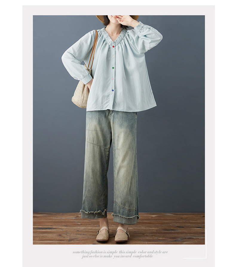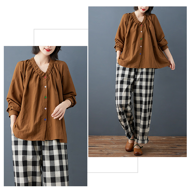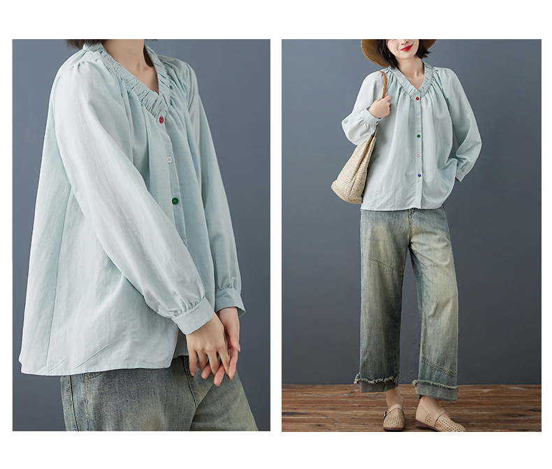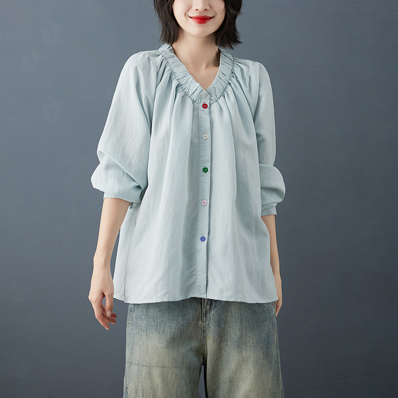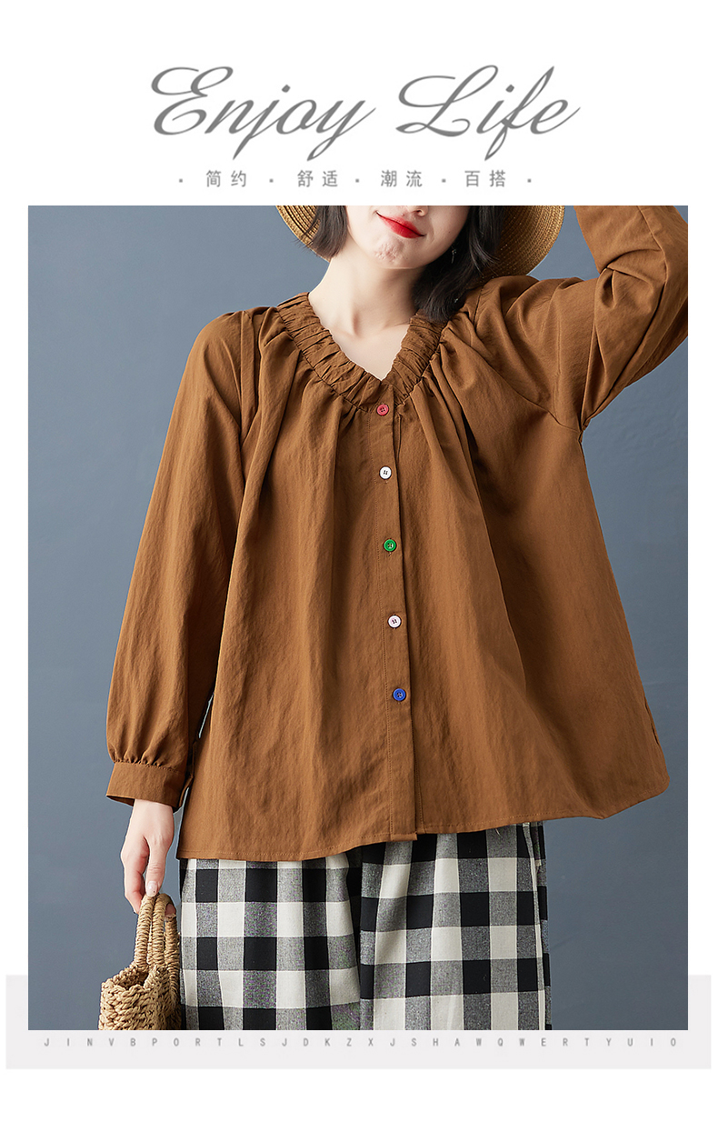 실사 2026 봄 새로운 빅 사이즈 루즈핏 캐주얼 목이버섯 레이스 소매 V넥 긴팔 셔츠 여성 의류 맨위