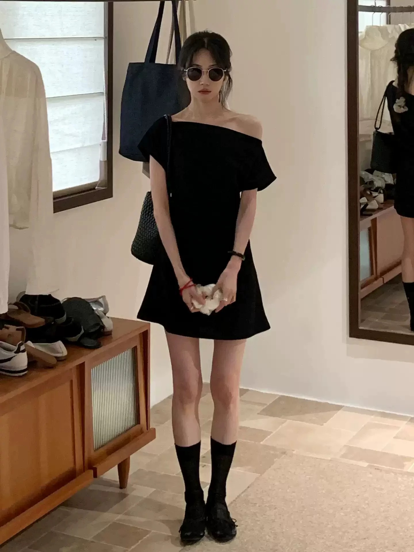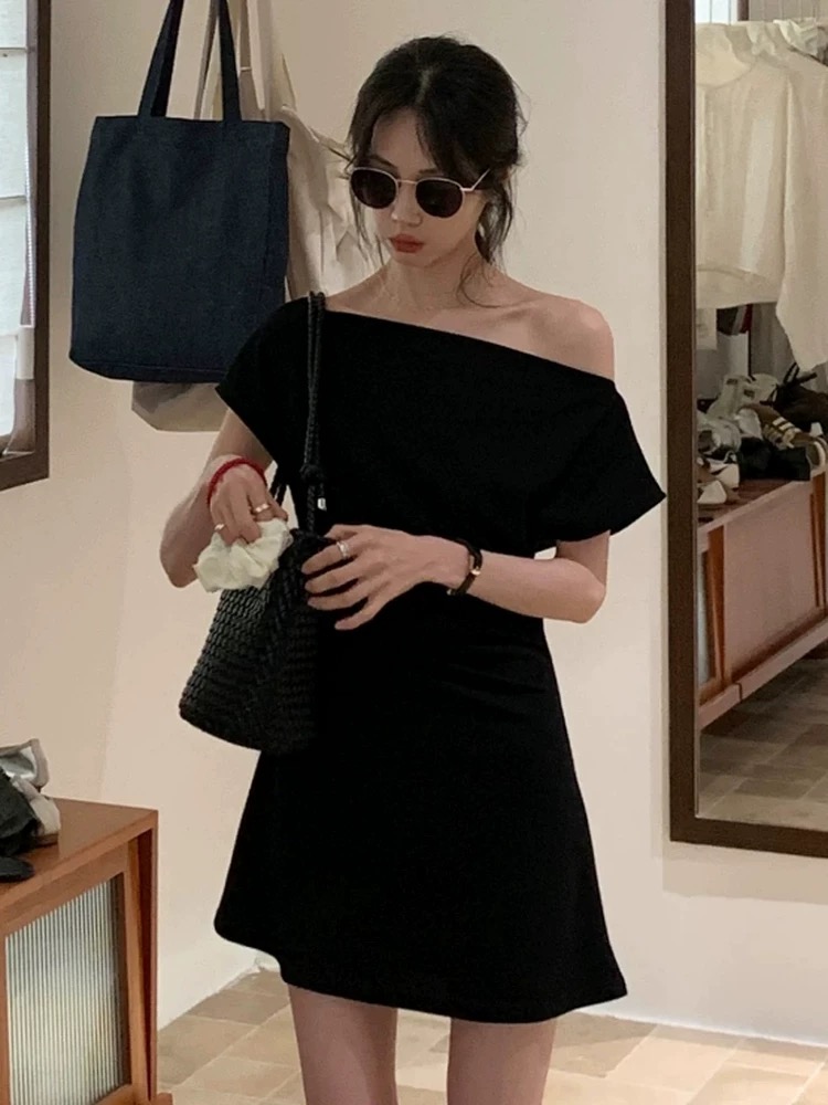 검정색 비스듬한 어깨 드레스 아이들 여름 프랑스식 작은 키 고급 센스 오프숄더 오프숄더 허리 수축 슬림해 보이는 미니 스커트