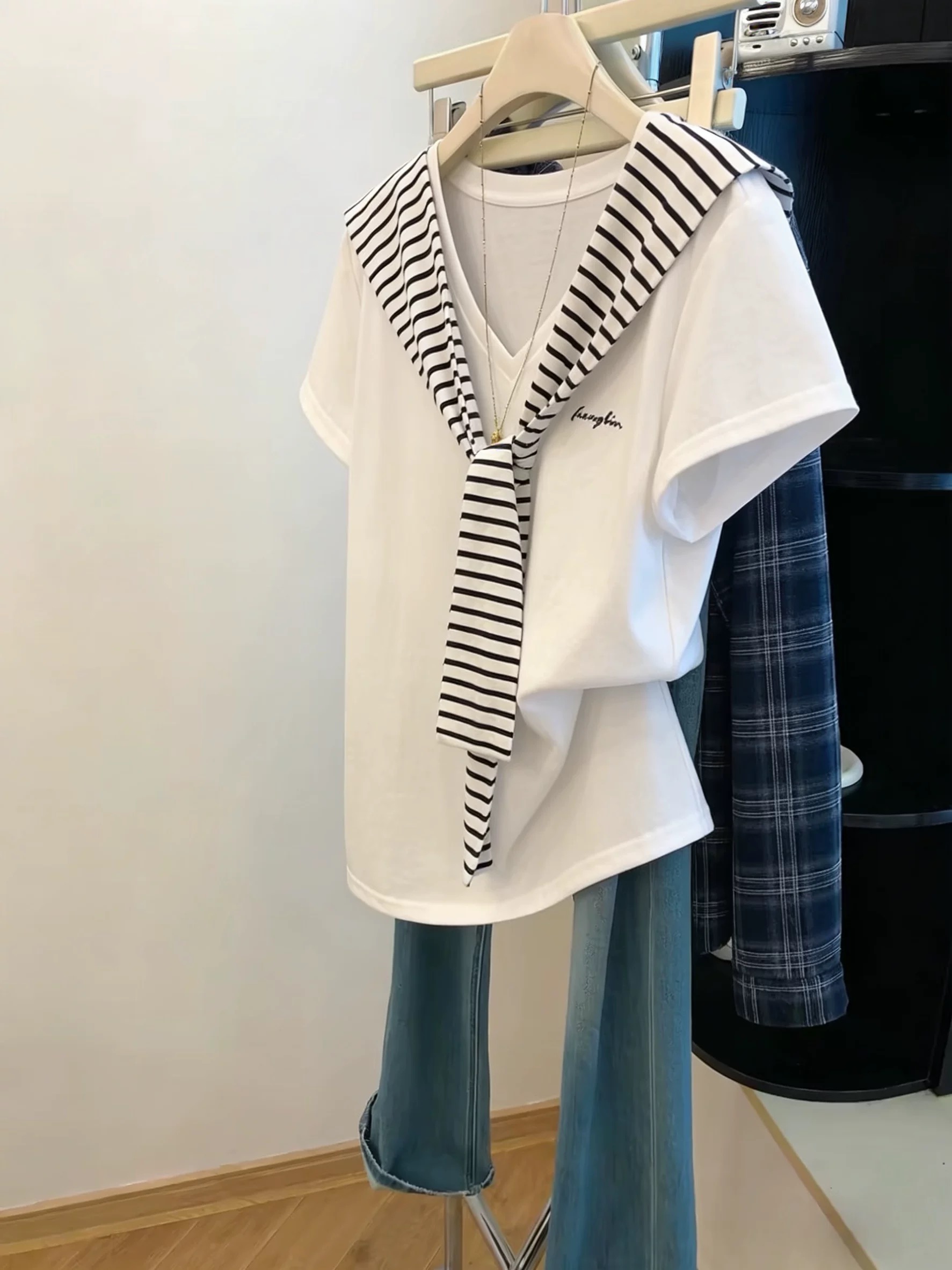 화이트 V넥 스트라이프 숄 투피스 세트 반팔 티셔츠 여성 2026 여름 새로운 디자인 센스 품격 연령 감소 맨위