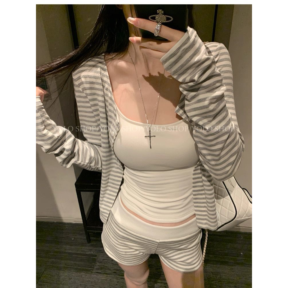 느긋한 바람 스트라이프 세트 여성 여름 얇은 스타일 자외선 차단 오픈 가디건 맨위 작은 키 운동 캐주얼 반바지 투피스 세트