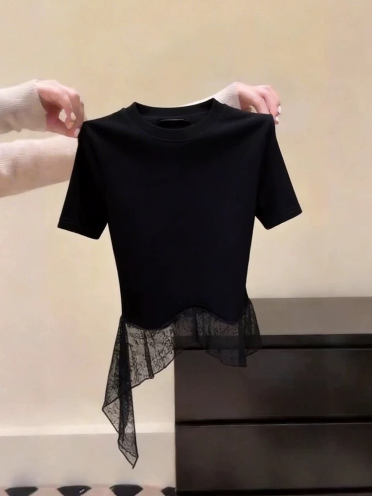 자이언트 잘 생긴 검정색 레이스 반팔 티셔츠 여성 2026 새로운 여름 디자인 센스 고유 한 아름다운 연령 감소 섹션 맨위