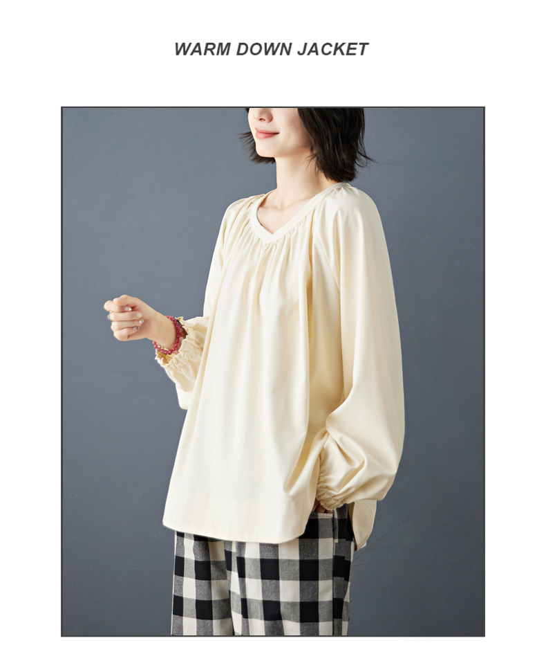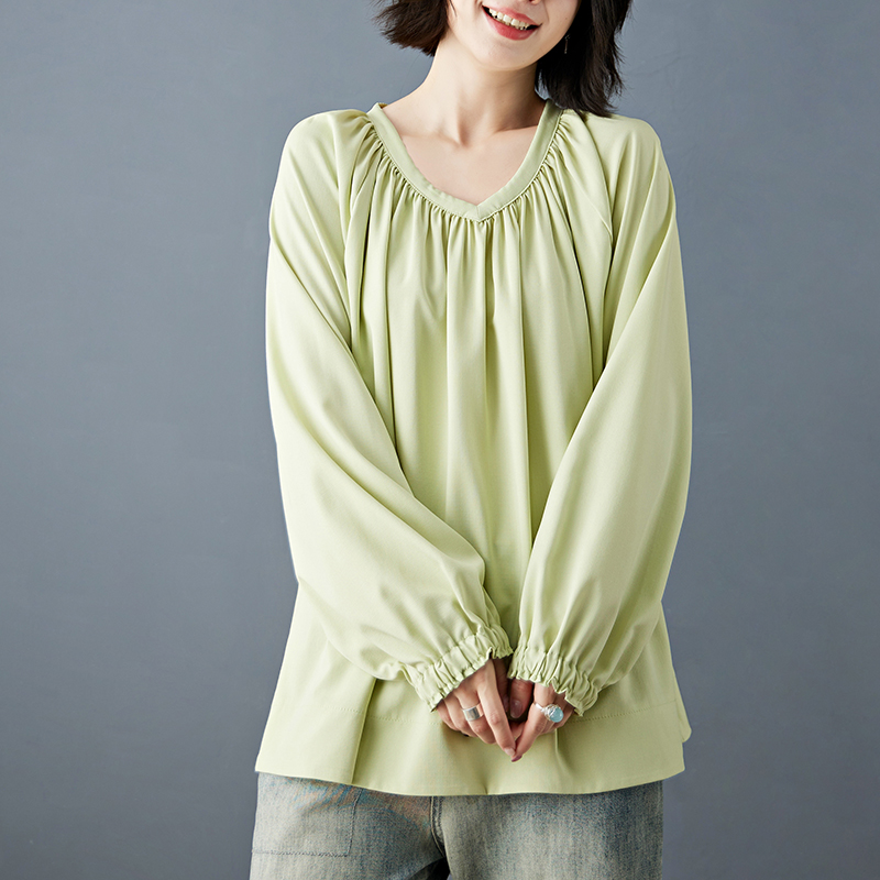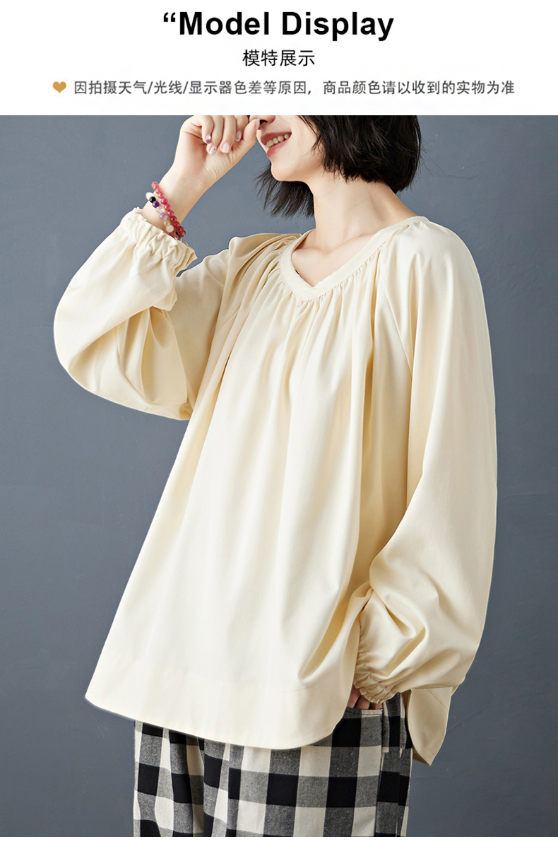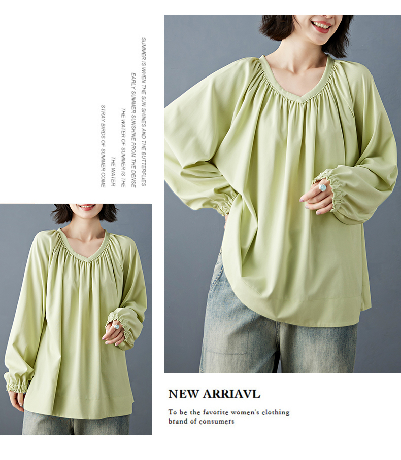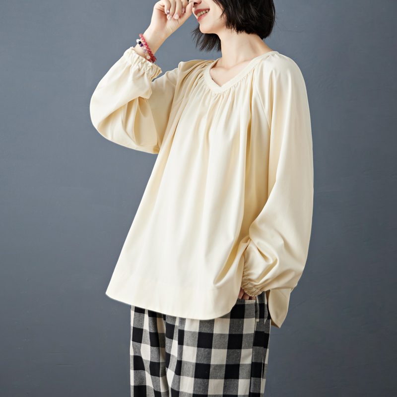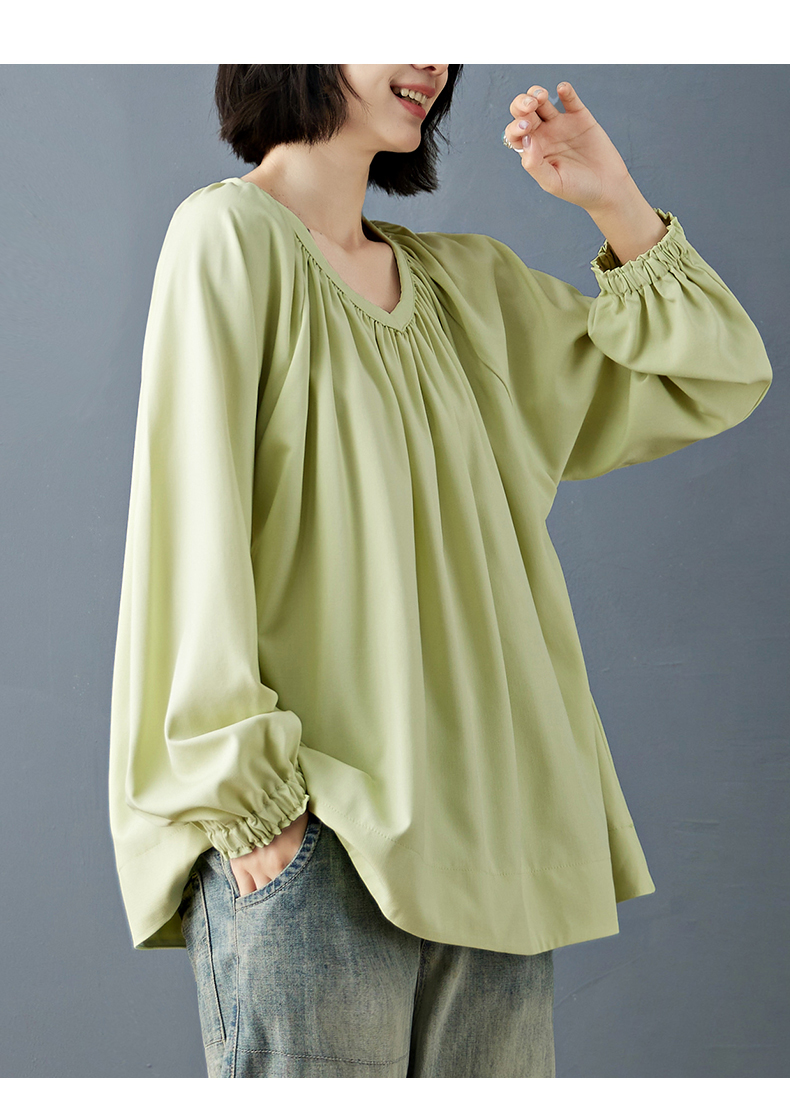 실사 2026 봄 새로운 빅 사이즈 루즈핏 캐주얼 목이버섯 레이스 소매 V넥 긴팔 셔츠 여성 의류 맨위
