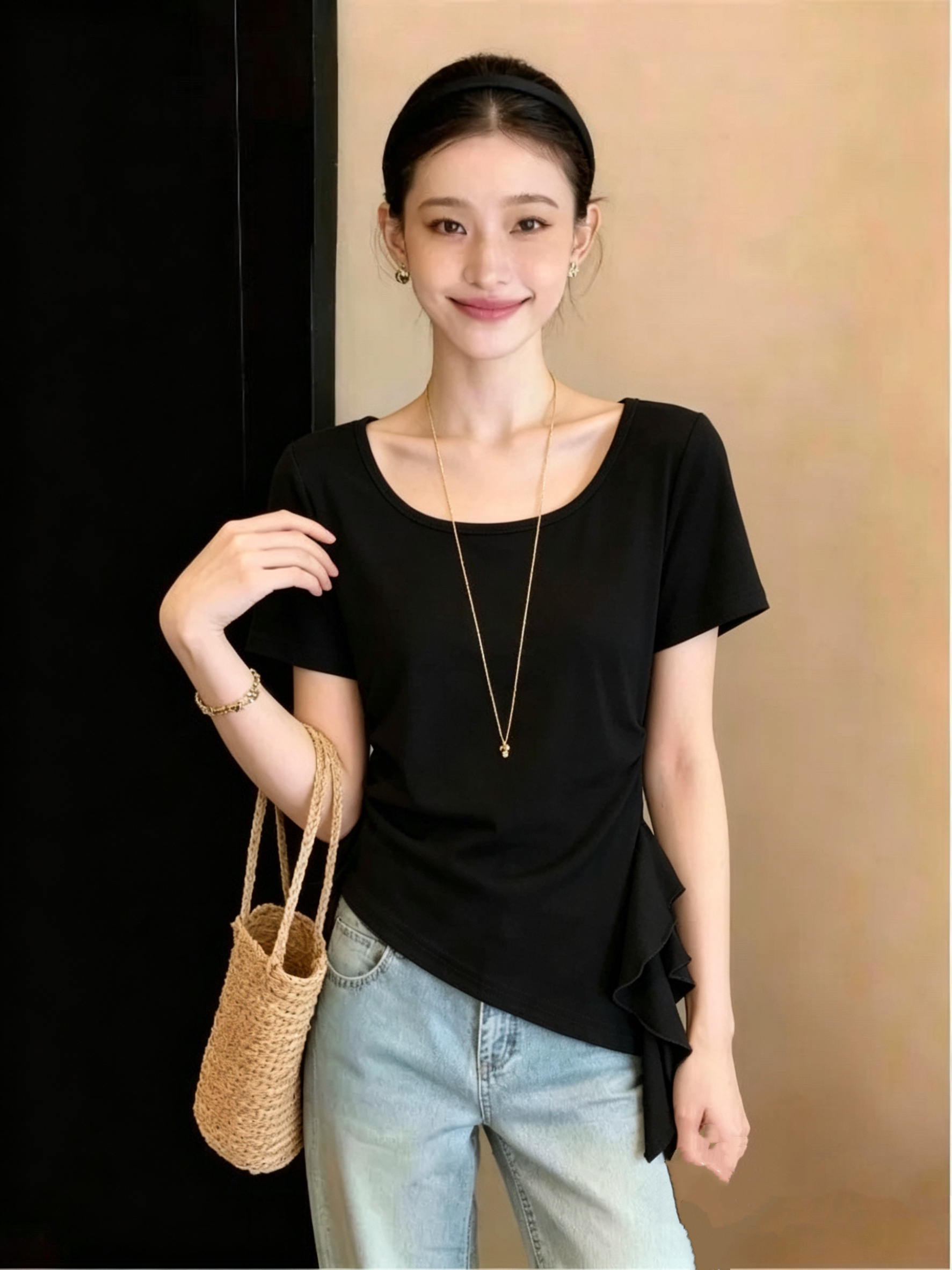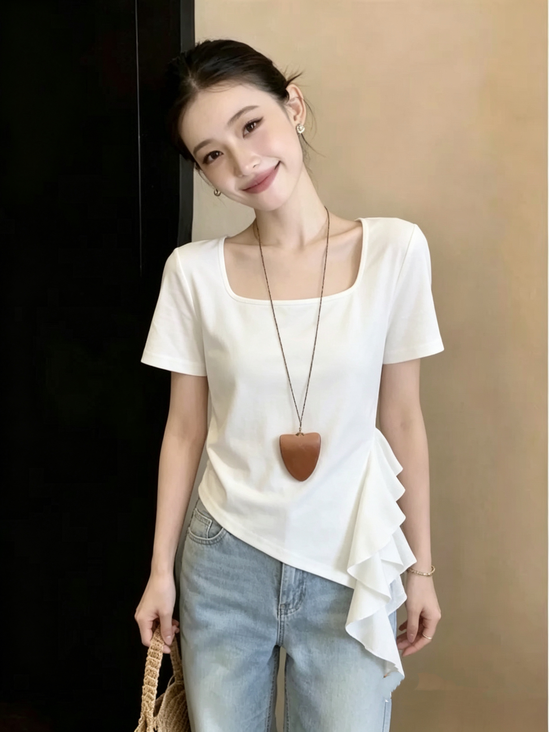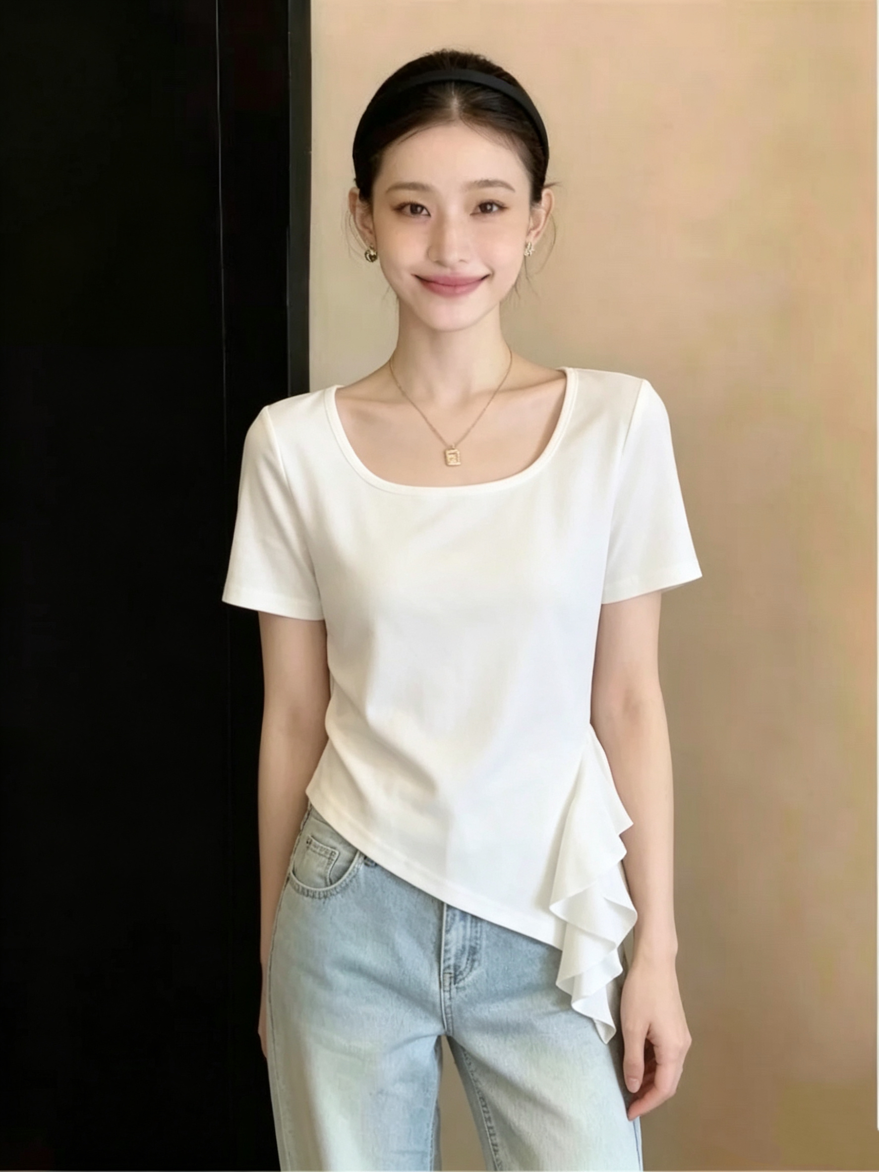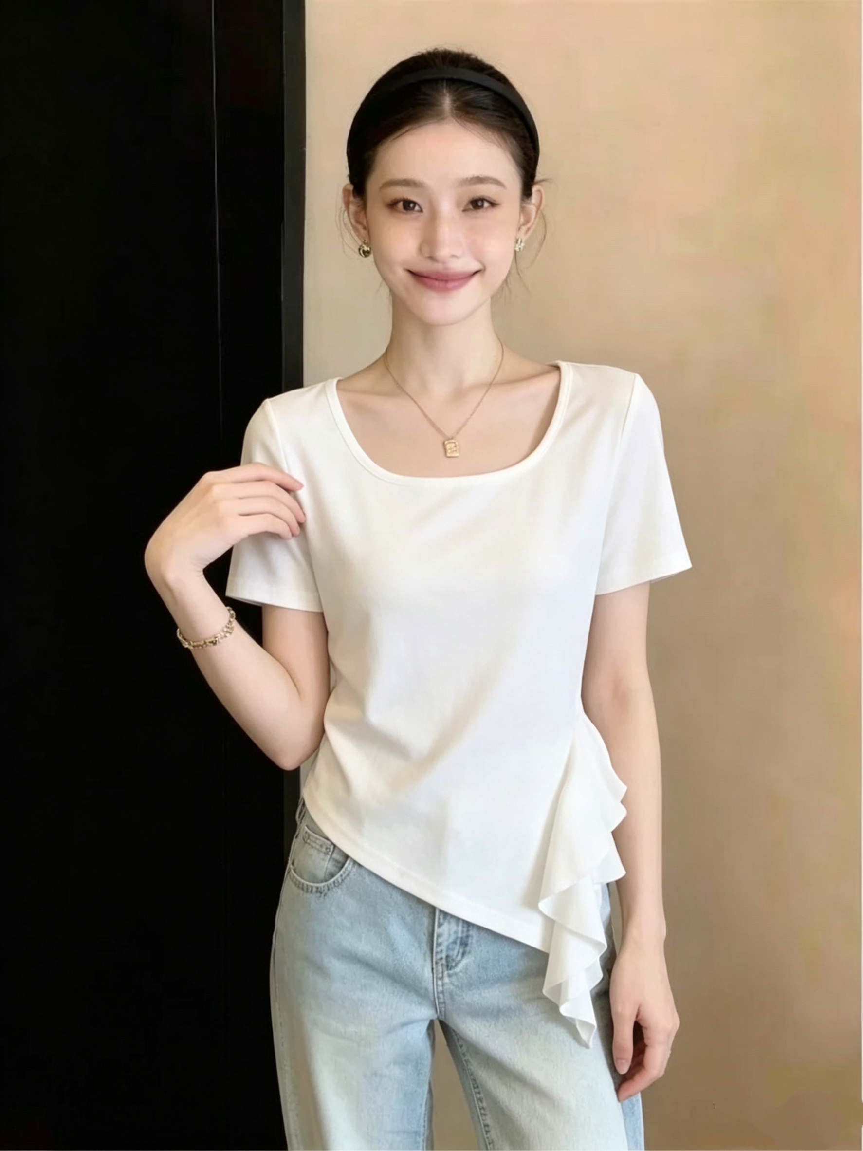 실사 정가 화이트 비스듬한 칼라 오프숄더 핫걸 반팔 티셔츠 여성 여름 디자인 센스 허리 수축 슬림해 보이는 아름다운 맨위