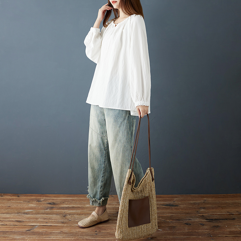 실사 2026 봄 새로운 맨위 루즈핏 디자인 센스 단색 다용도 목이버섯 레이스 삽입 어깨 소매 여성 셔츠