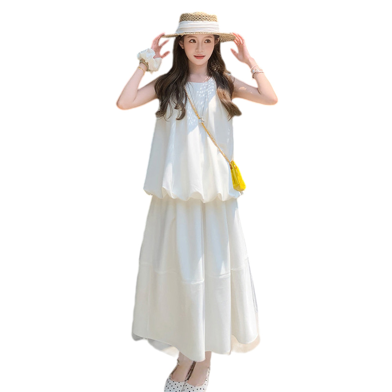 임산부 빅 사이즈 한국 스타일 얇은 스타일 민소매 조끼 이후 밴딩 반신 치마 세트