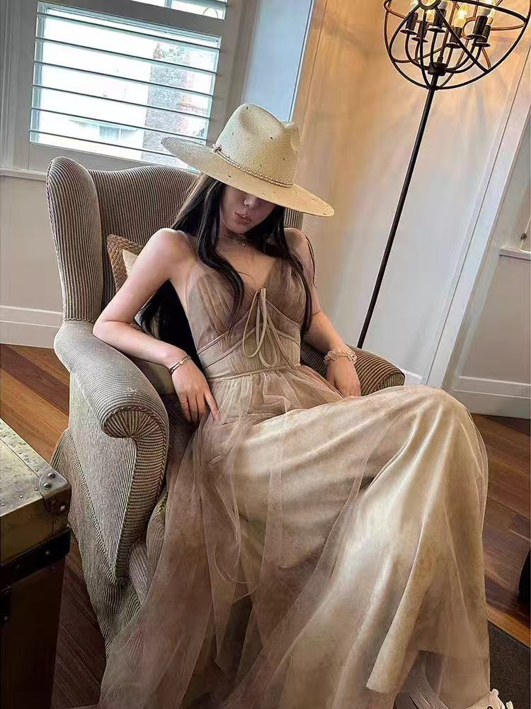 이중층 수묵화 헤일로 염색 망사 V넥 좋은 슬립 드레스 하이웨이스트 몸매 가꾸기 롱 스커트