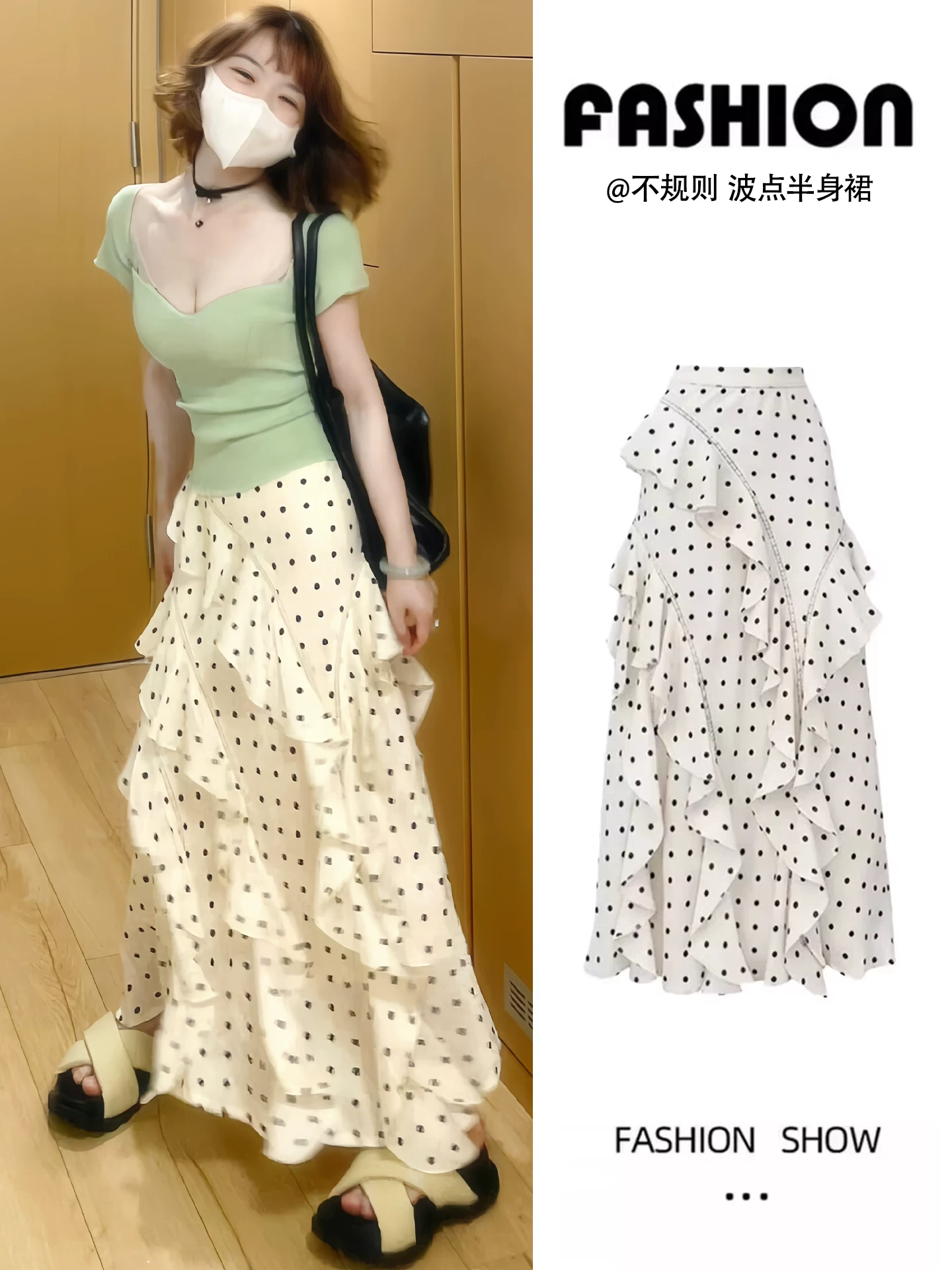 프랑스식 불규칙 쉬폰 반신 스커트 여성 여름 2026 새로운 하이웨이스트 슬림해 보이는 프릴 망사 도트 무늬 롱 스커트