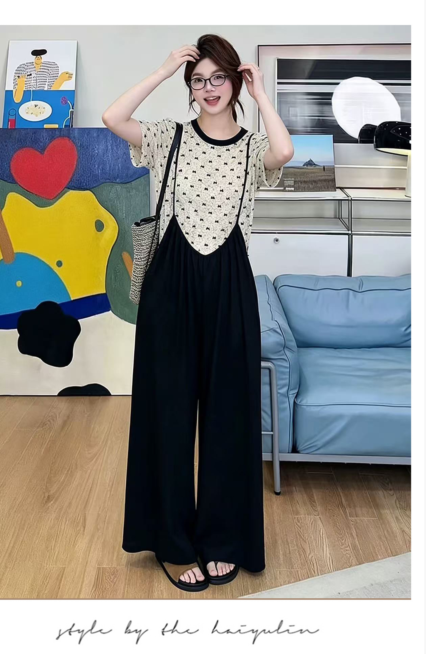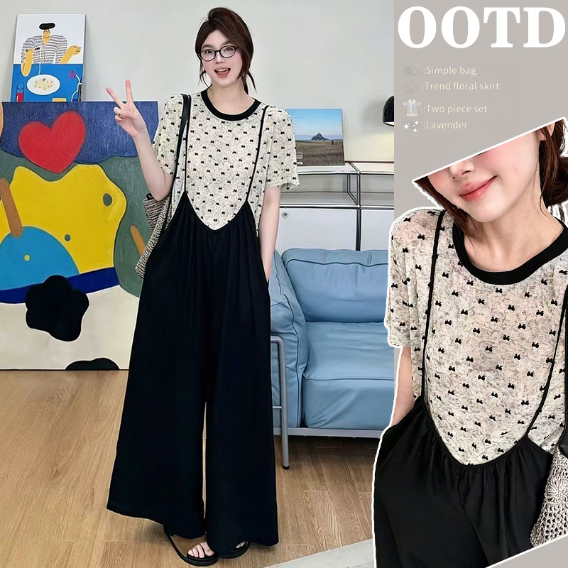 지금 임산부 여름 나비 매듭 식물 플러시 패턴 맨위 수 있습니다. 조정 어깨끈 와이드 레그 팬츠 멜빵 바지 세트
