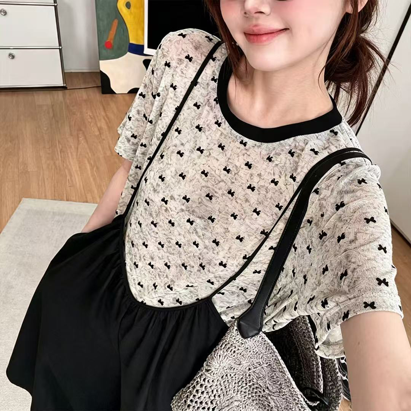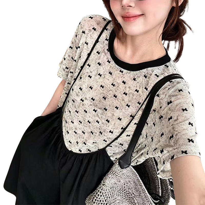 2026 여름 새로운 레트로 관대 한 칼라 부드러운 품격 맨위 패치워크 레이스 중간 소매 티셔츠 여성