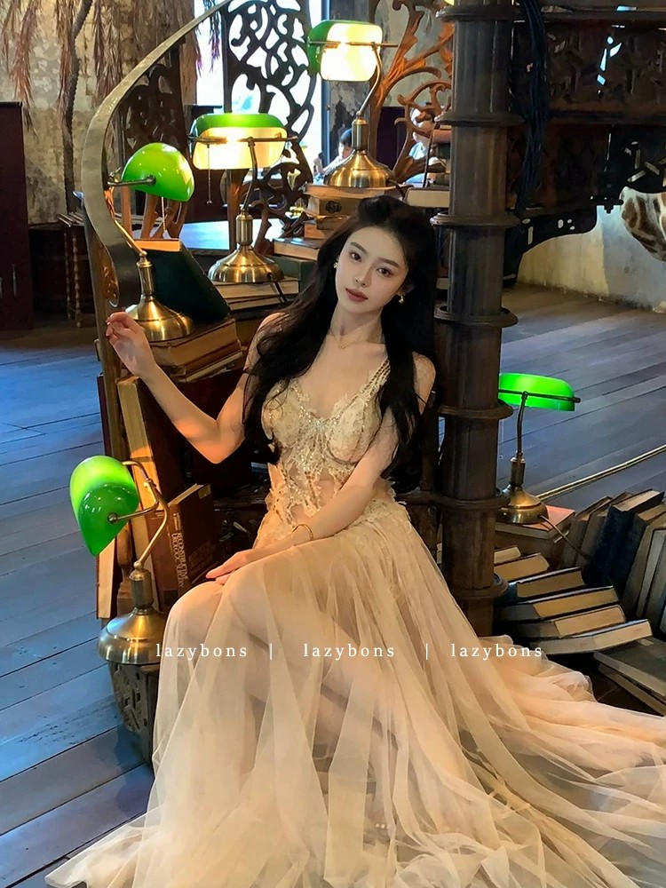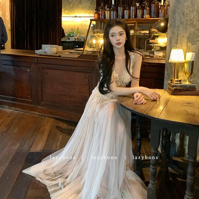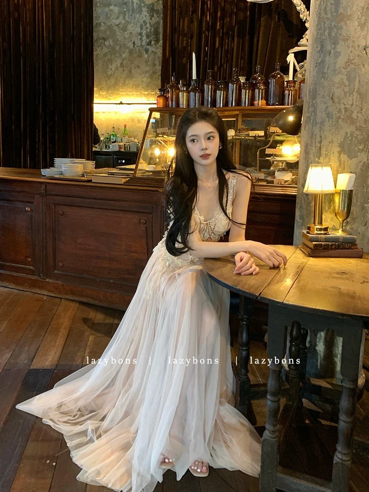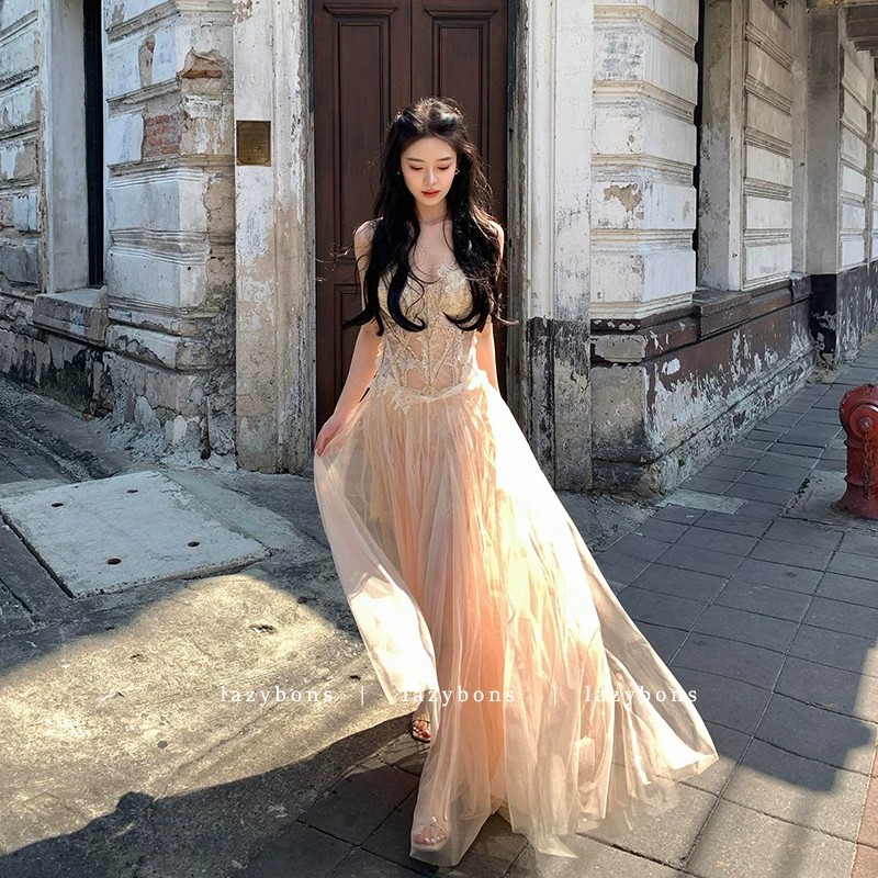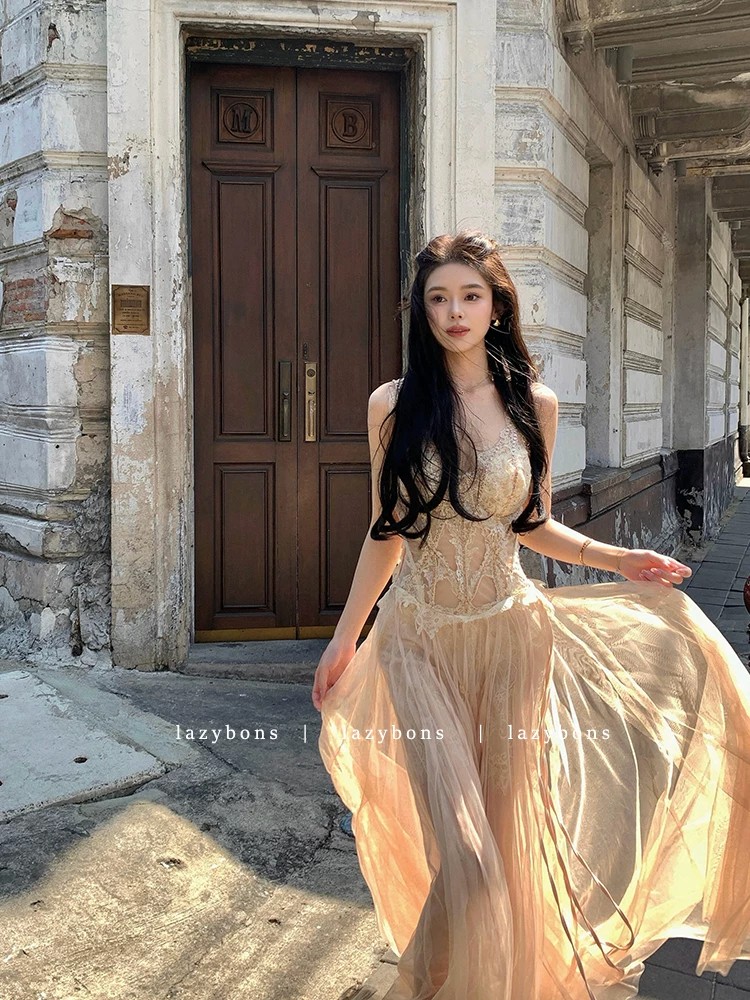 프랑스식 살구 색상 레이스 슬립 드레스 빛 럭셔리 명문 여성 바람 생일 연회 예복 롱 스커트