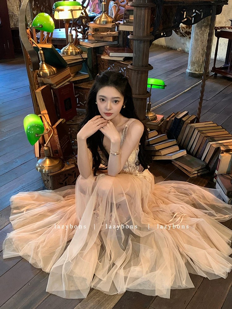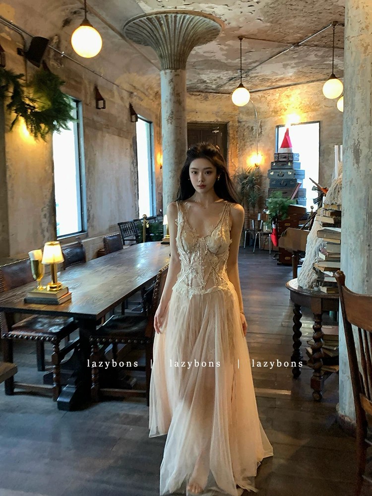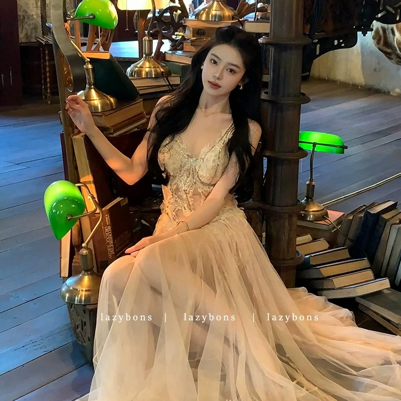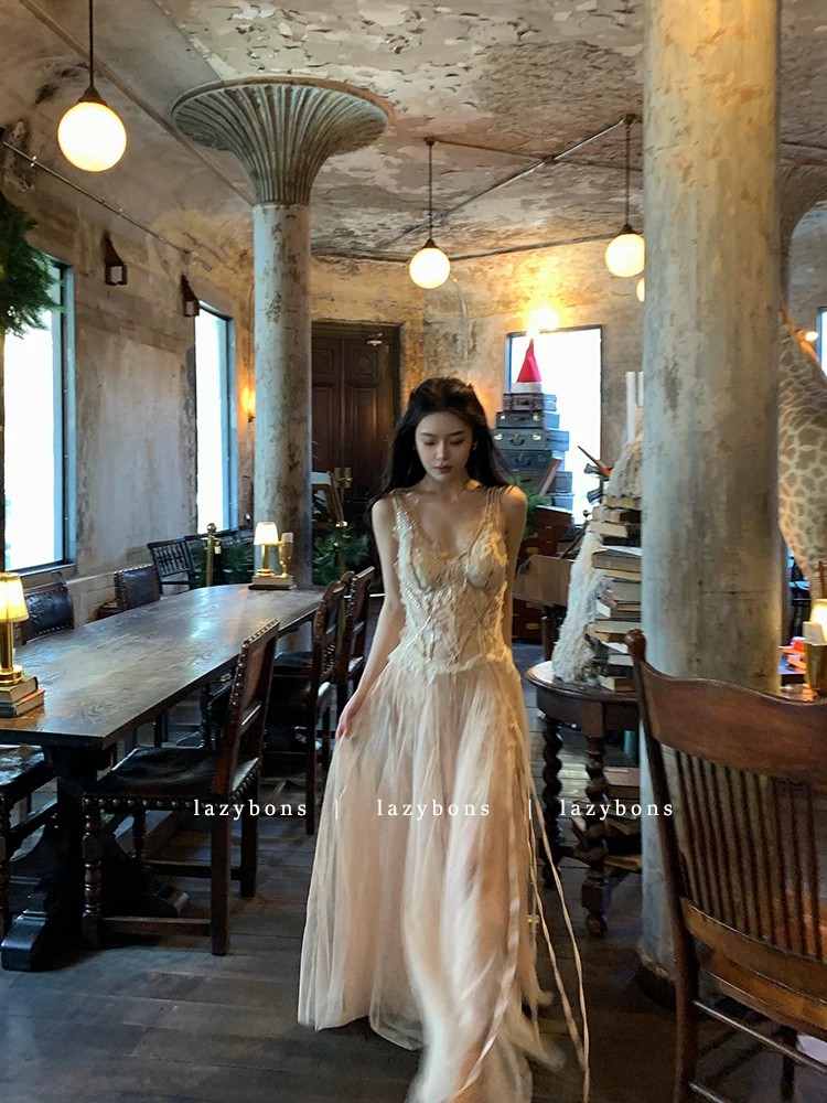 프랑스식 살구 색상 레이스 슬립 드레스 빛 럭셔리 명문 여성 바람 생일 연회 예복 롱 스커트