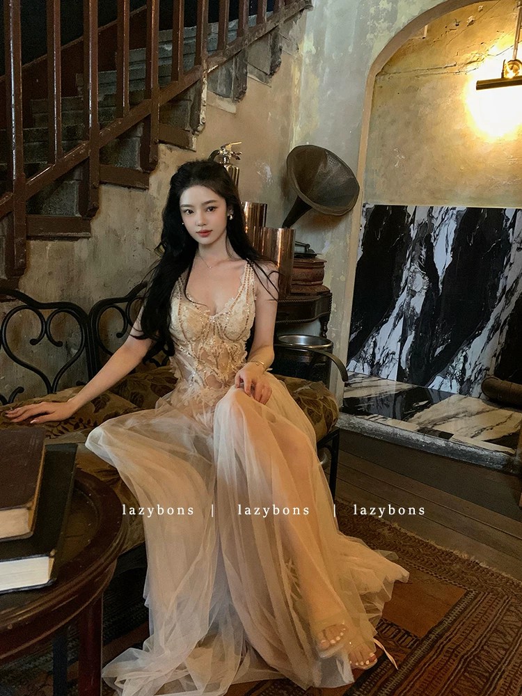고급 센스 높음 트임 깊은 V 넥 행침 목 드레스 이슬 허리 백리스 타이트 스커트 인어 꼬리 스커트 품격 롱 스커트