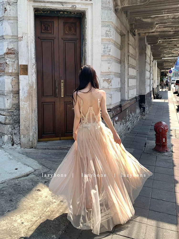 카 다몸 한여름 순수한 욕망 센스 프랑스식 홀로우 아웃 레이스 계단식 백리스 여성 드레스