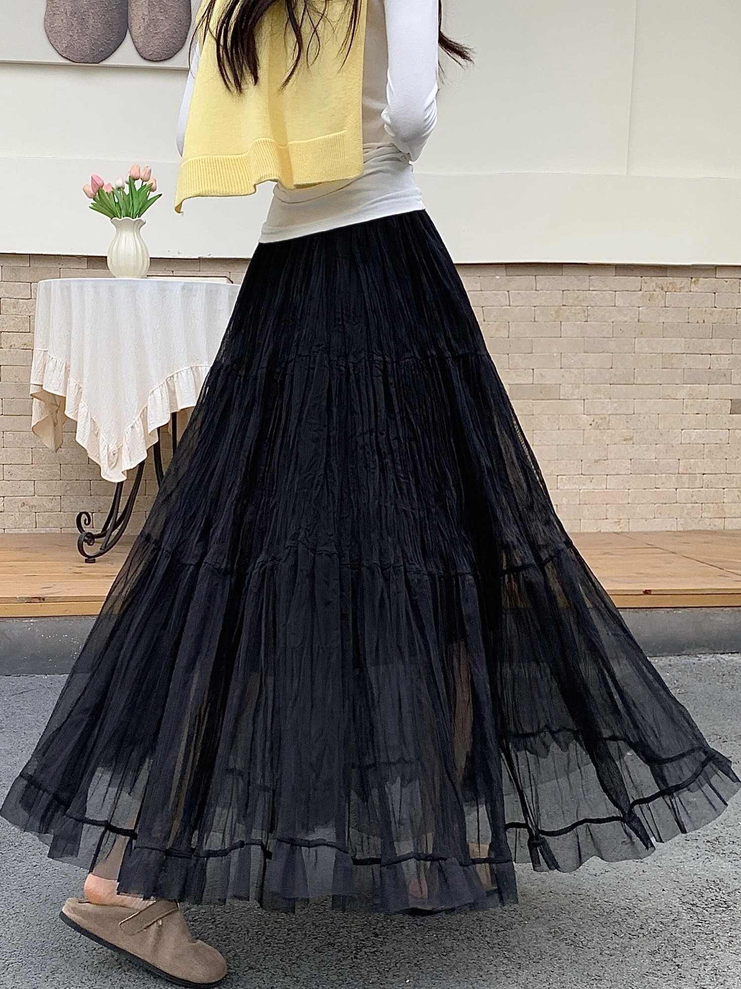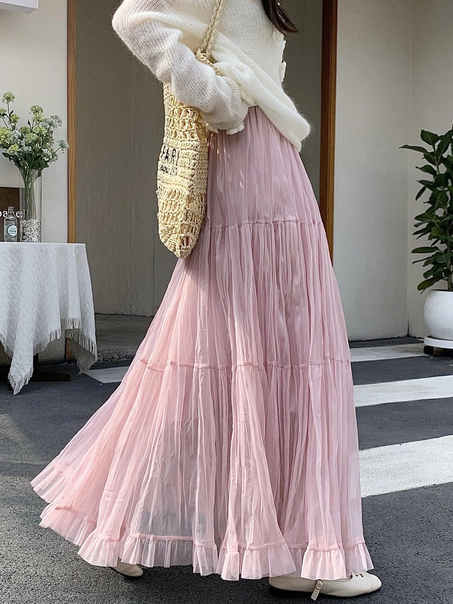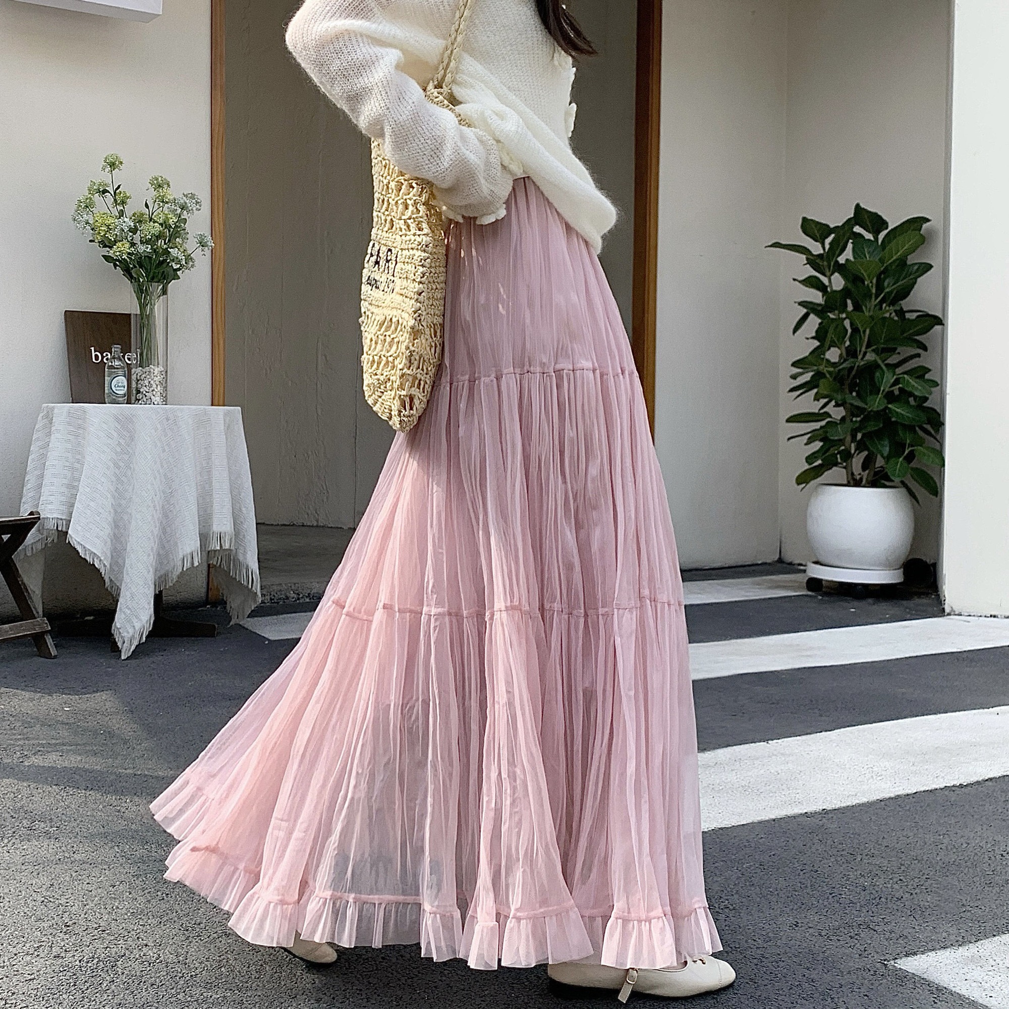핑크색 망사 플리츠 반신 롱 스커트 여성 봄 2026 새로운 하이웨이스트 슬림해 보이는 한 마디 케이크 드레스 요정 빅 플레어 스커트