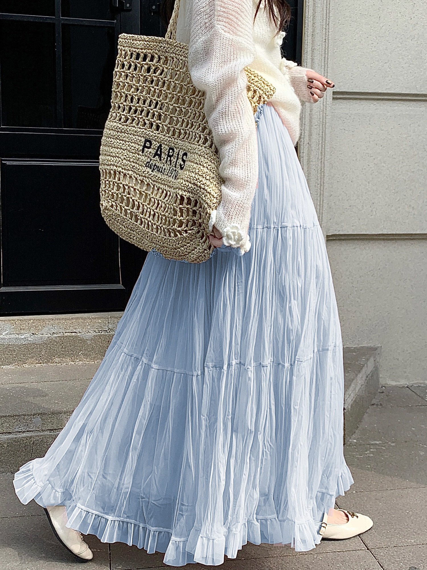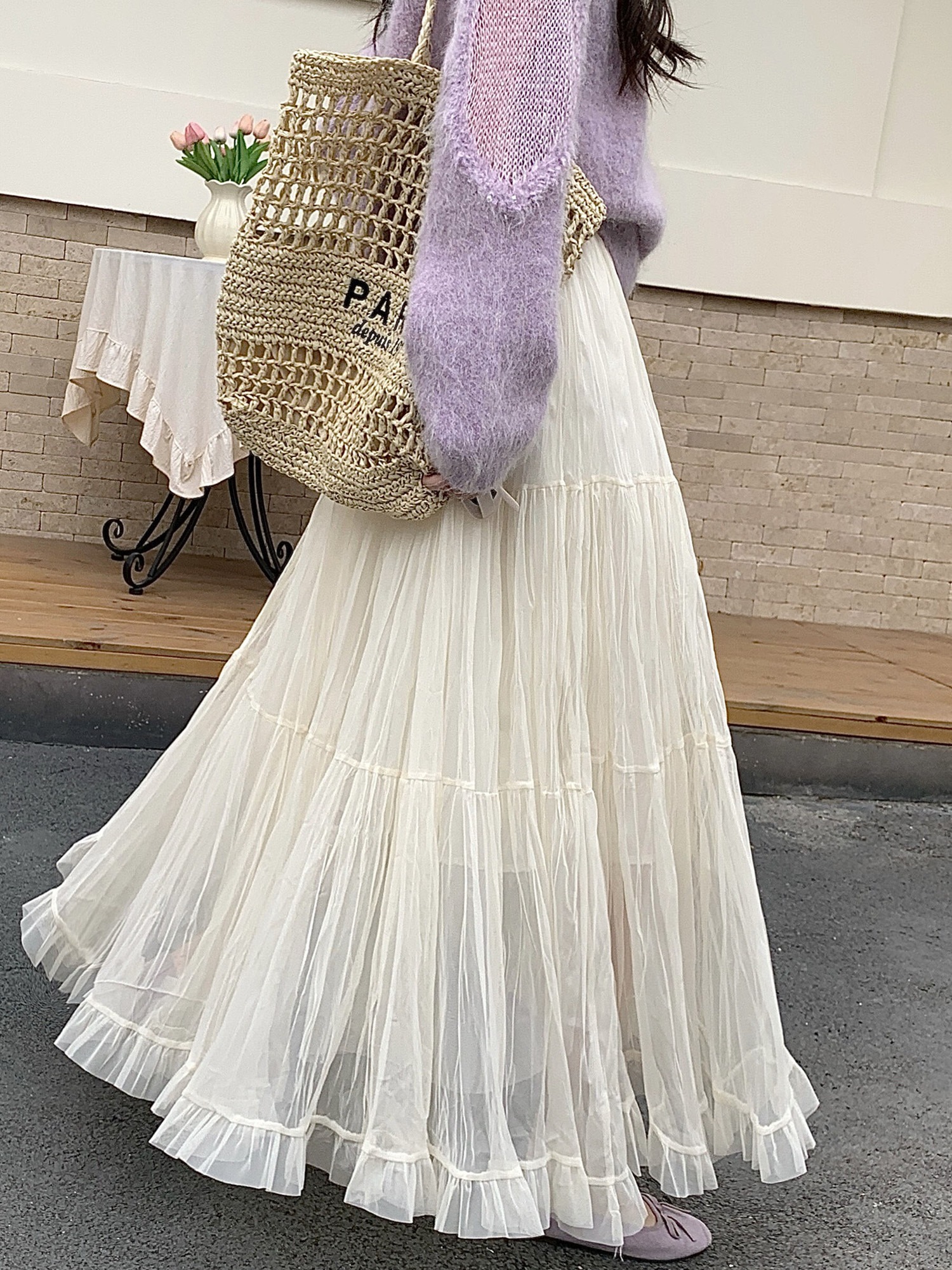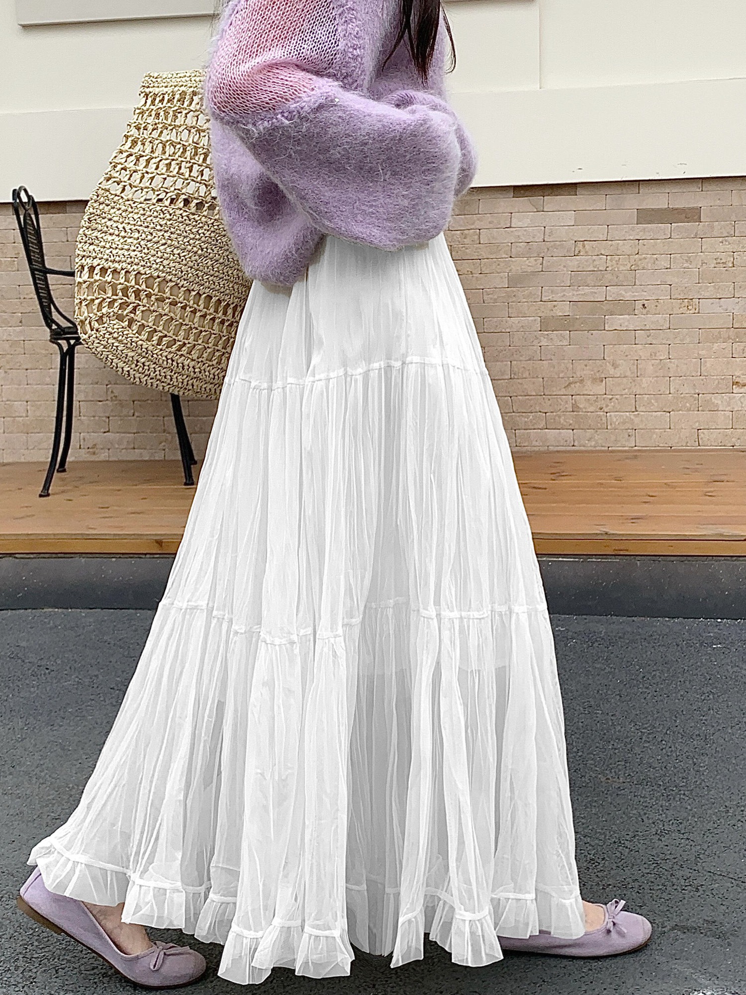 핑크색 망사 플리츠 반신 롱 스커트 여성 봄 2026 새로운 하이웨이스트 슬림해 보이는 한 마디 케이크 드레스 요정 빅 플레어 스커트