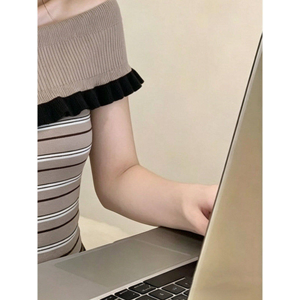달콤한 매운맛 디자인 센스 스트라이프 오프숄더 니트 반팔 티셔츠 여성 여름 몸매 가꾸기 다용도 chic 그레이트 봐. 의류