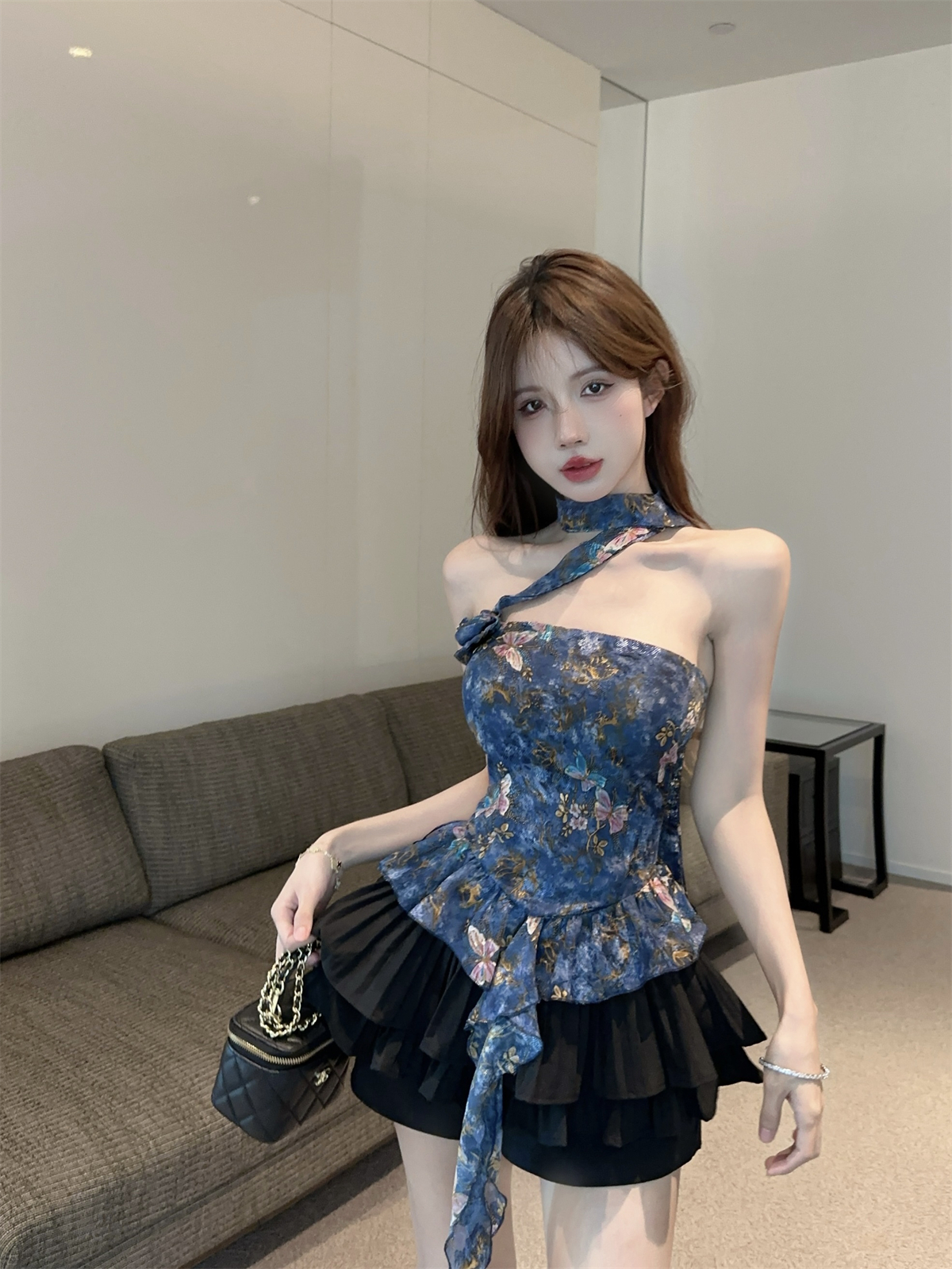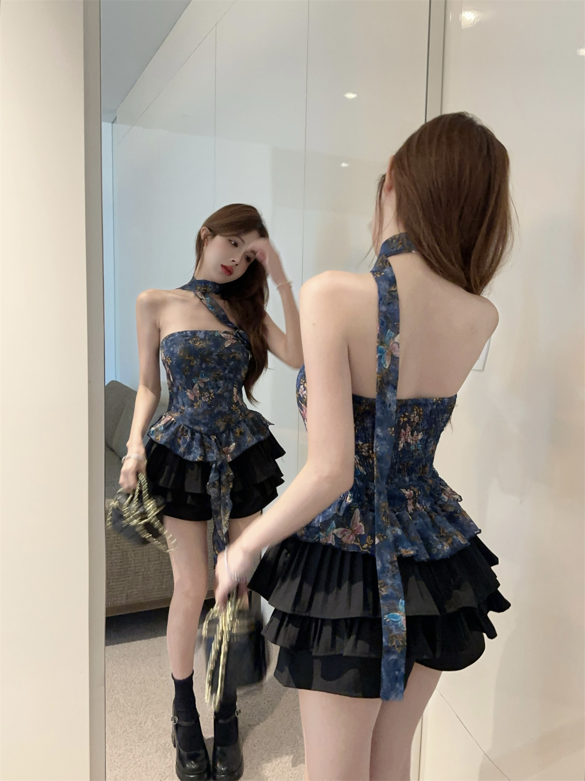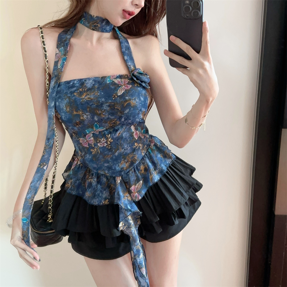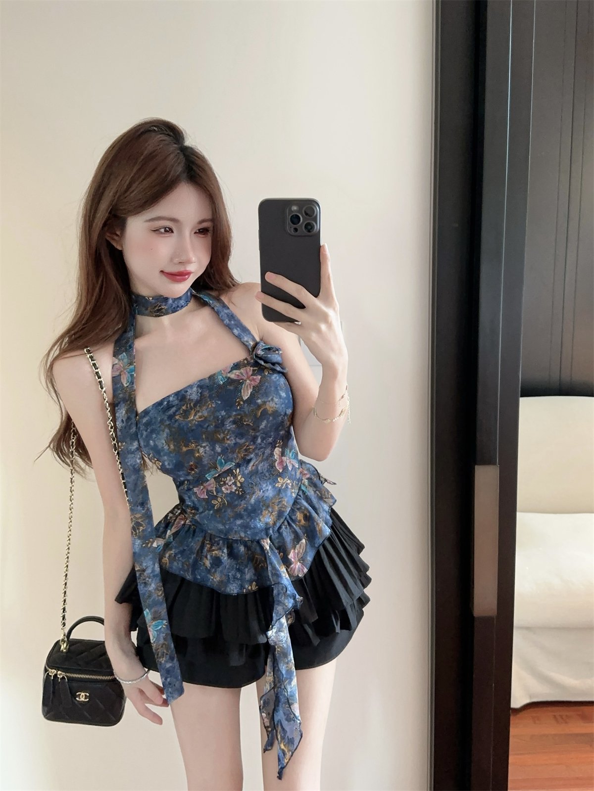실사 정가 Chic 꾸밈음 꽃 달콤한 매운맛 오프숄더 맨위 꽃밭 미니 스커트 한 마디 치마 세트 여성 봄