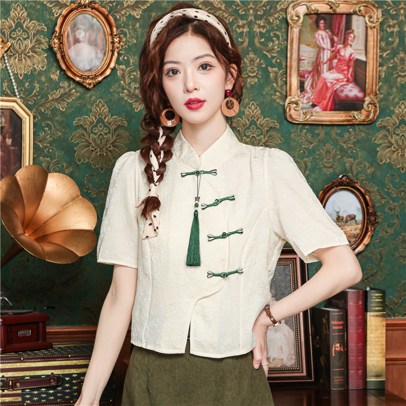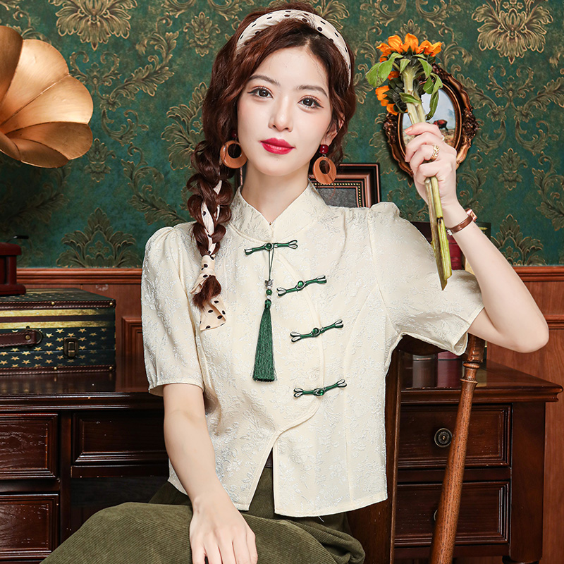 새로운 중식 스탠드 칼라 비즈 박기 술 단추 반팔 여성 셔츠 여름 레트로 국풍 자카드 쉬폰 작은 셔츠 맨위