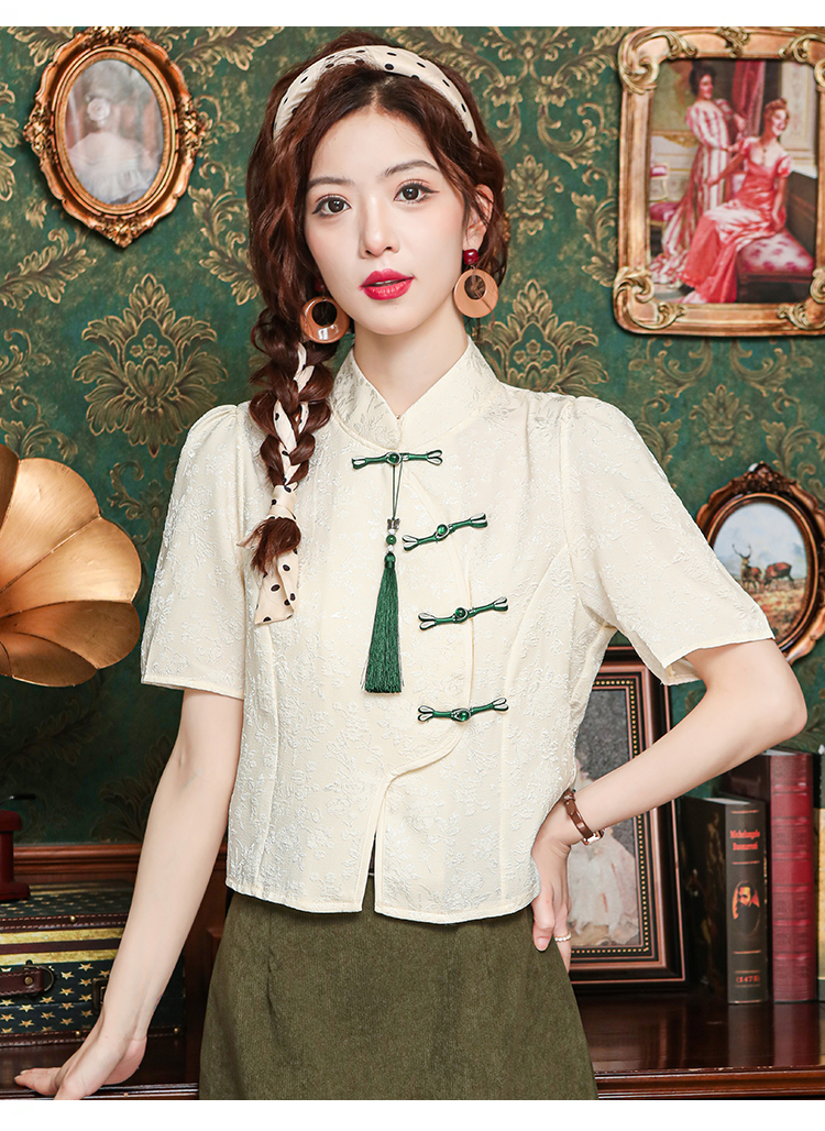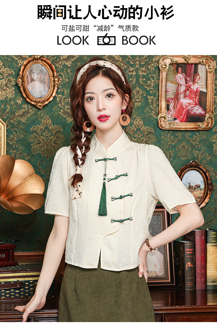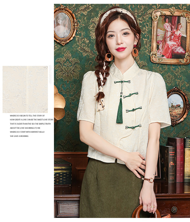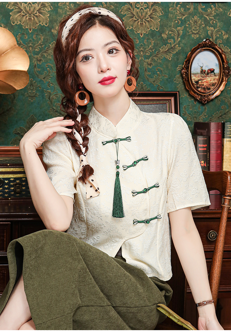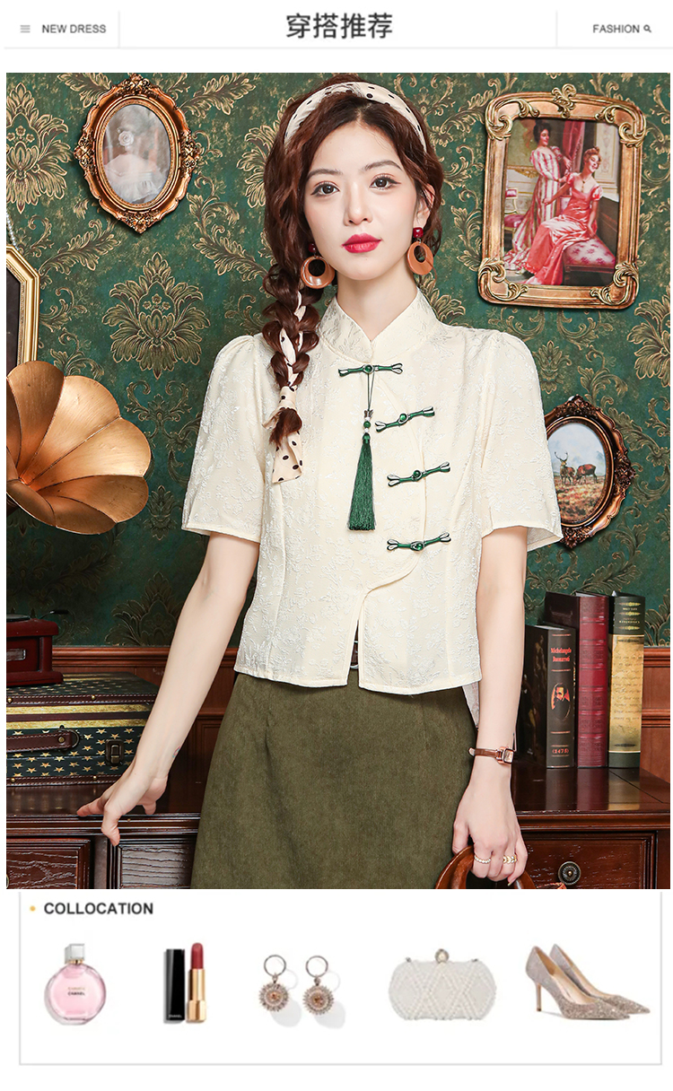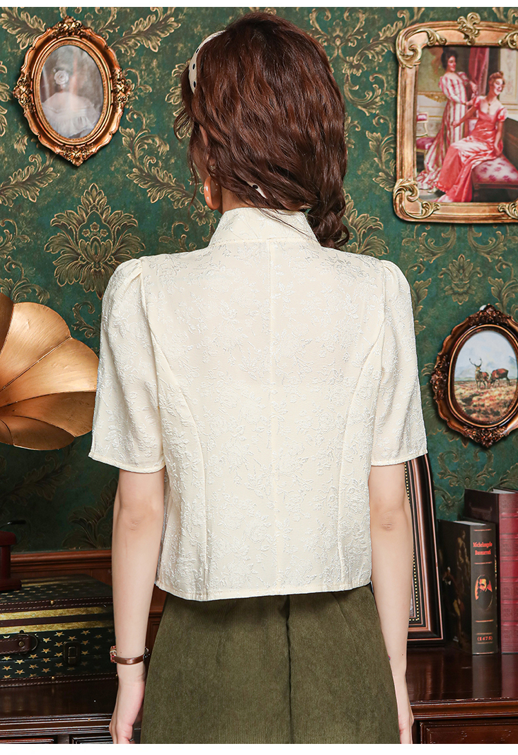 새로운 중식 스탠드 칼라 반팔 여성 셔츠 여름 국풍 레트로 자카드 말 얼굴 치마 맨위 출퇴근 면접 품격 셔츠