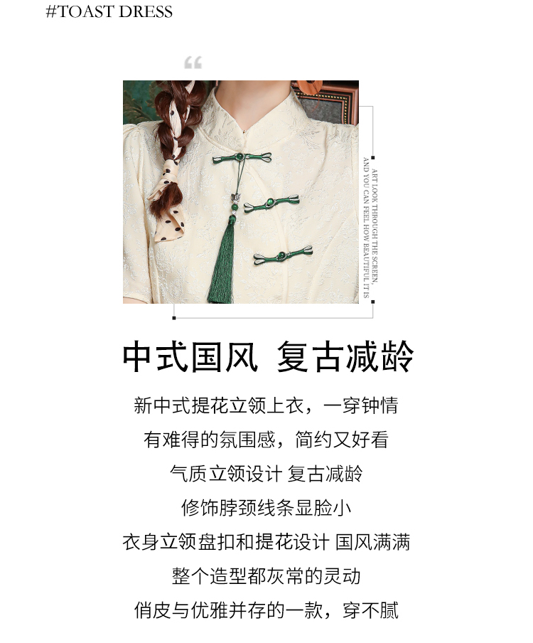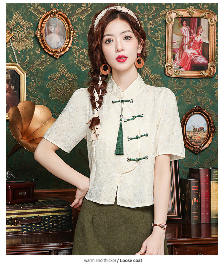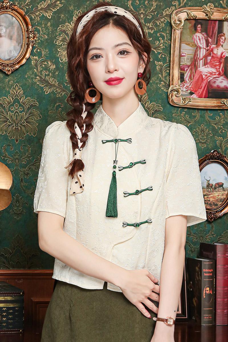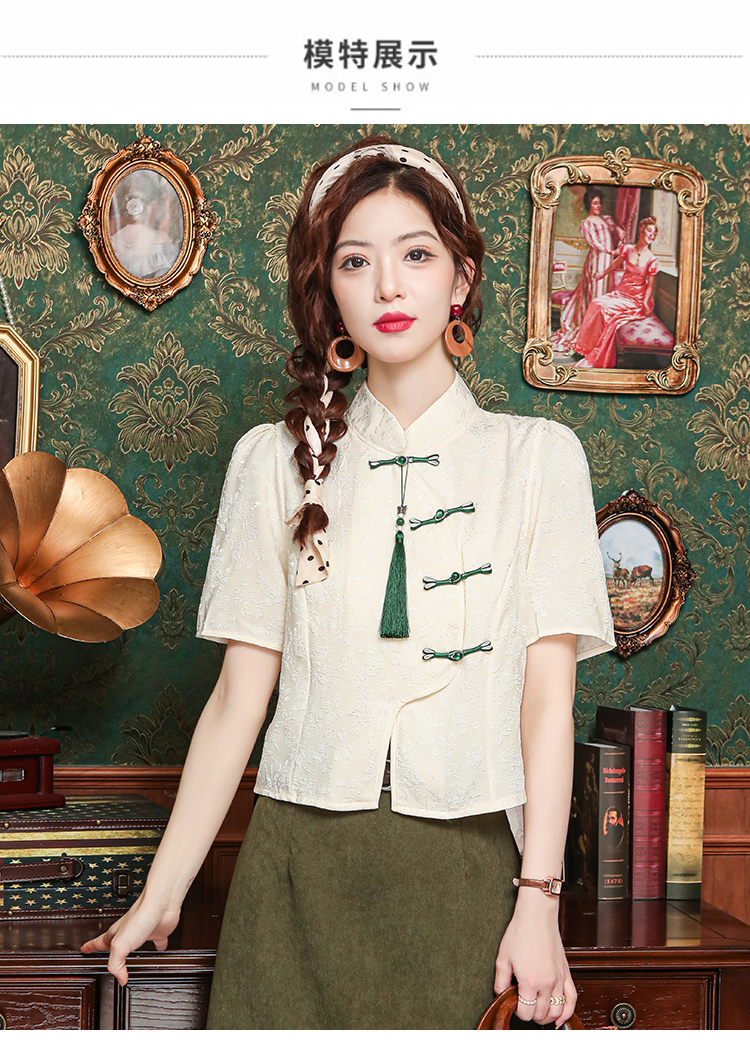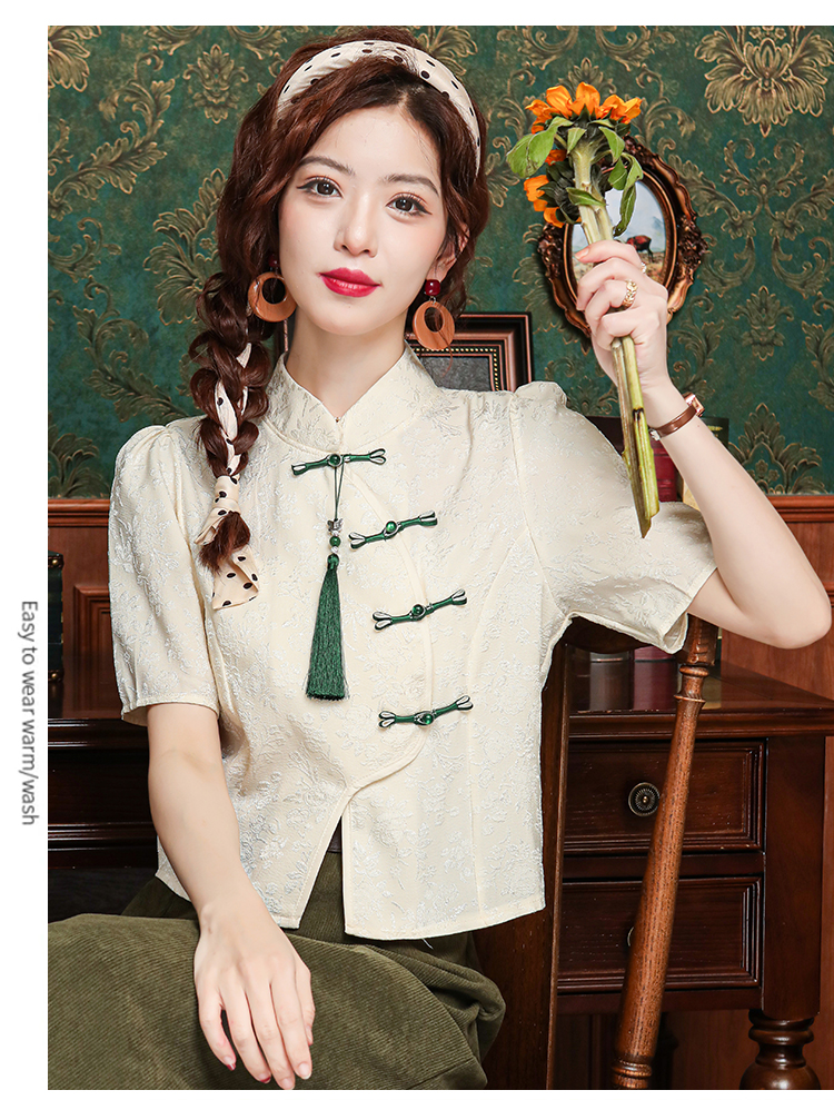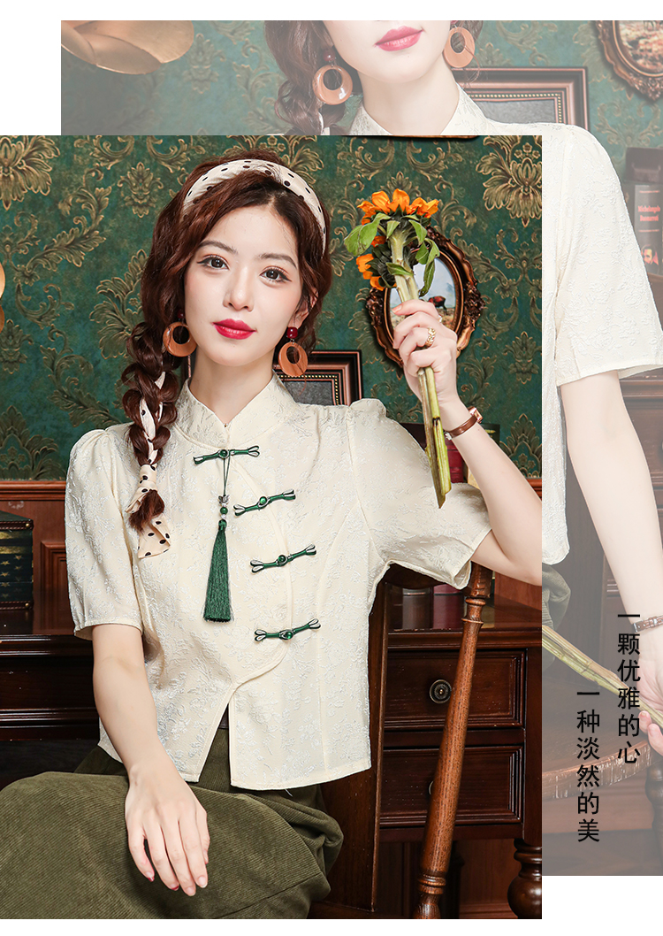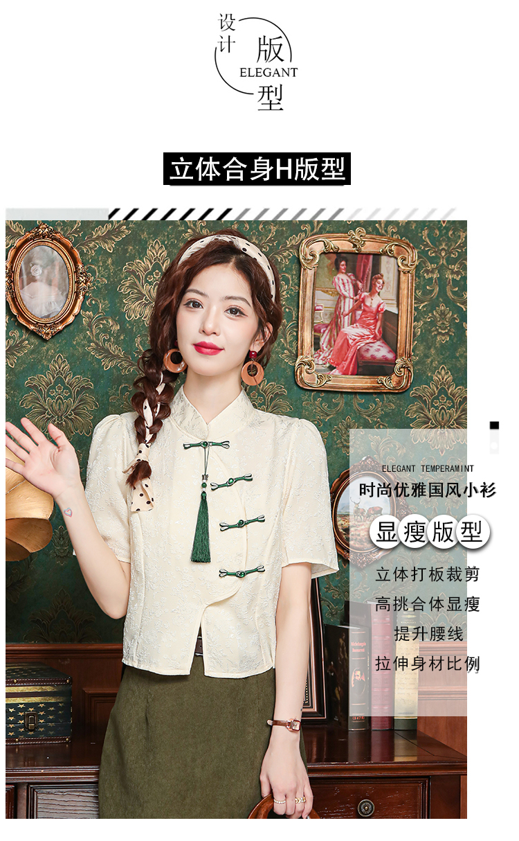 새로운 중식 스탠드 칼라 반팔 여성 셔츠 여름 국풍 레트로 자카드 말 얼굴 치마 맨위 출퇴근 면접 품격 셔츠