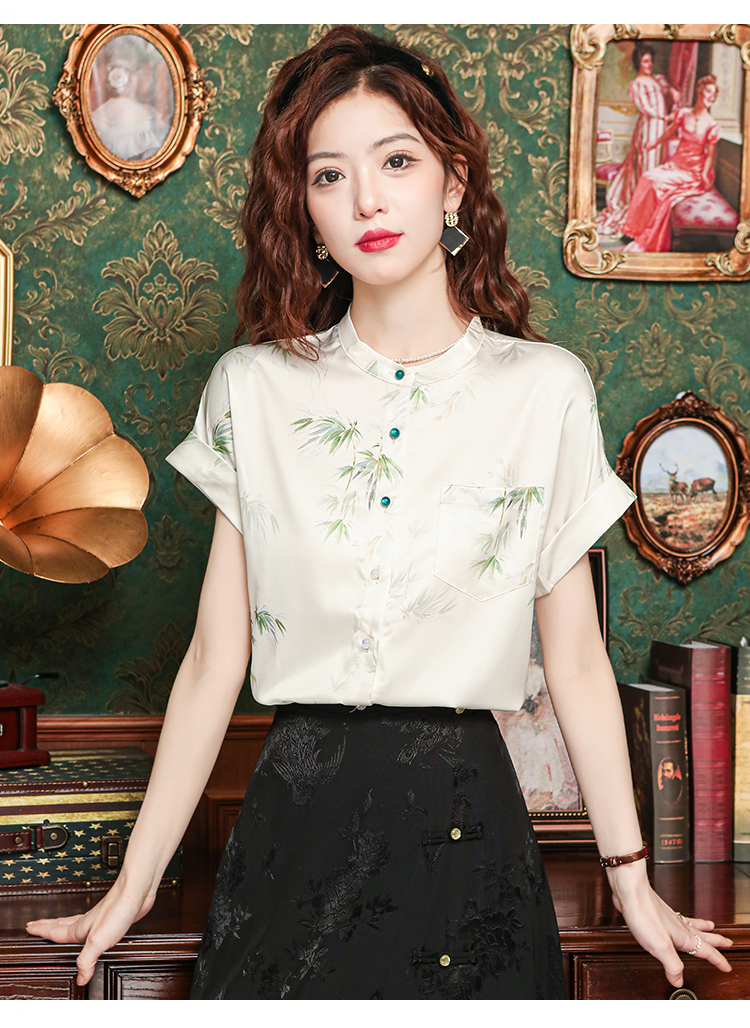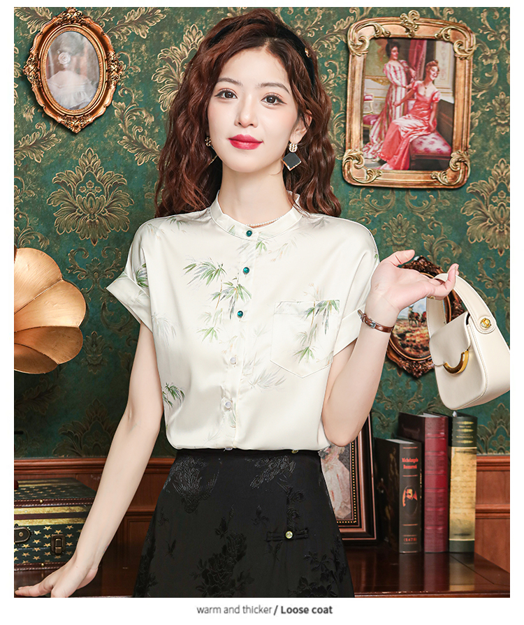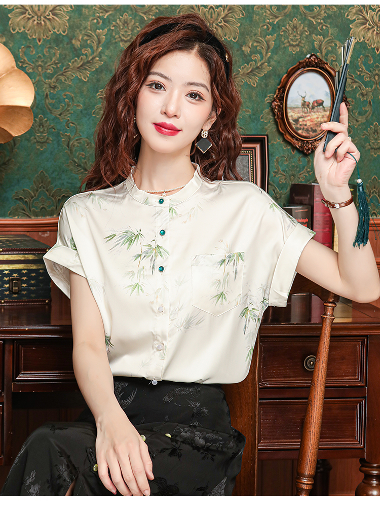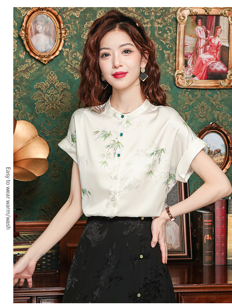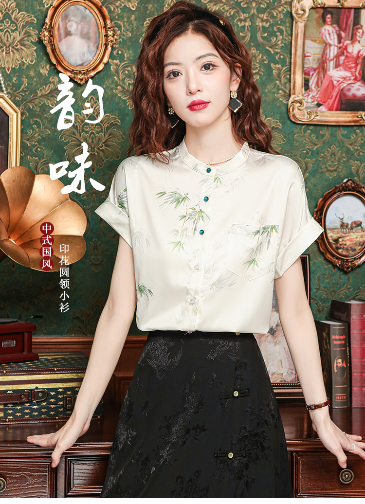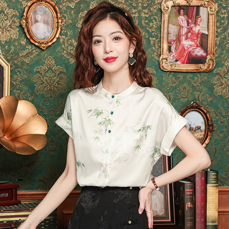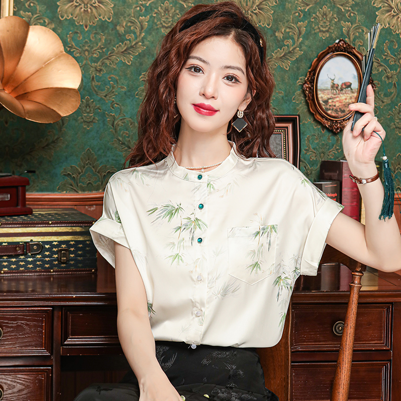 새로운 중식 국풍 프린트 여성 셔츠 2026 여름 새로운 스탠드 칼라 반팔 새틴 맨위 연령 감소 아름다운 작은 셔츠