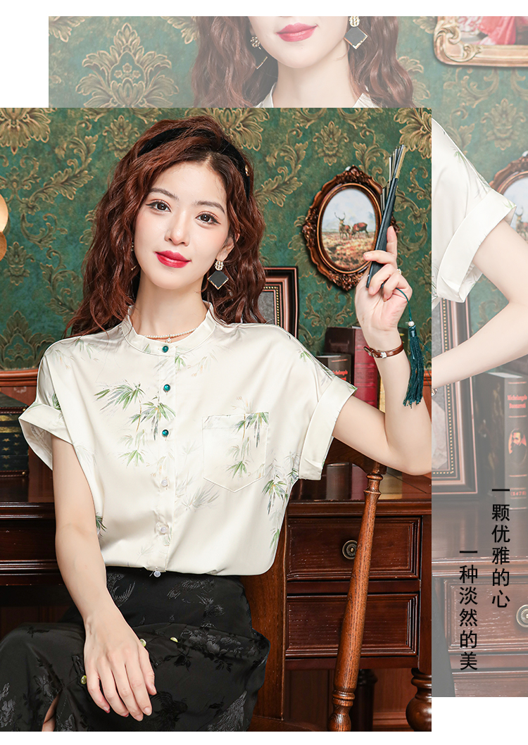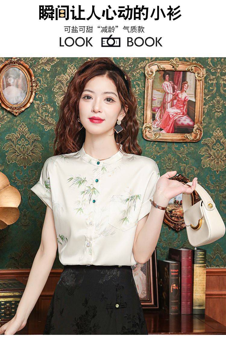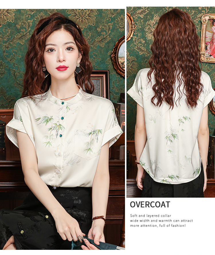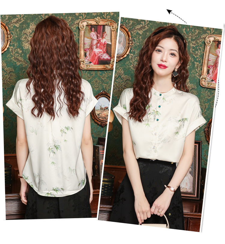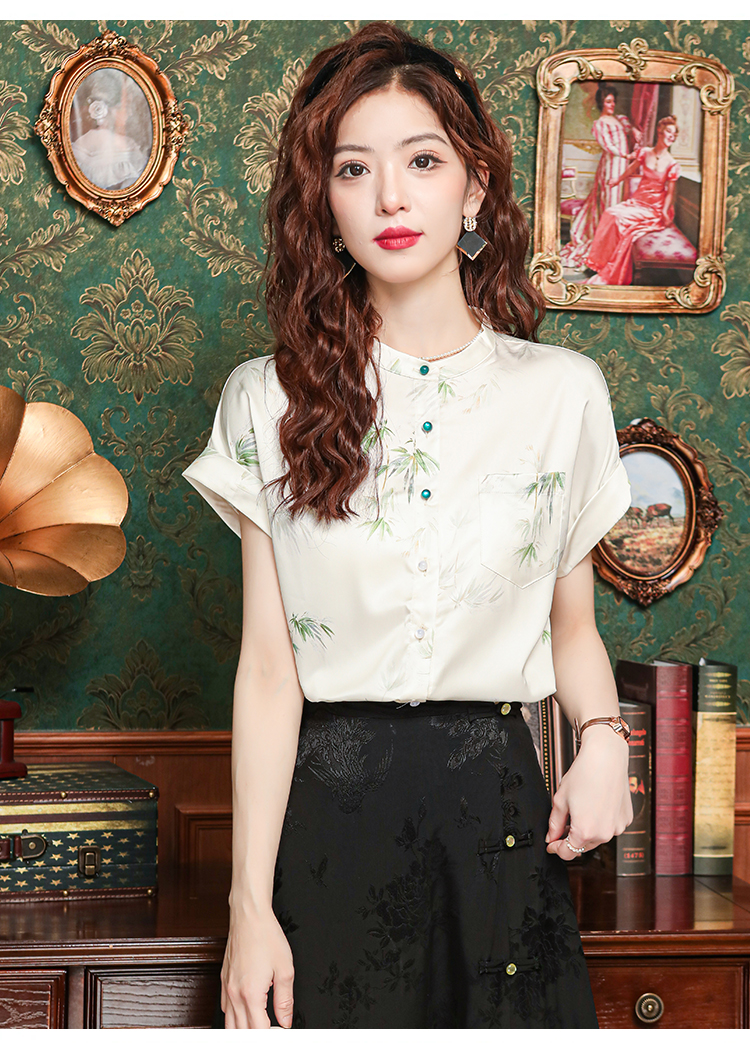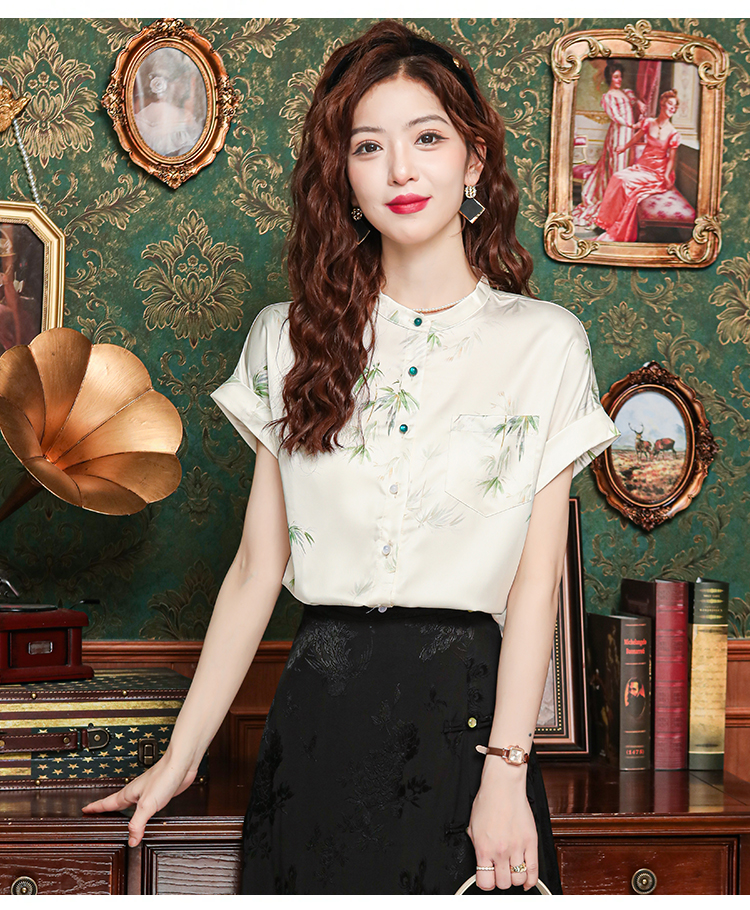 새로운 중식 국풍 프린트 여성 셔츠 2026 여름 새로운 스탠드 칼라 반팔 새틴 맨위 연령 감소 아름다운 작은 셔츠