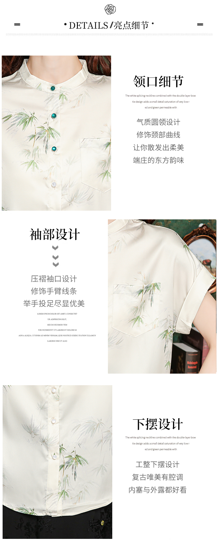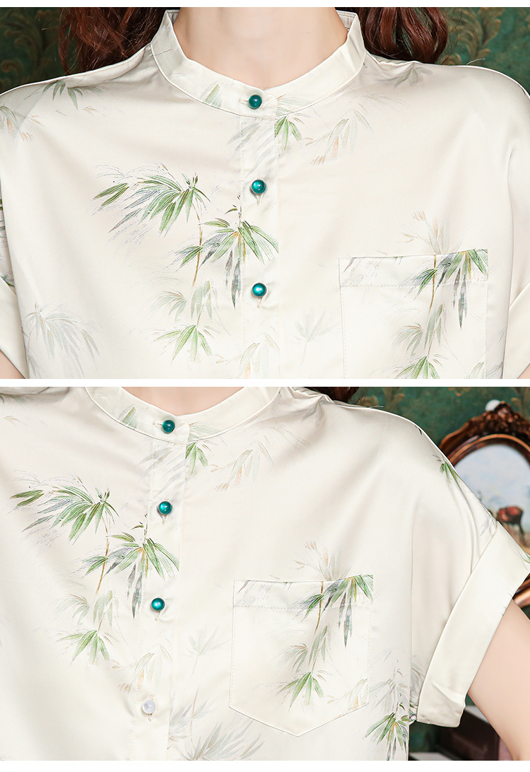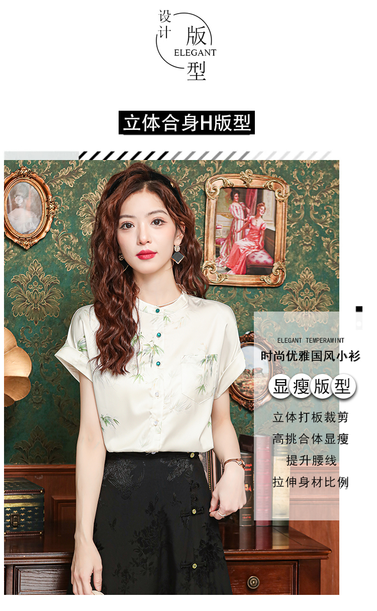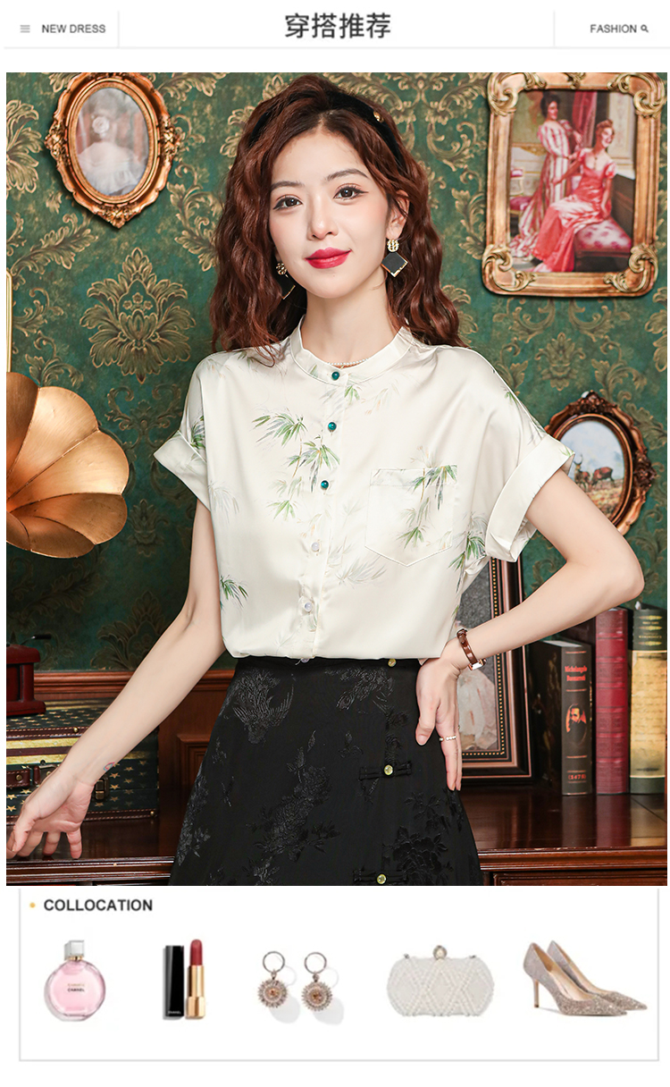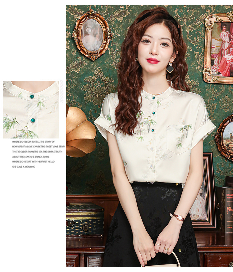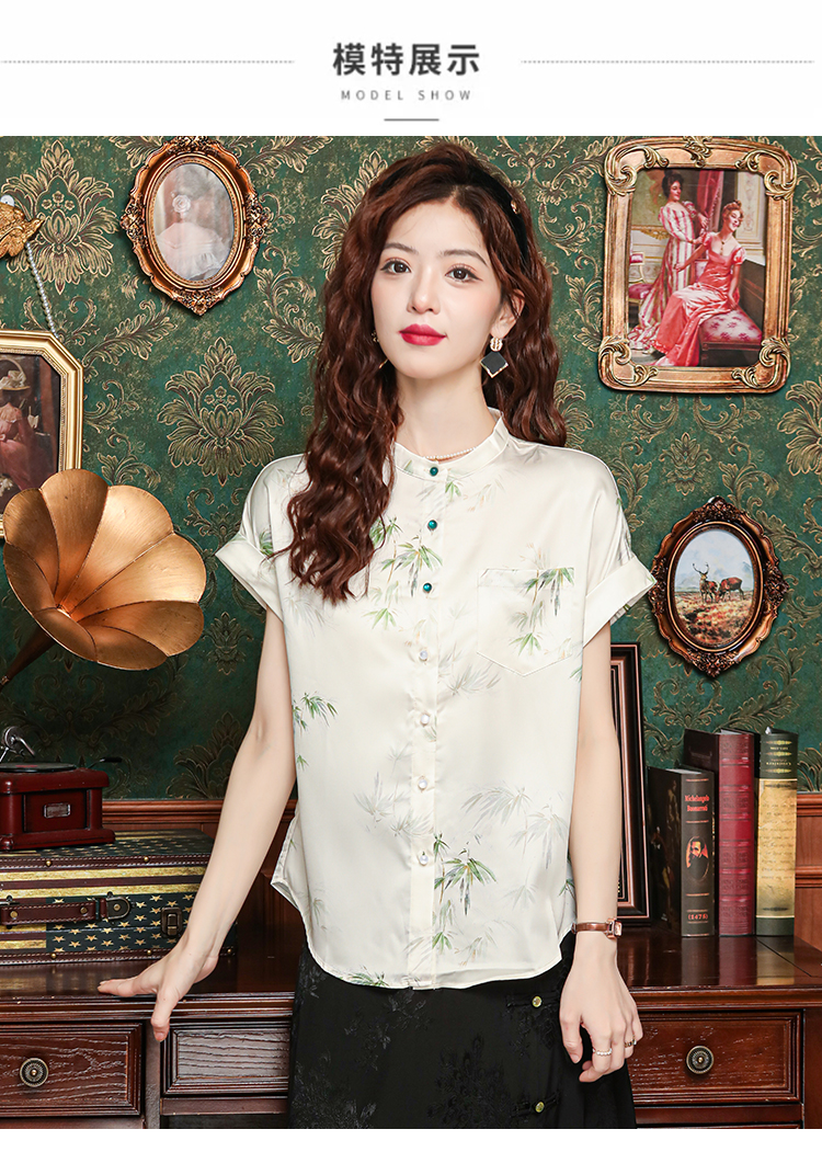 새로운 중식 국풍 프린트 여성 셔츠 2026 여름 새로운 스탠드 칼라 반팔 새틴 맨위 연령 감소 아름다운 작은 셔츠