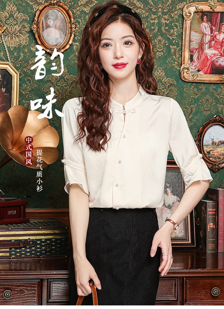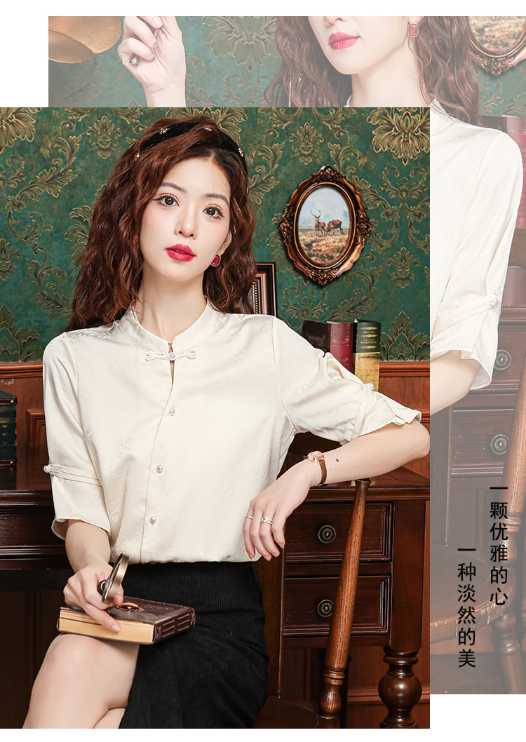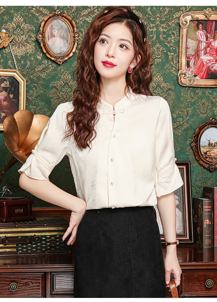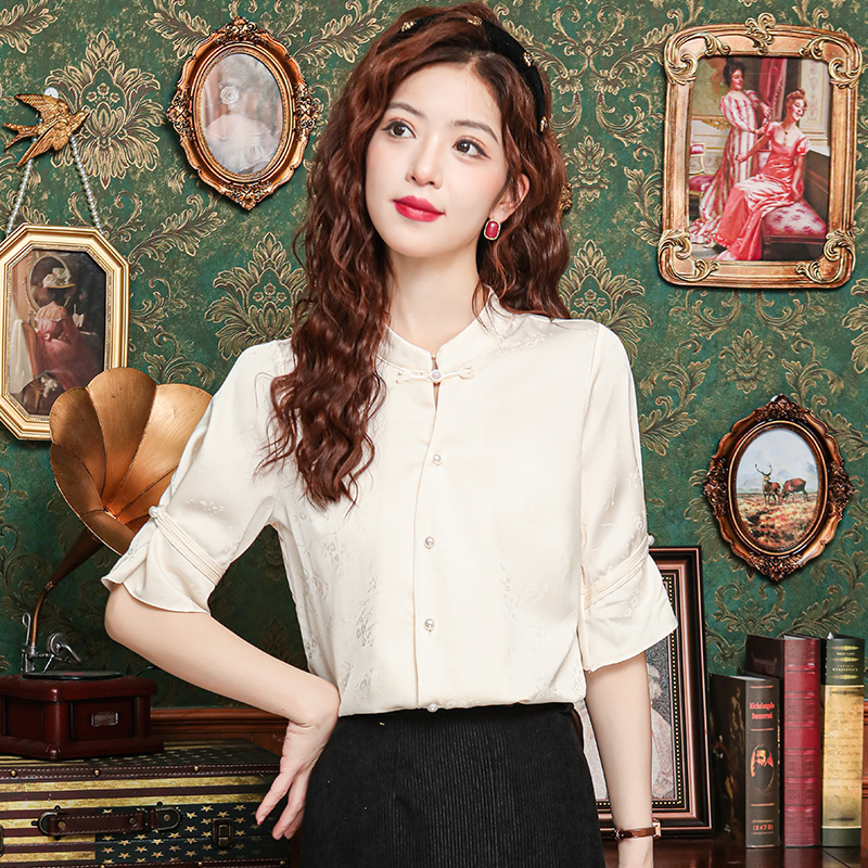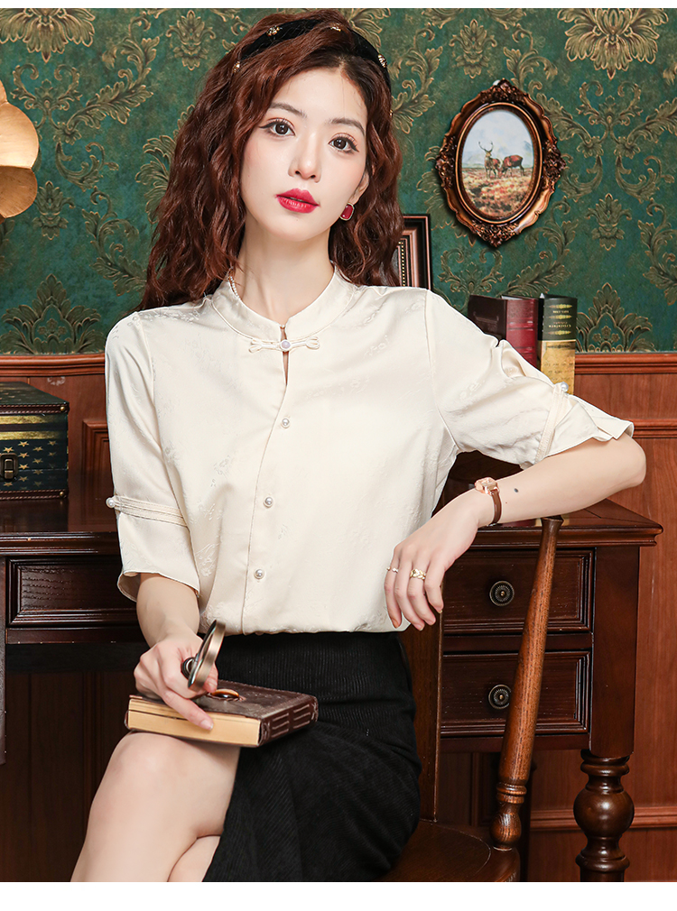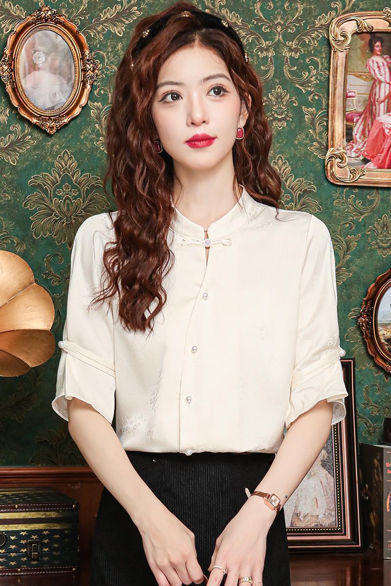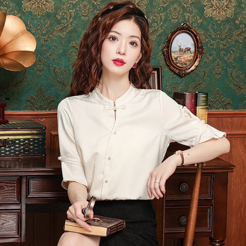 새로운 중식 스탠드 칼라 반팔 여성 셔츠 여름 국풍 레트로 자카드 말 얼굴 치마 맨위 출퇴근 면접 품격 셔츠