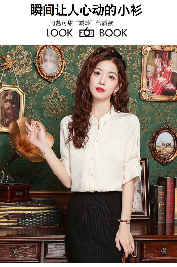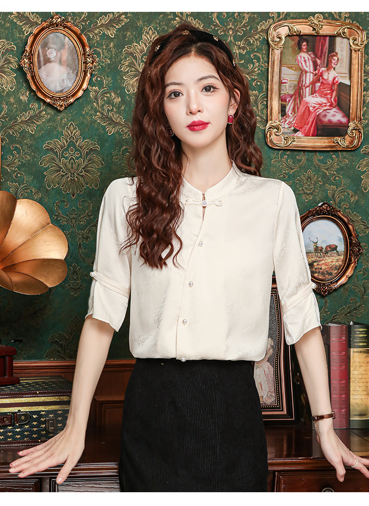 레트로 새로운 중식 자카드 단추 스탠드 칼라 새틴 여성 셔츠 2026 여름 새로운 국풍 작은 대중 반팔 맨위