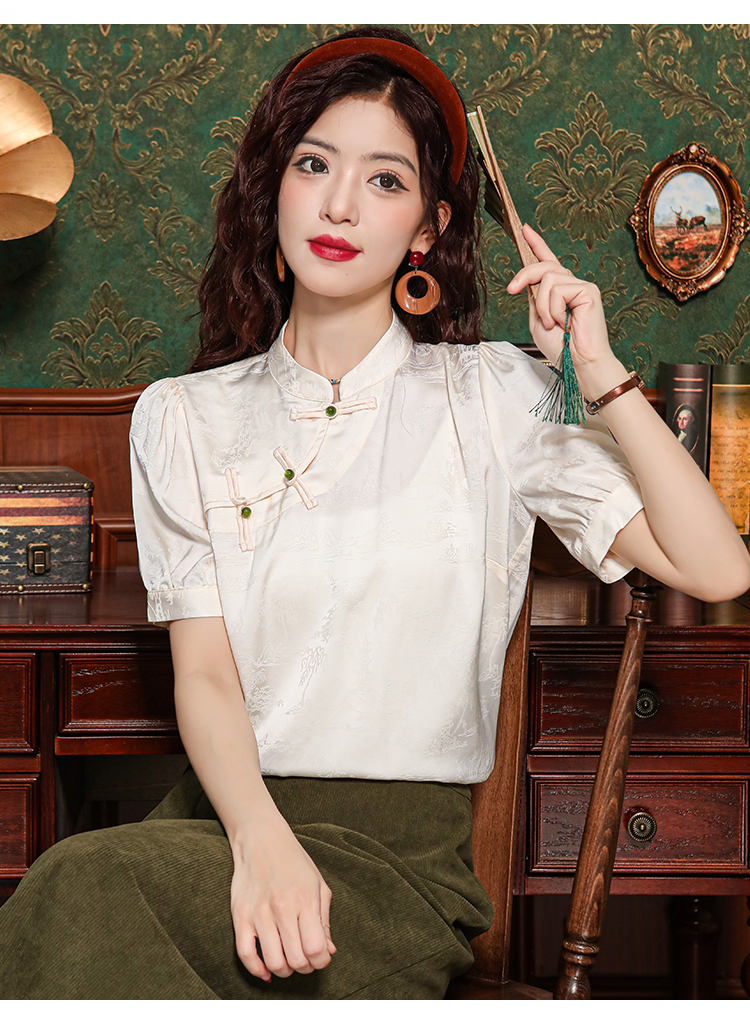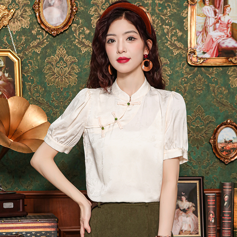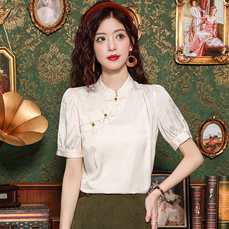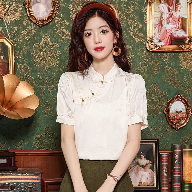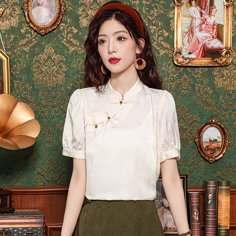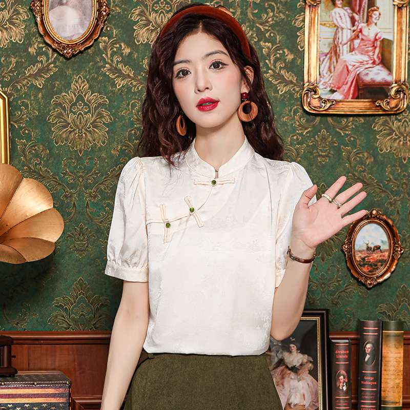 레트로 새로운 중식 자카드 단추 스탠드 칼라 새틴 여성 셔츠 2026 여름 새로운 국풍 작은 대중 반팔 맨위